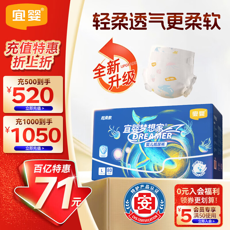 宜婴新梦想家超柔款婴儿尿不湿轻薄透气尿不湿纸尿裤L80片
