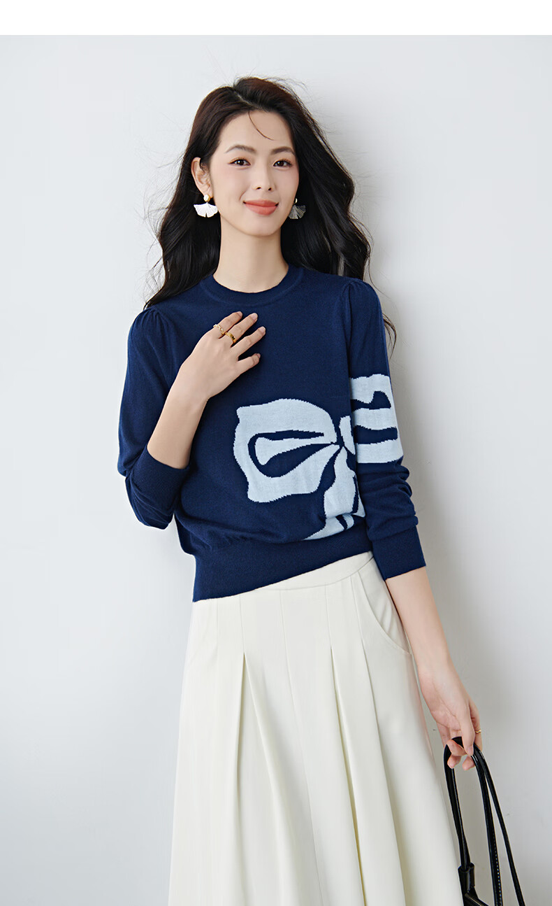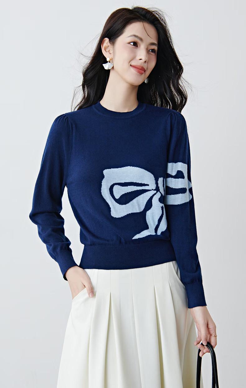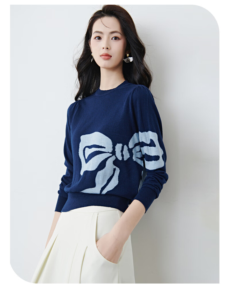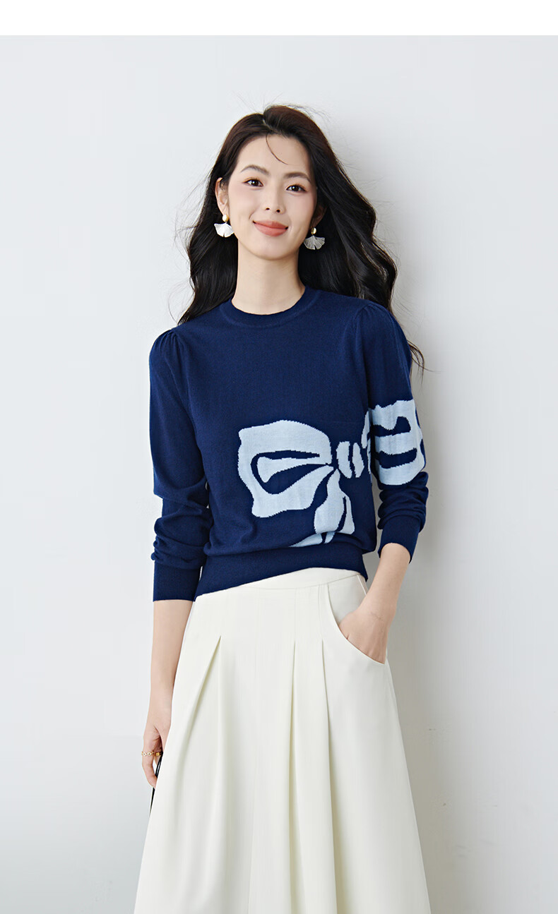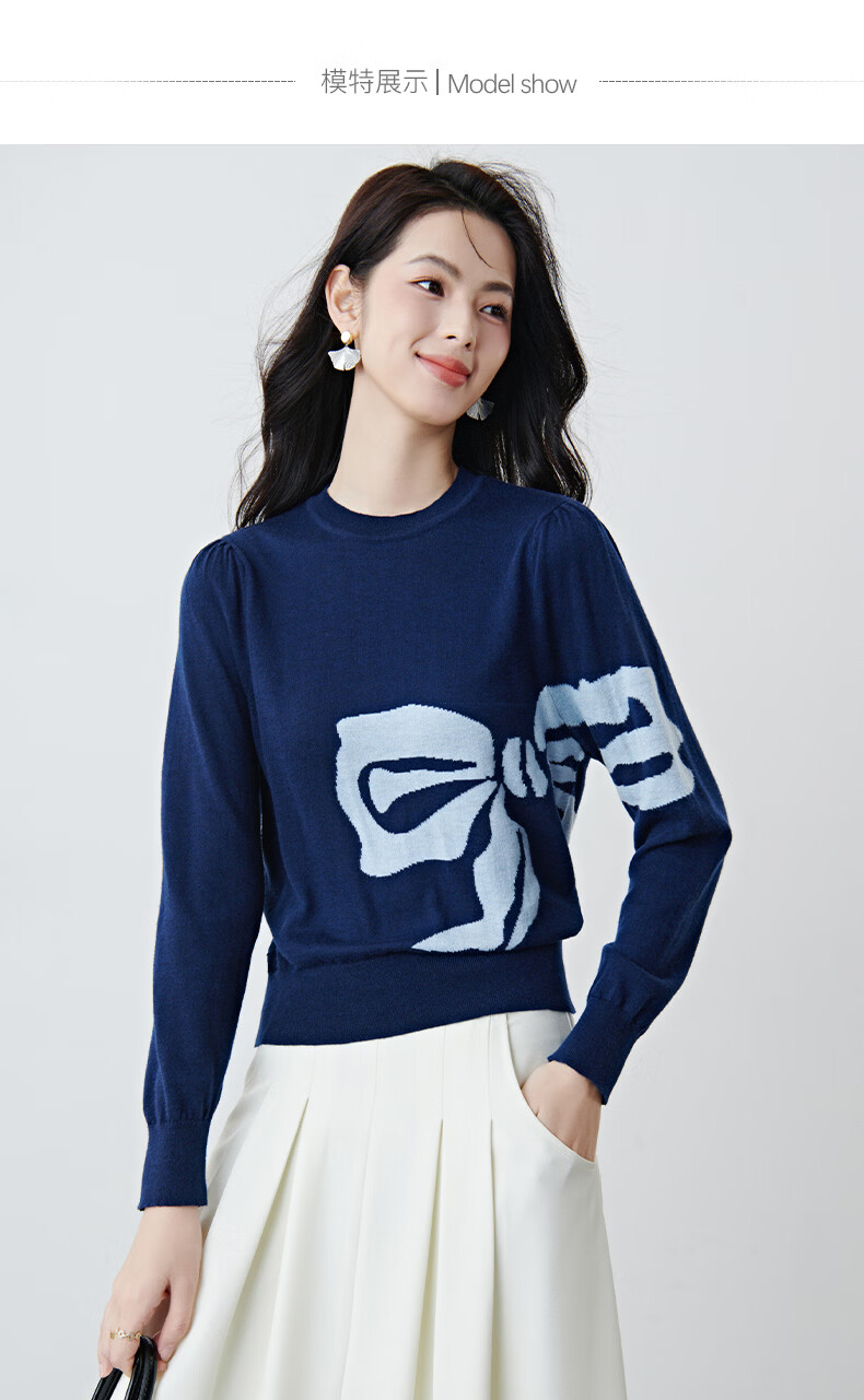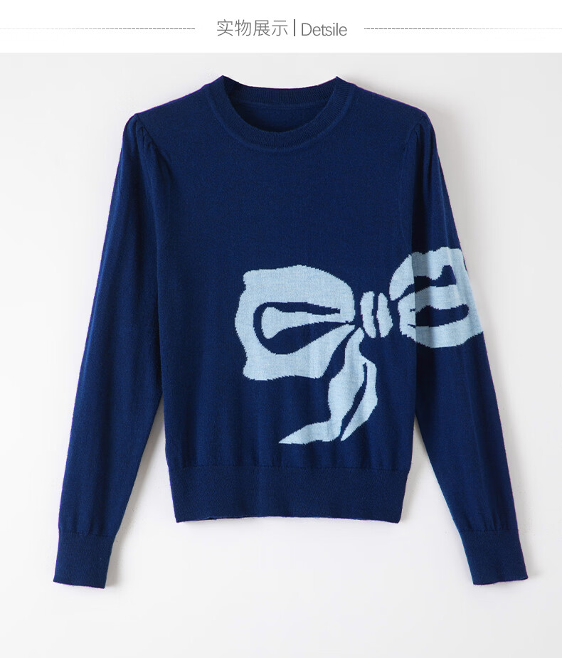 晚白2026春款时尚撞色高温洗烘定型圆领上衣蝴蝶结印花宽松显瘦针织衫 蓝色 L