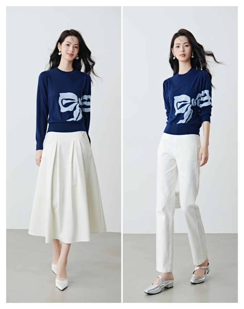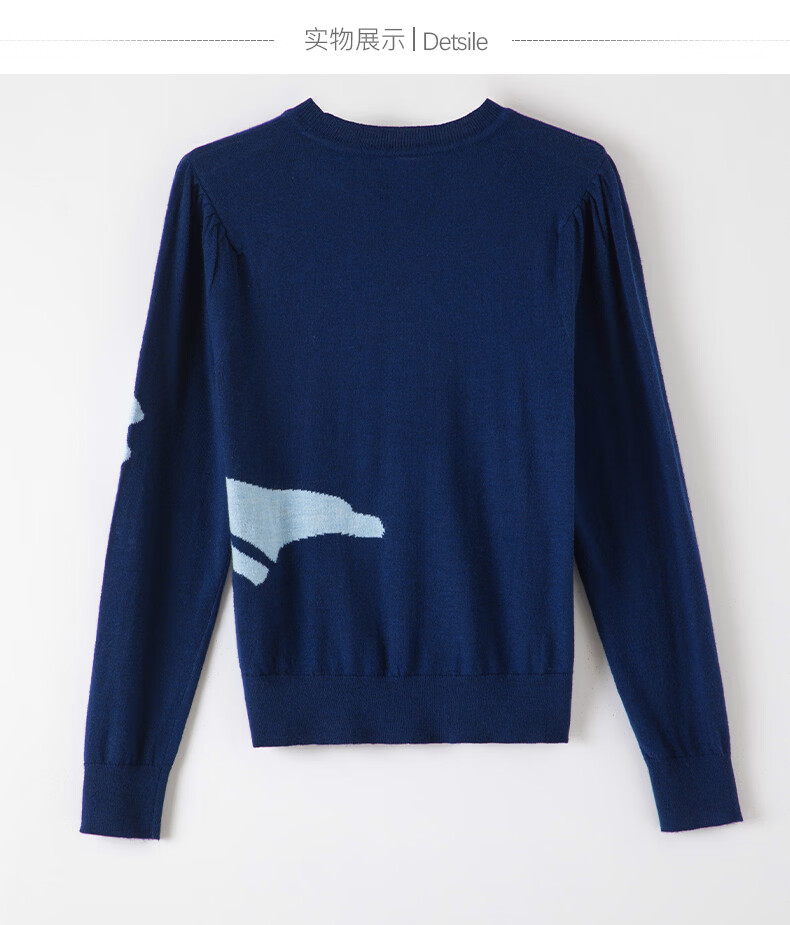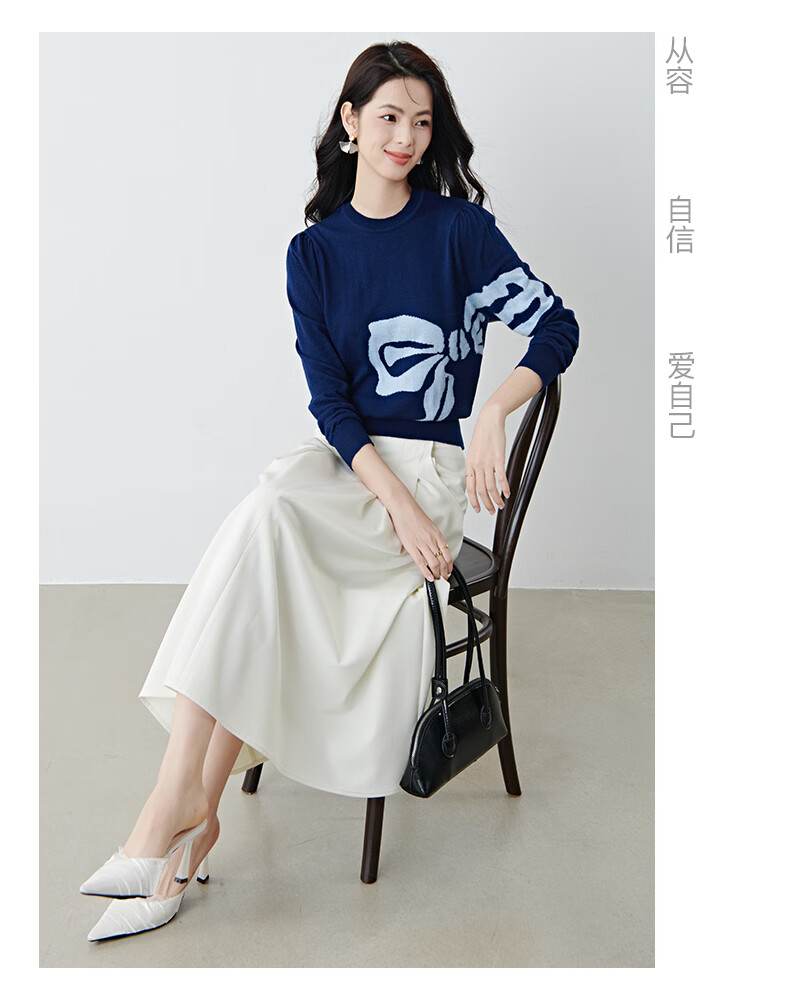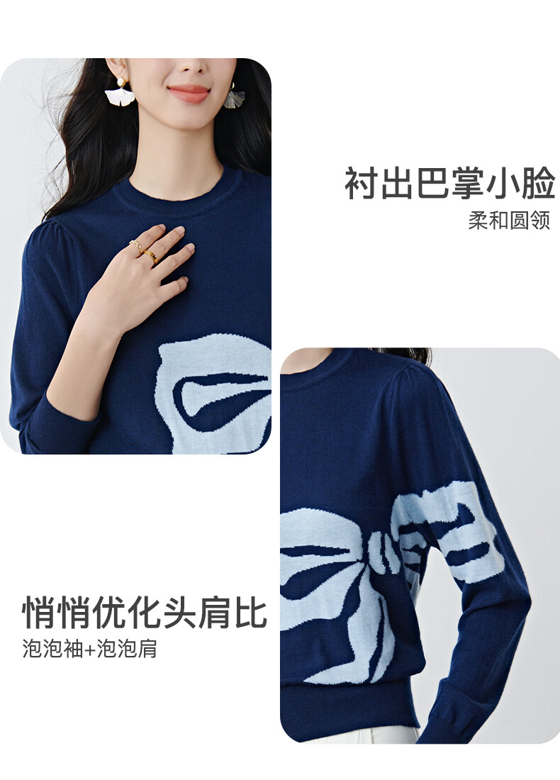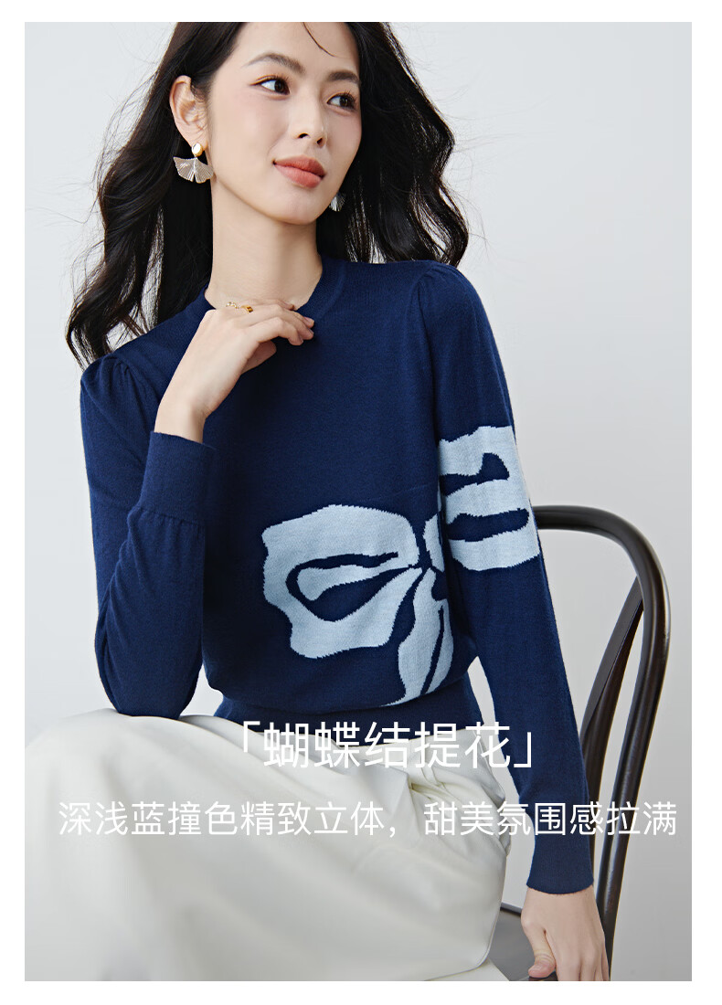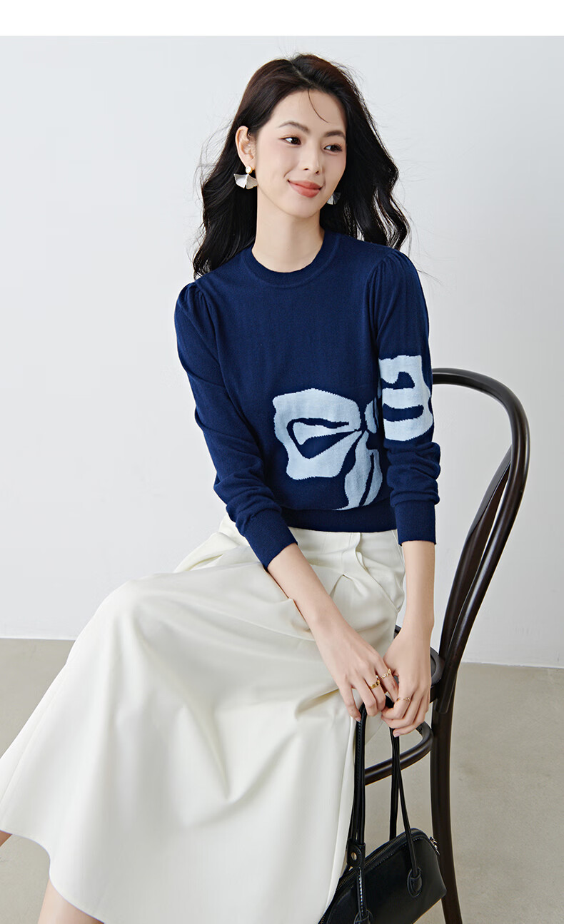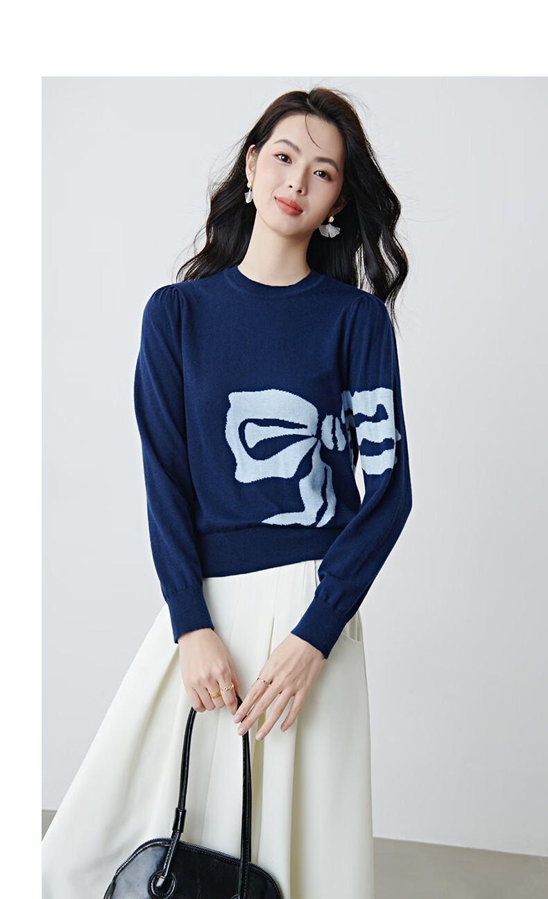 晚白2026春款时尚撞色高温洗烘定型圆领上衣蝴蝶结印花宽松显瘦针织衫 蓝色 L