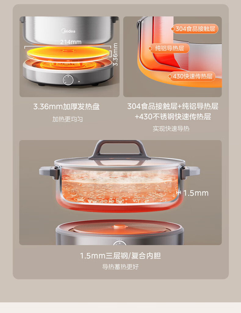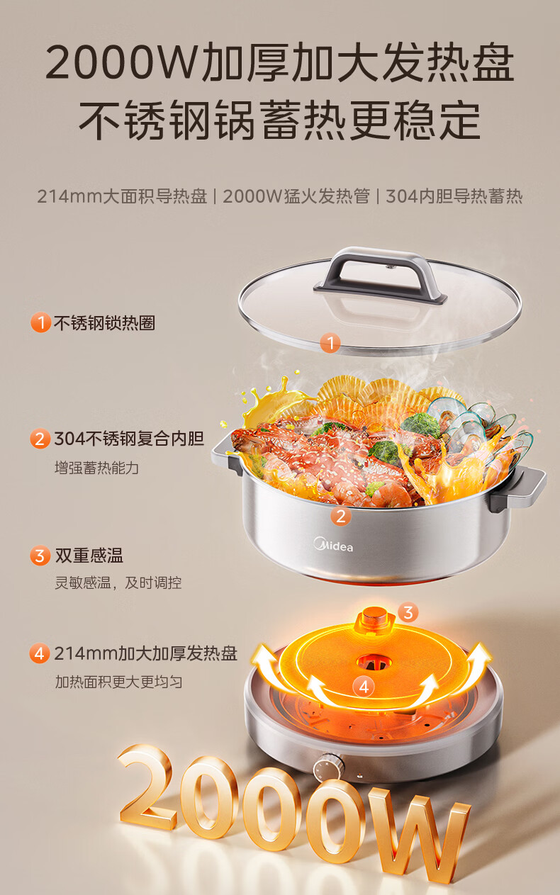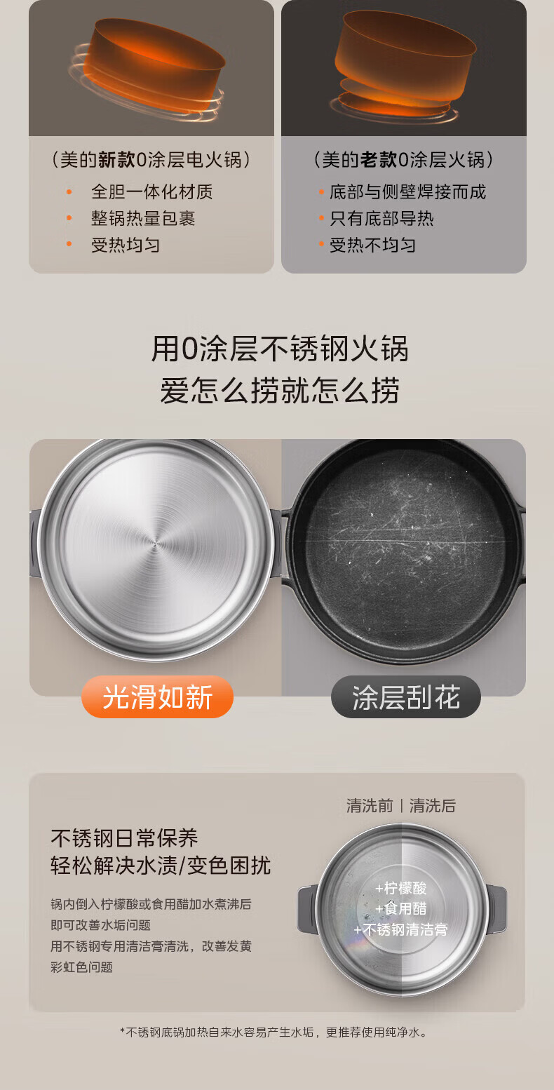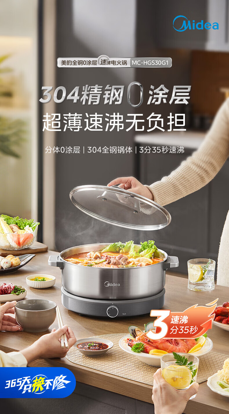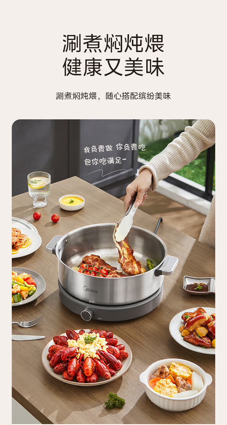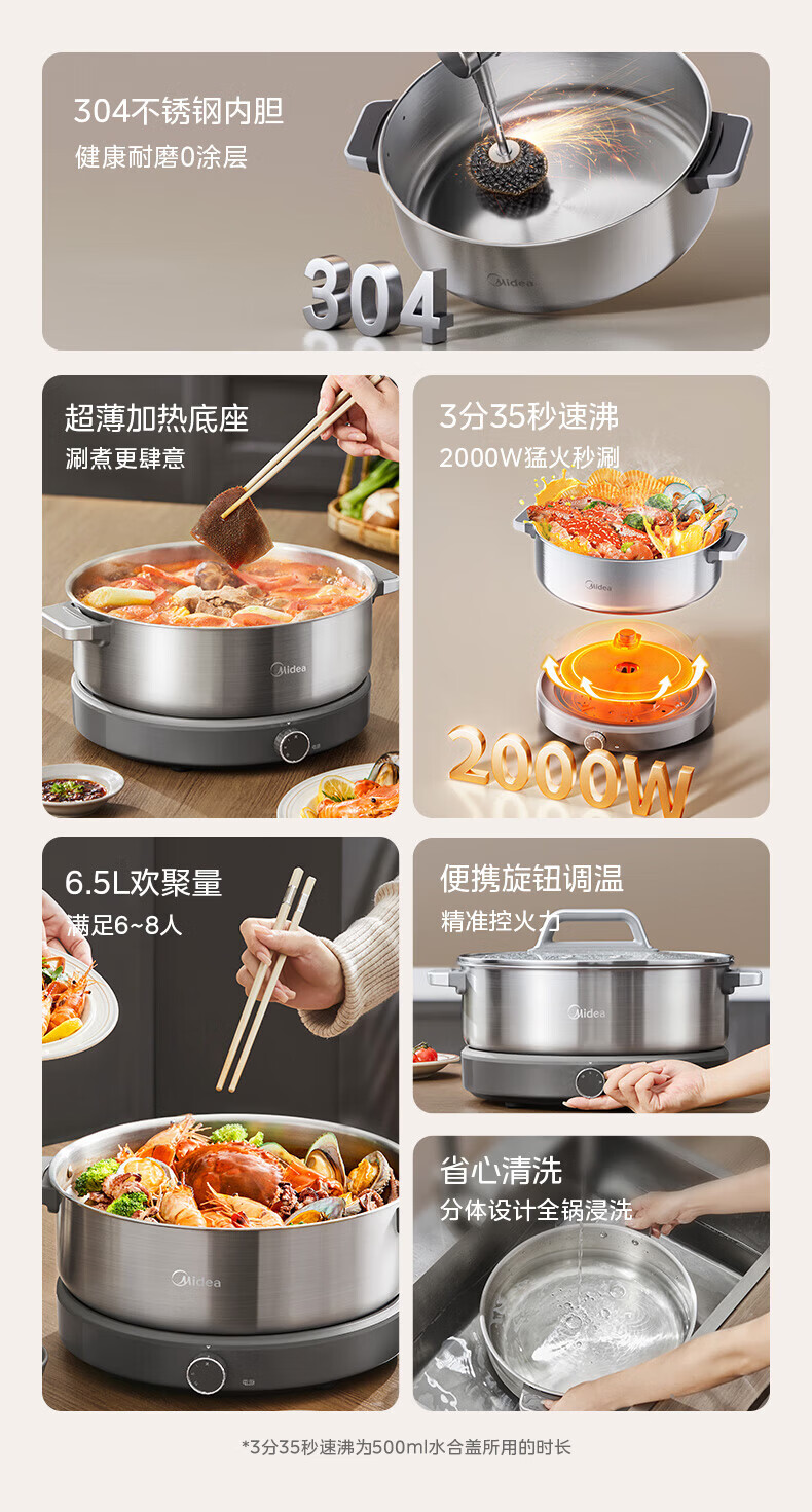 美的(Midea)0涂层电火锅电煮锅不锈钢火锅专用锅分体可拆全钢速沸电火锅电热锅多功能锅6.5L多用途锅HGS30G1