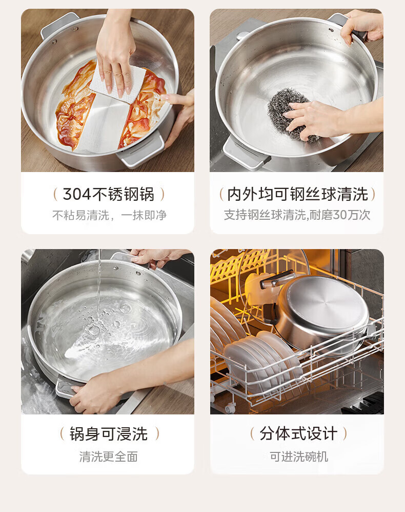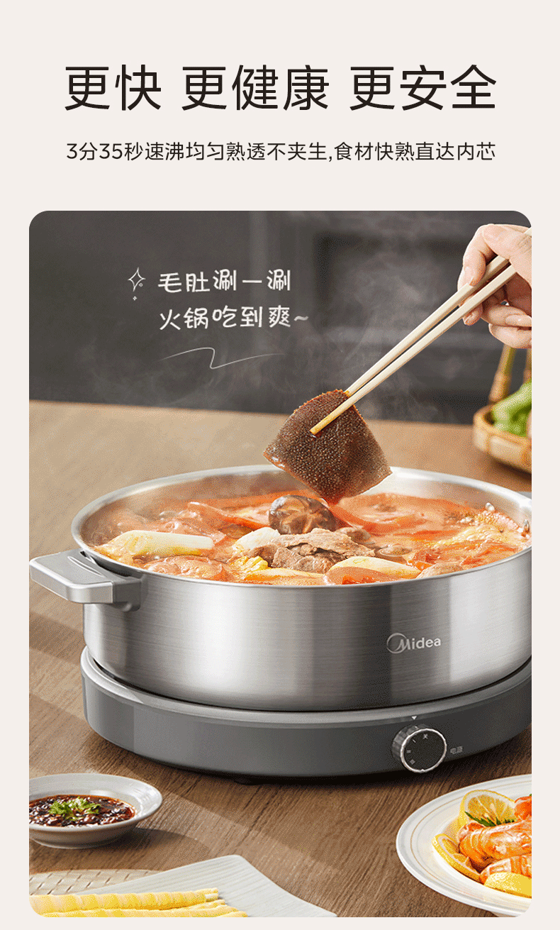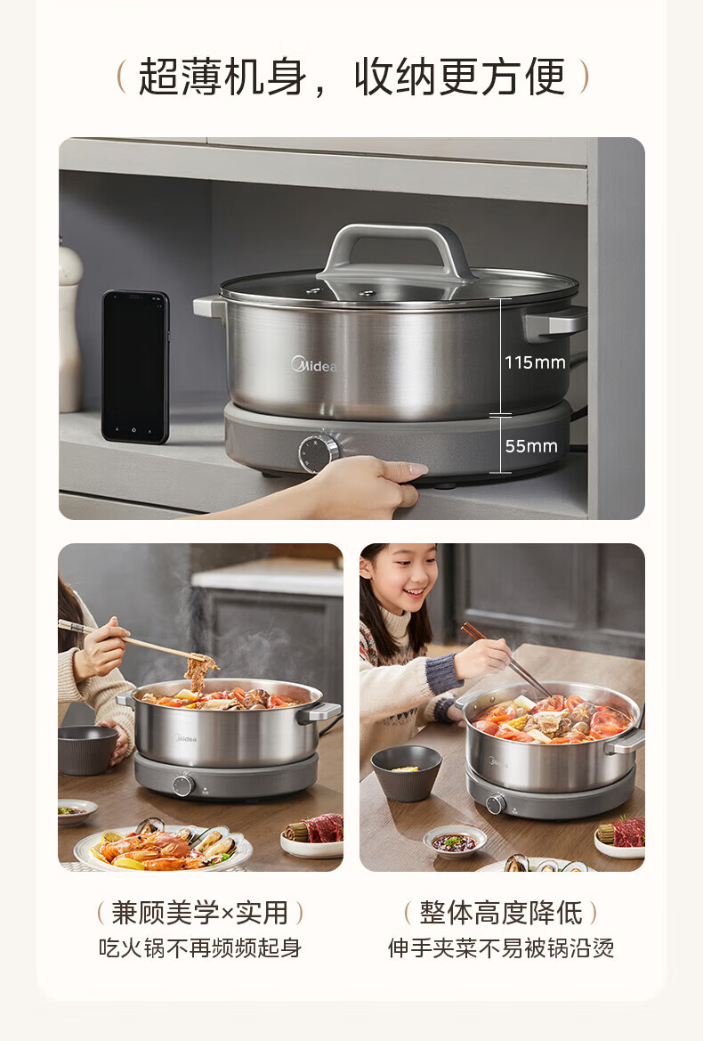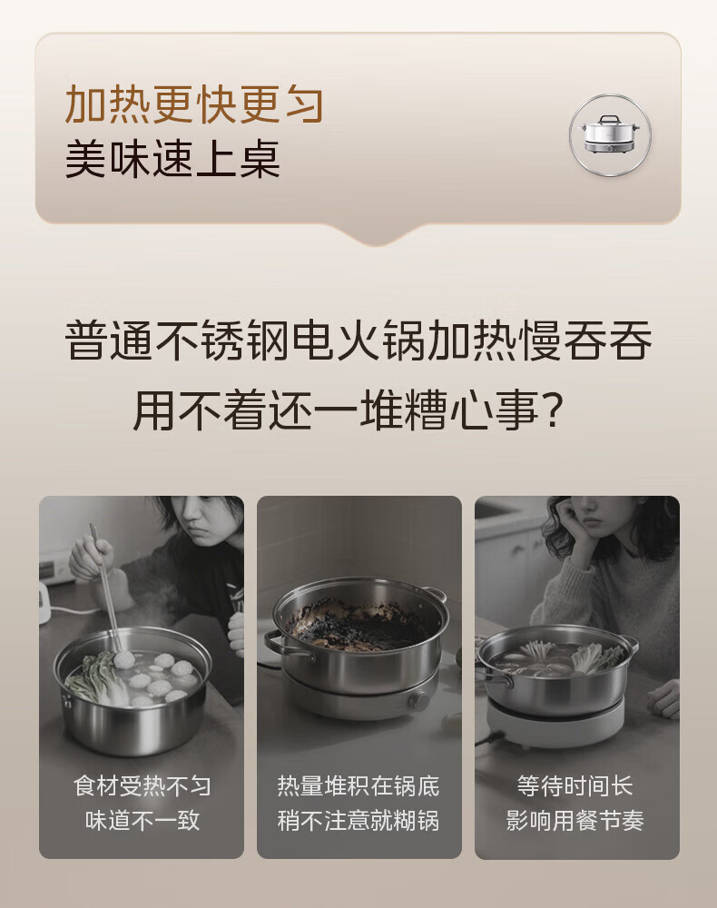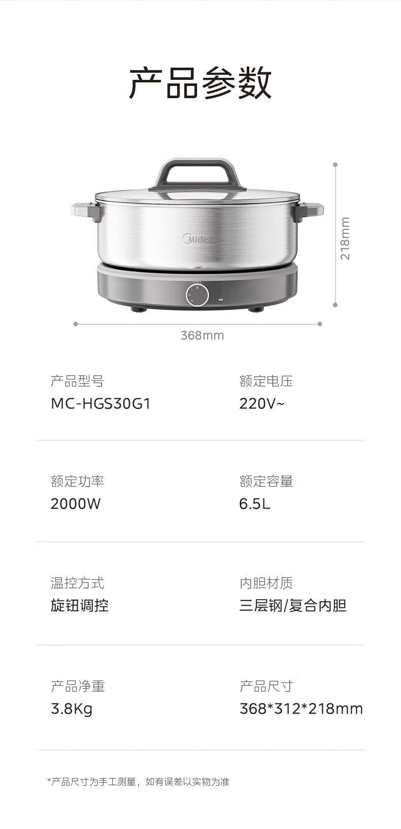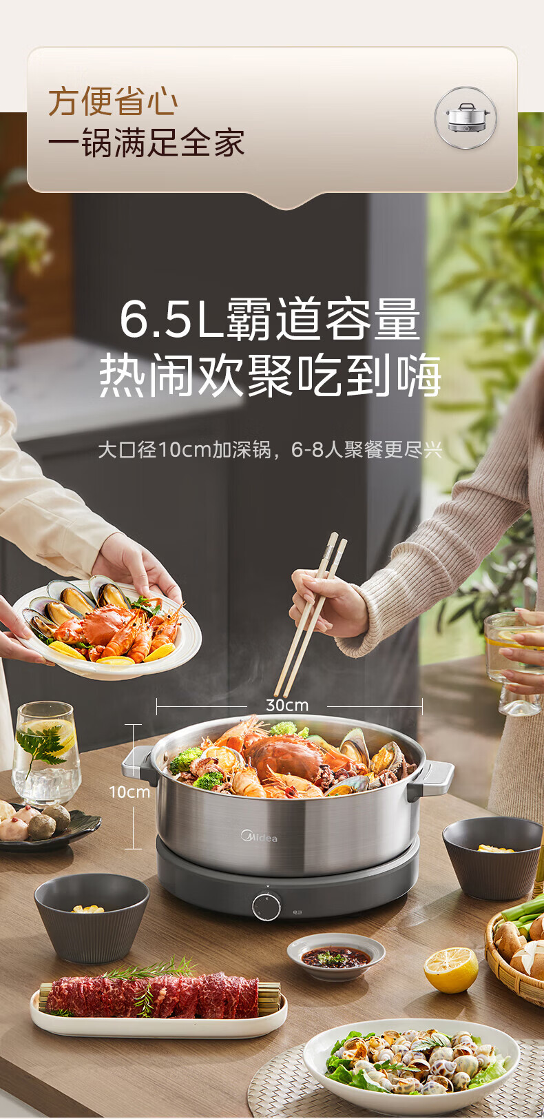 美的(Midea)0涂层电火锅电煮锅不锈钢火锅专用锅分体可拆全钢速沸电火锅电热锅多功能锅6.5L多用途锅HGS30G1