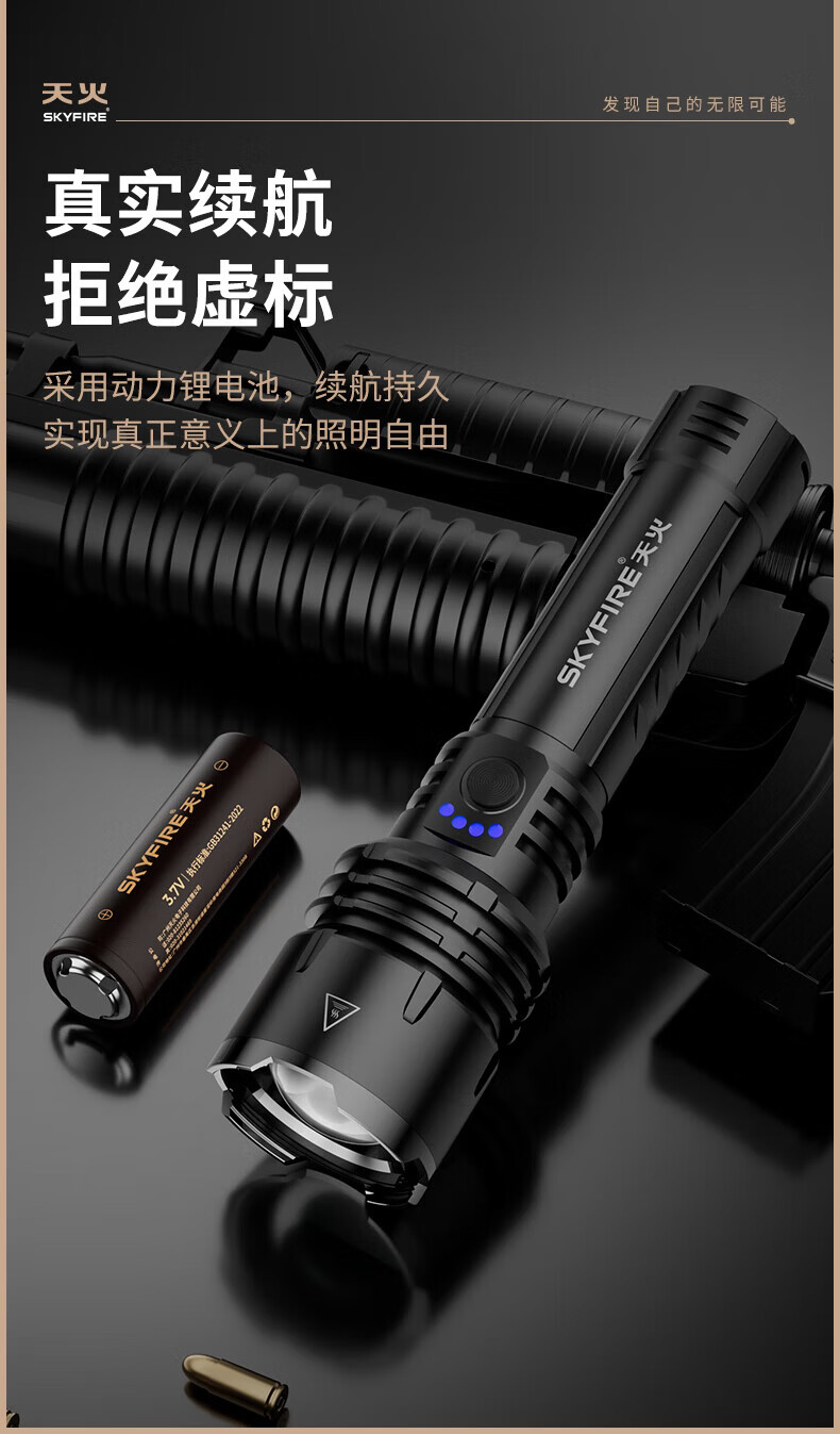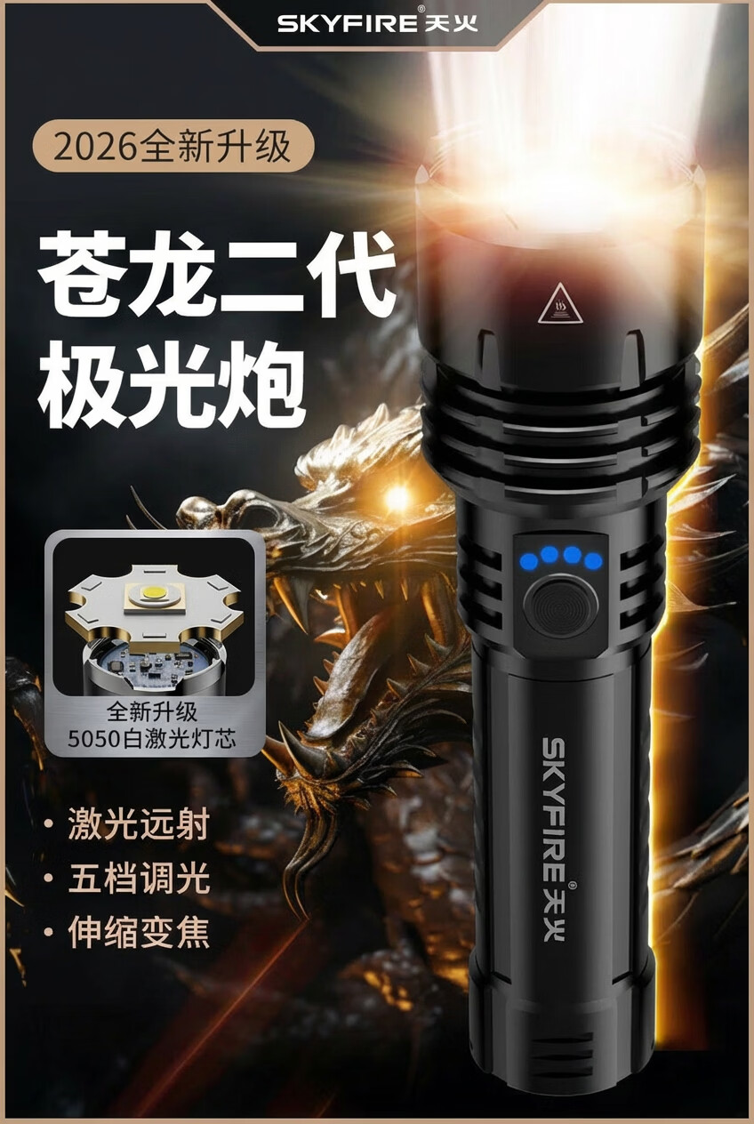 天火(SkyFire)手电筒强光苍龙二代超亮长续航夜钓工地200000流明穿天炮三千米 苍龙二代/12h续航/升级强光/电显