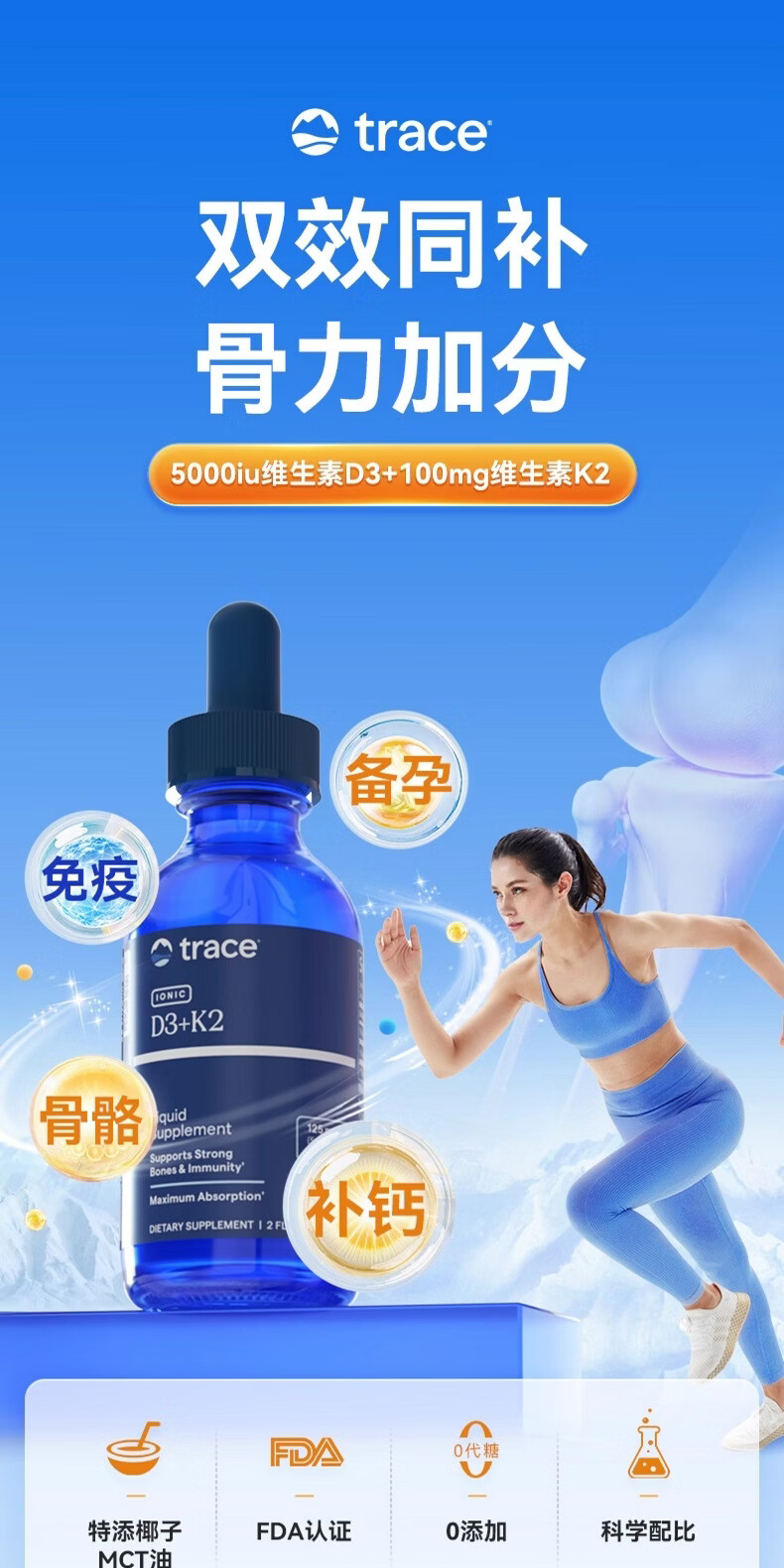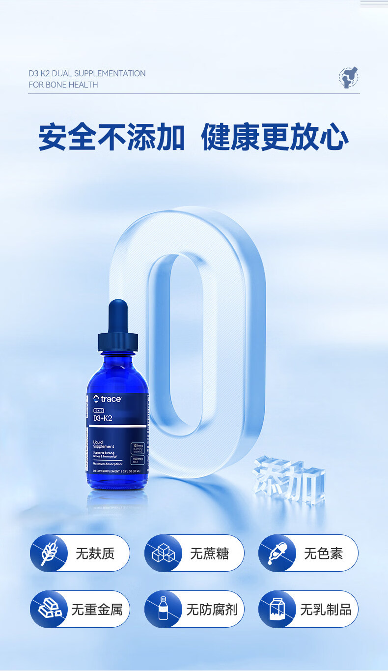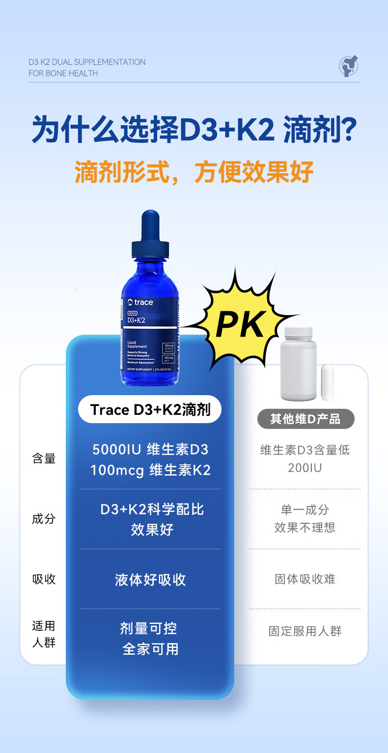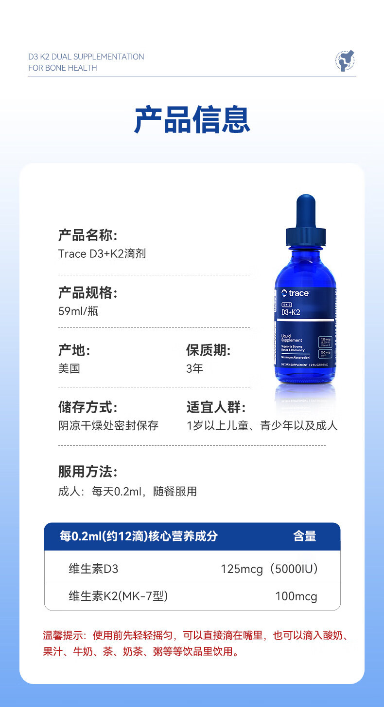trace液体维生素D3+K2滴剂促钙吸收预防骨质疏松孕妇儿童促进成长发育 59ml*1瓶