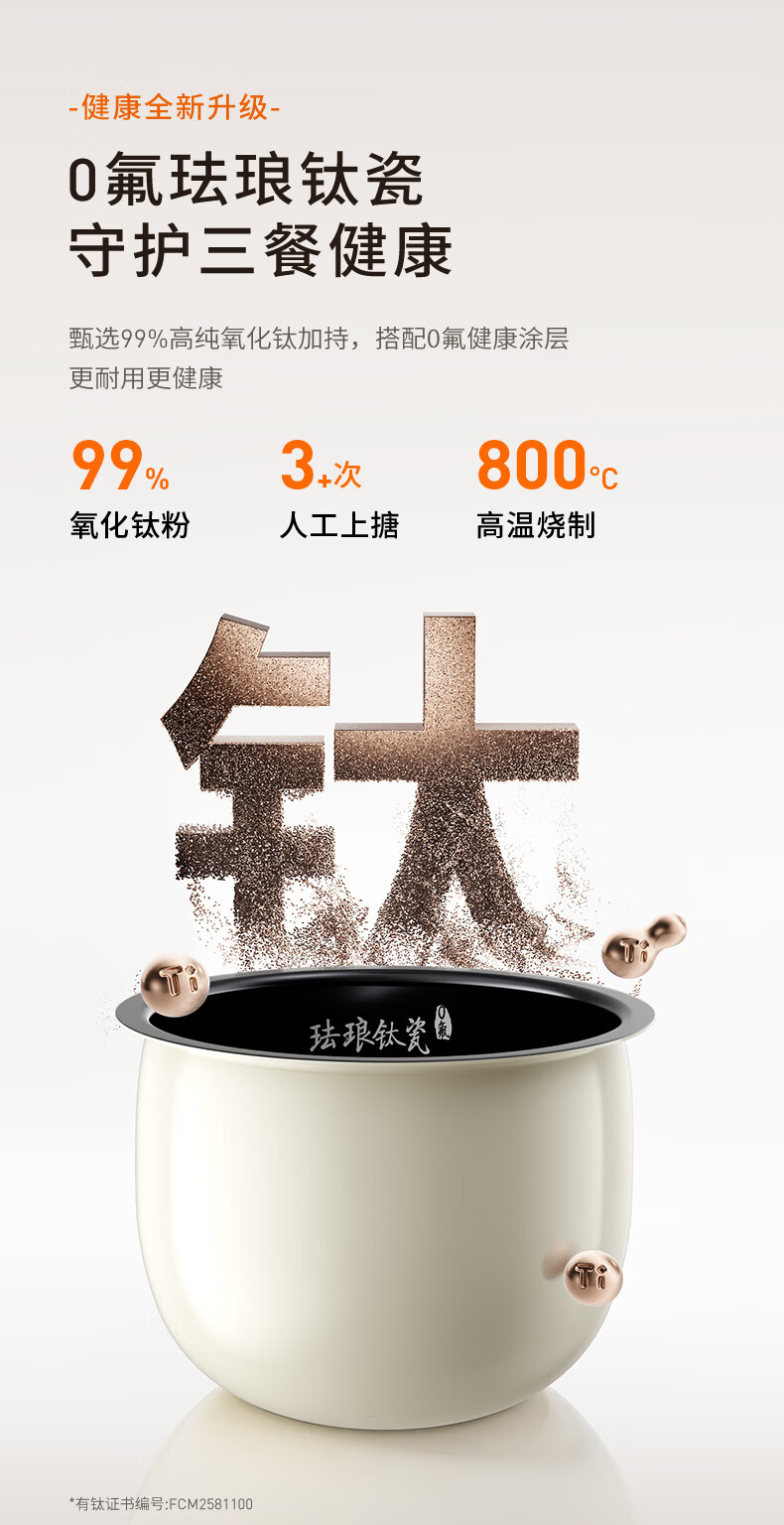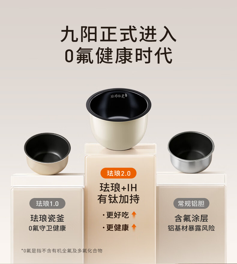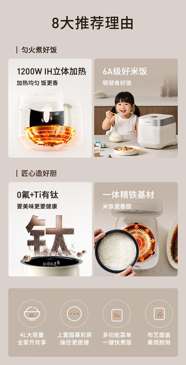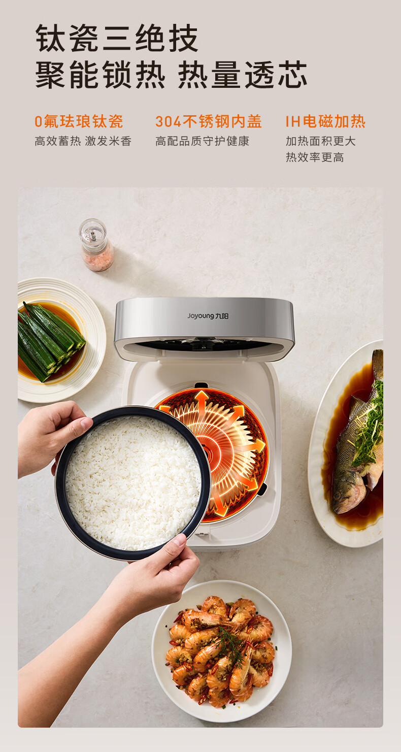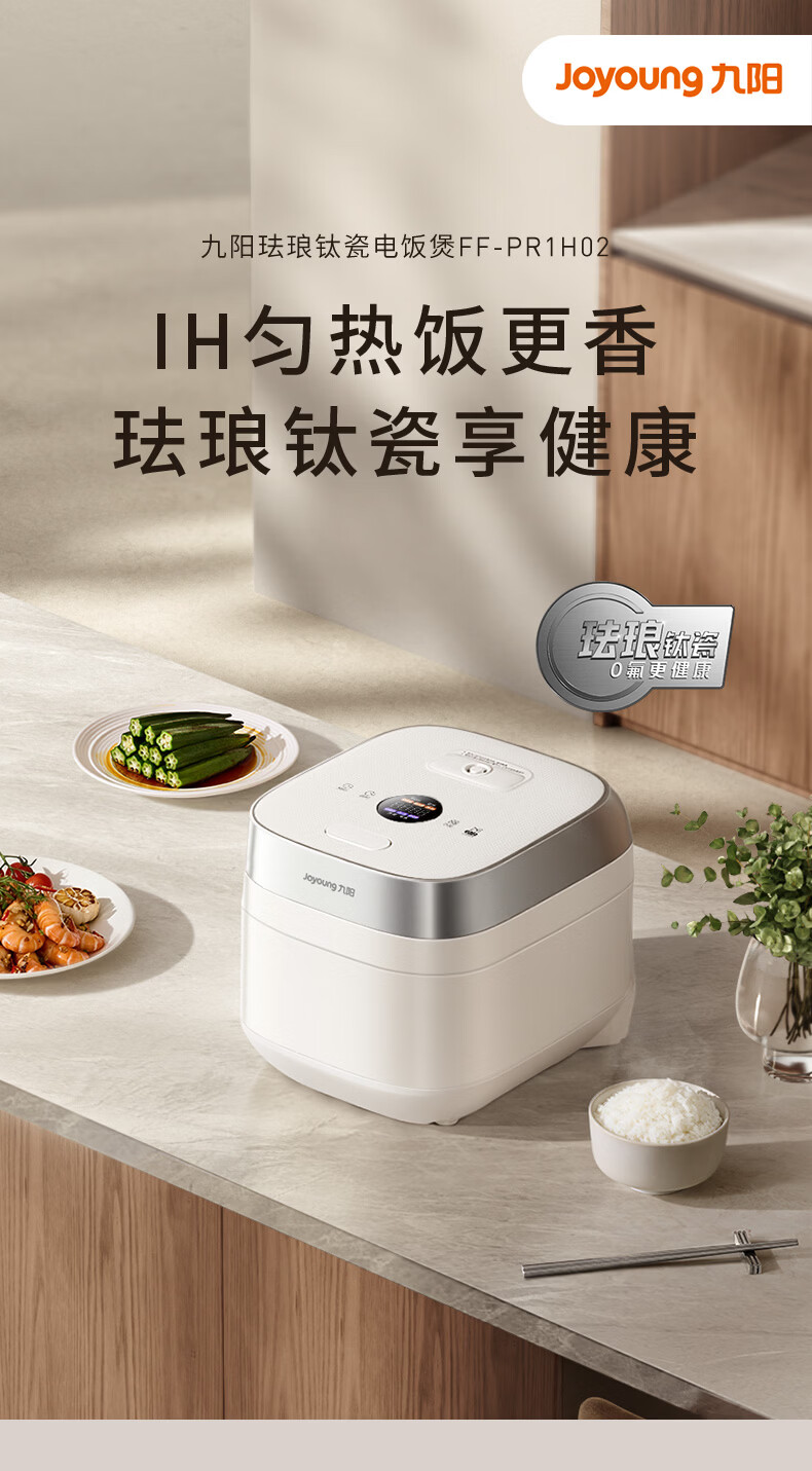 九阳(Joyoung)0氟系列珐琅钛瓷IH电饭煲4L电饭锅1200W含钛内胆3-4人0特氟龙6A饭微压快煮饭多功能 FF-PR1H02(4L)