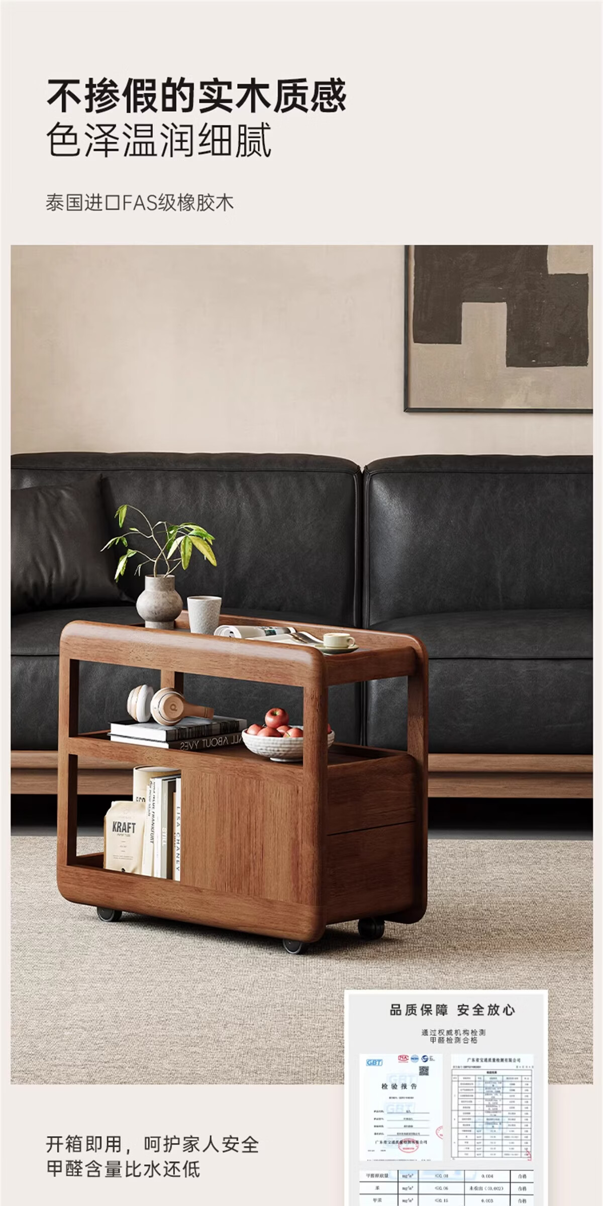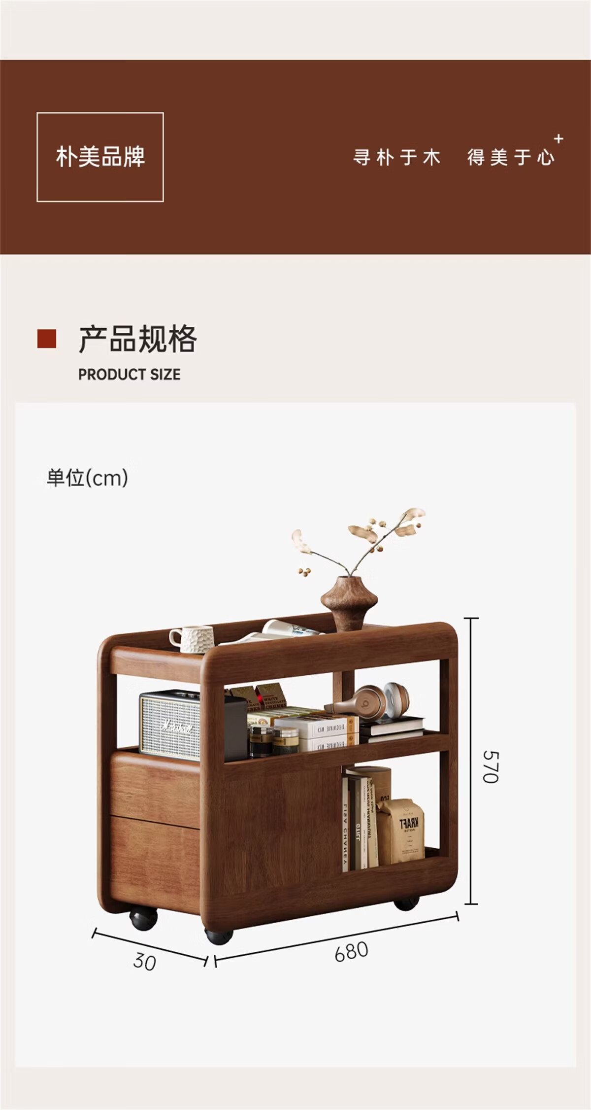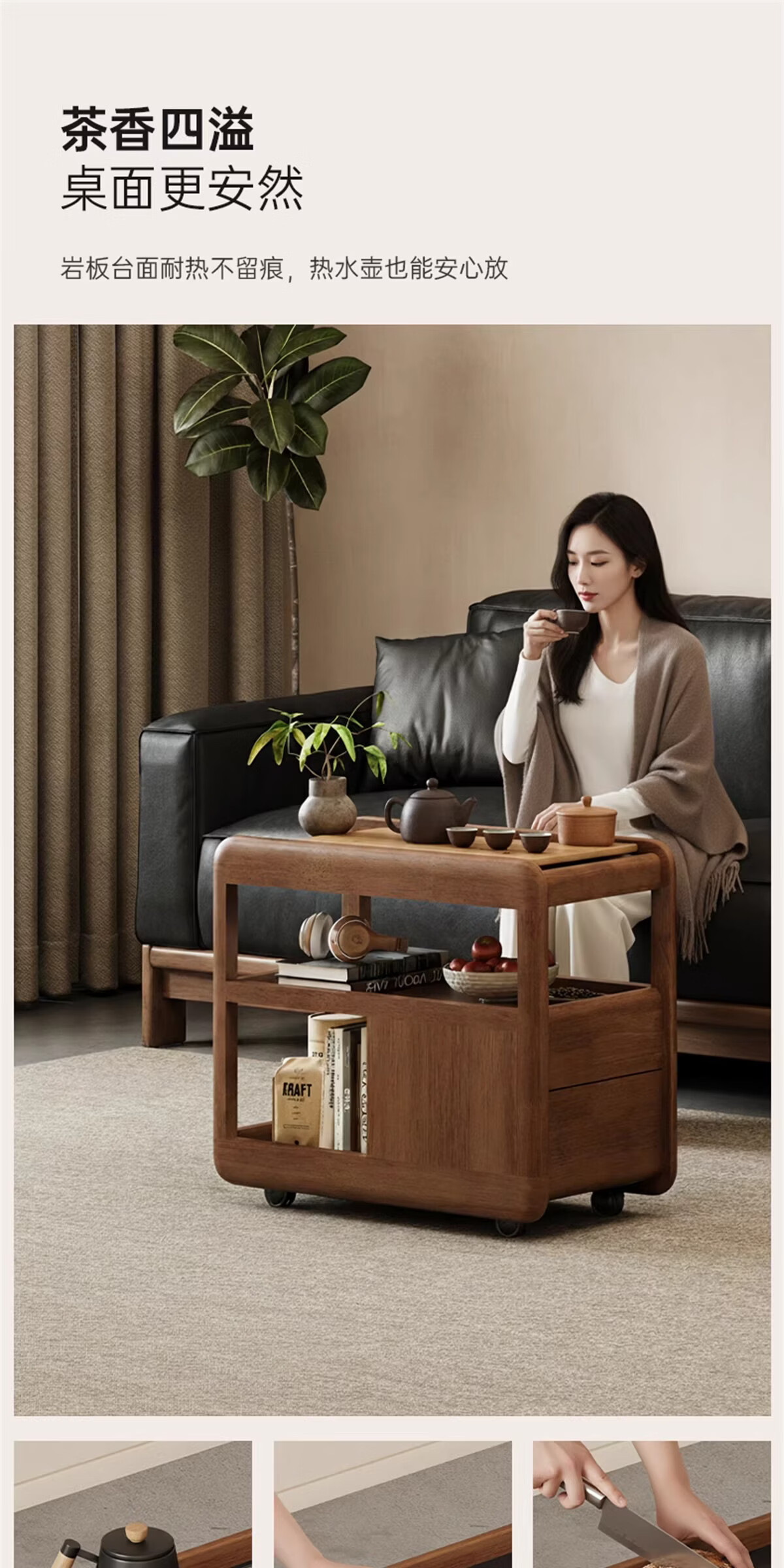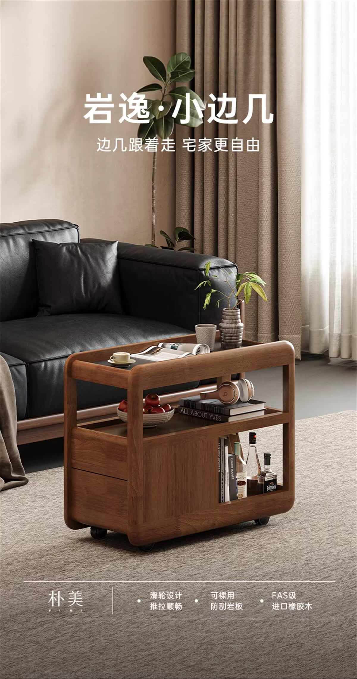 朴美中古风实木边几客厅岩板茶几可移动沙发侧边桌家用零食收纳小推车