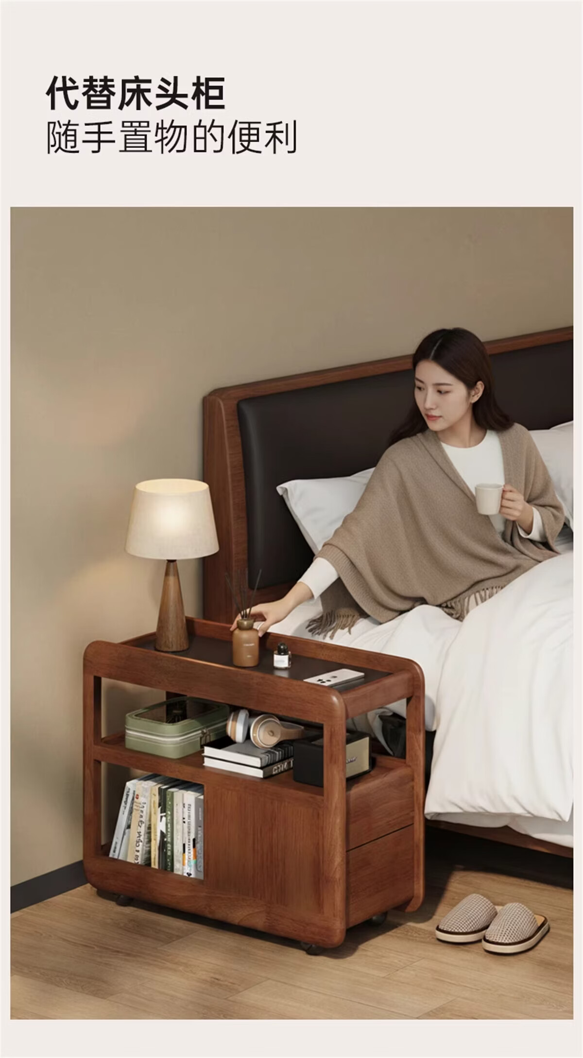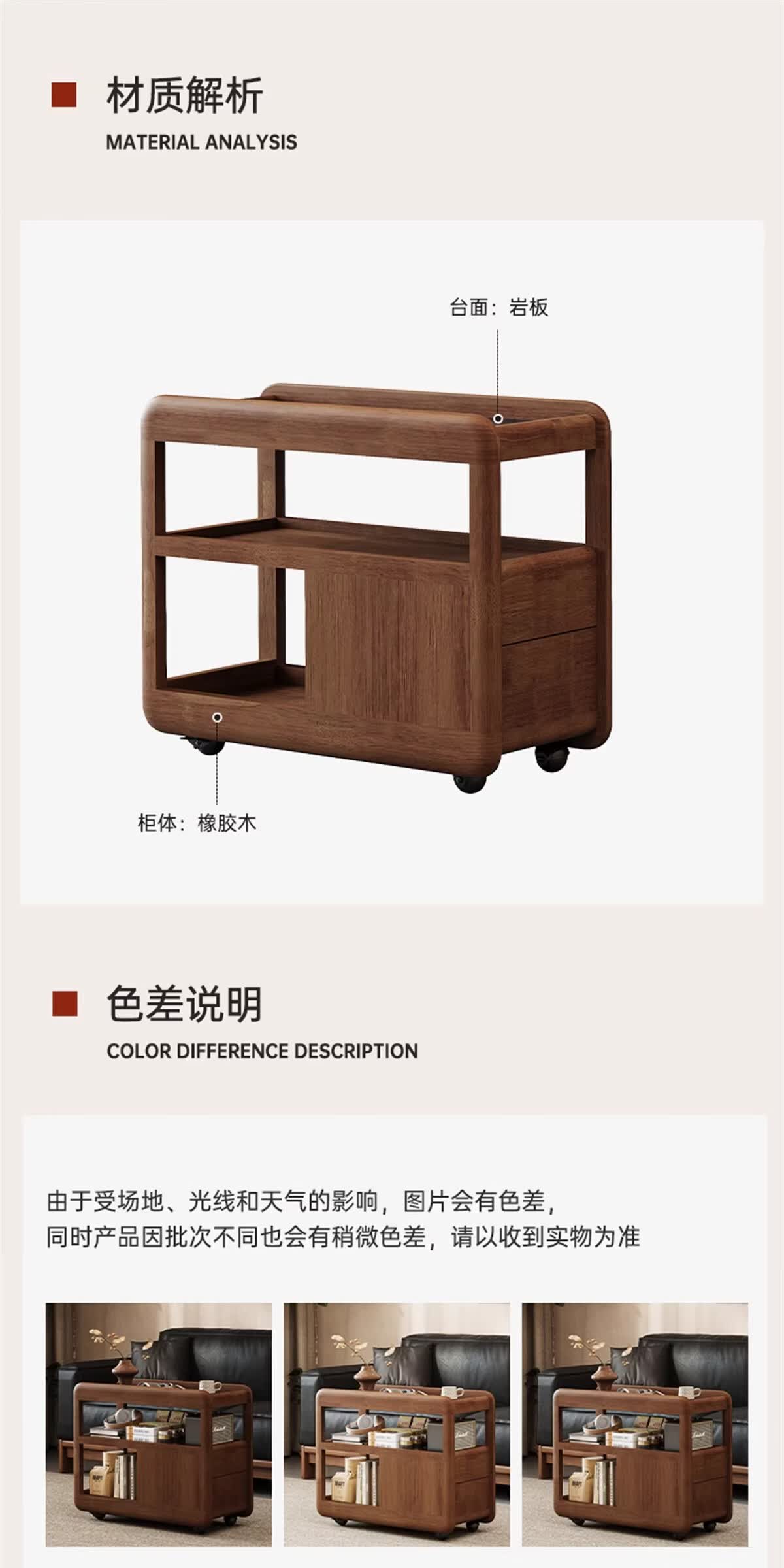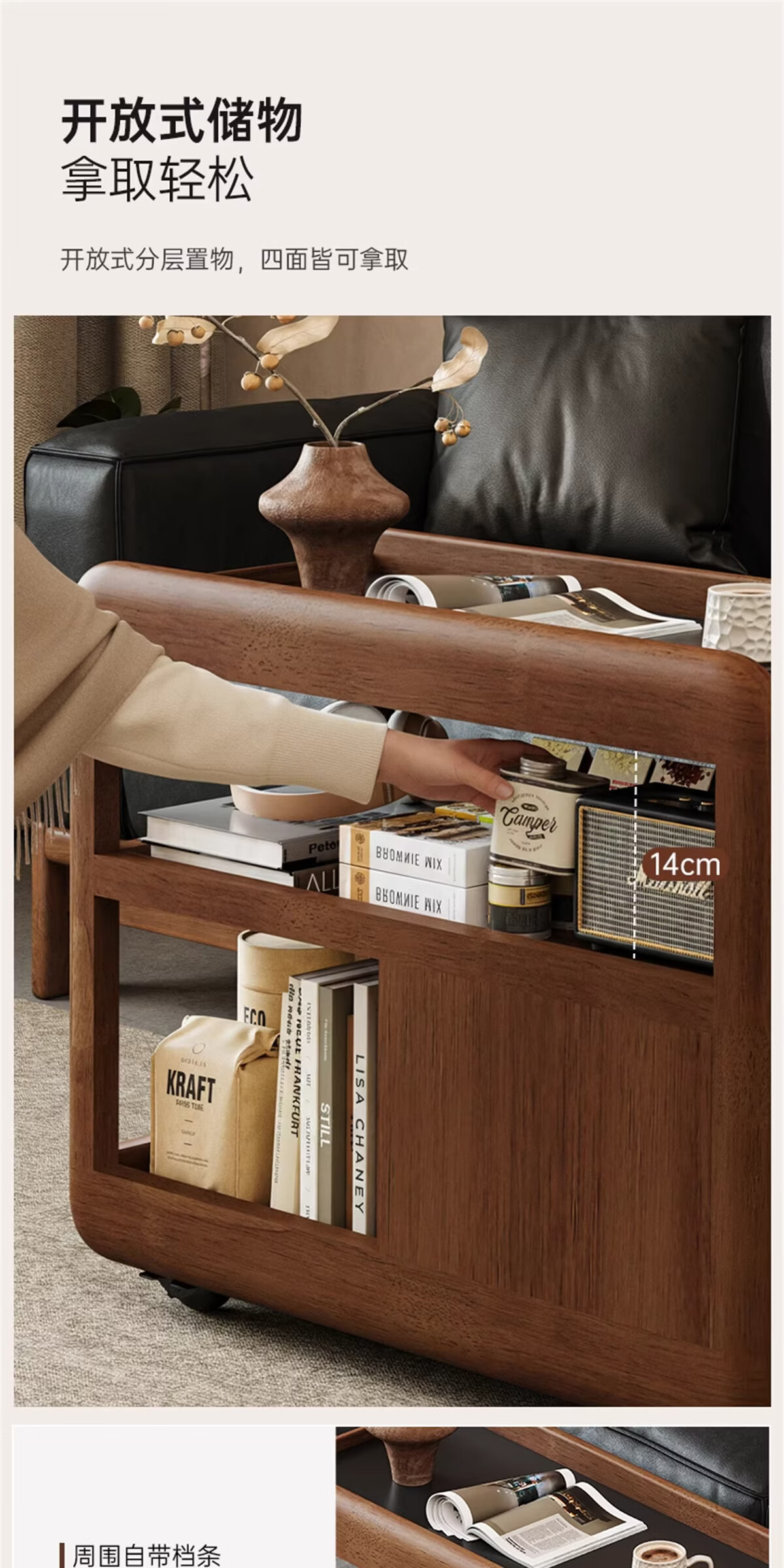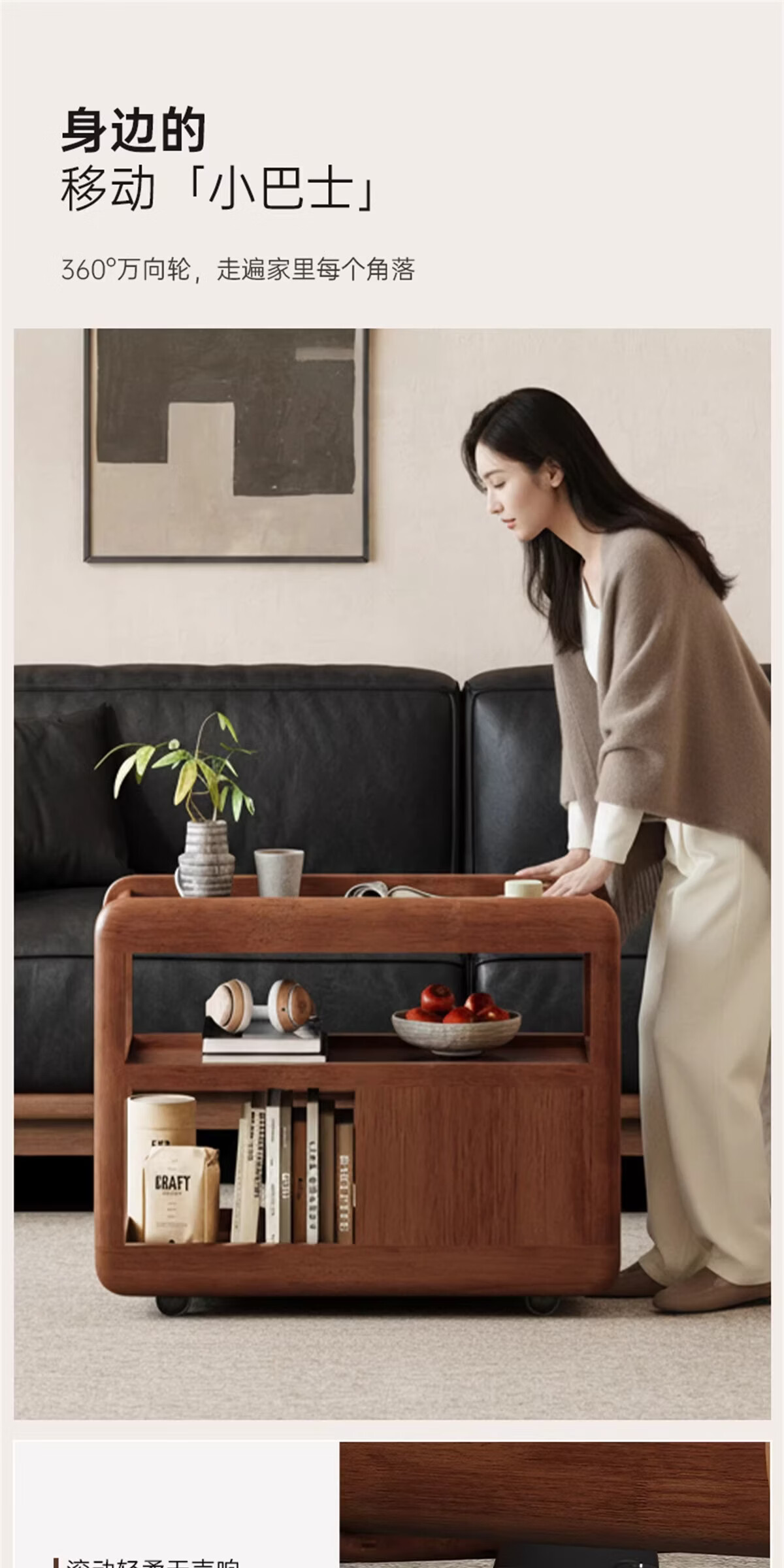 朴美中古风实木边几客厅岩板茶几可移动沙发侧边桌家用零食收纳小推车