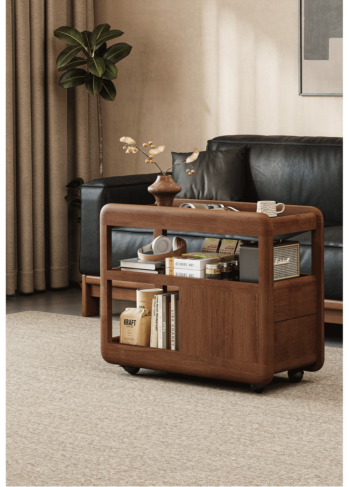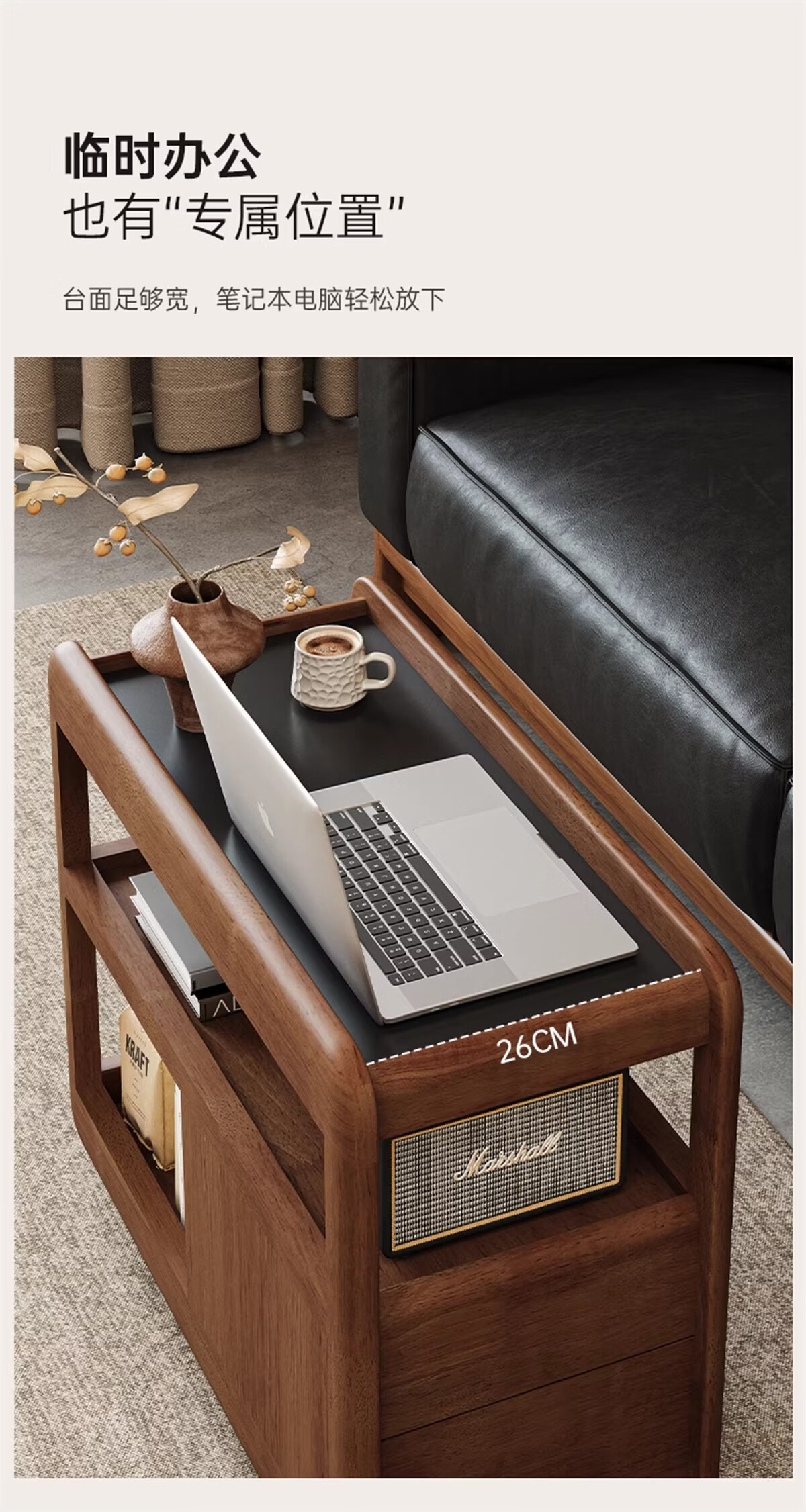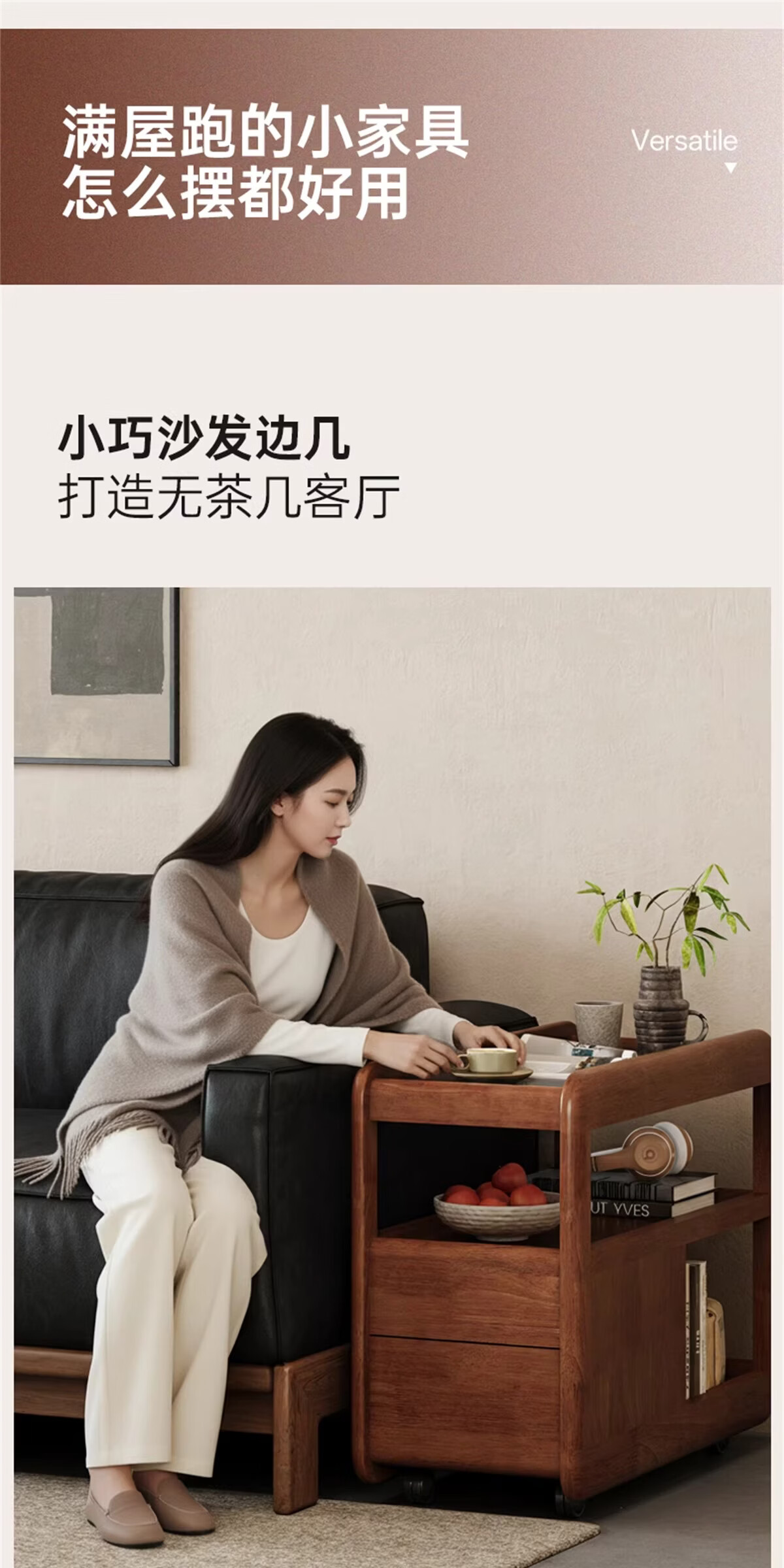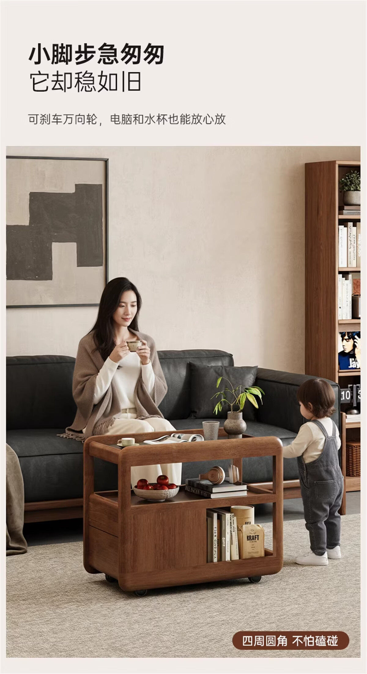 朴美中古风实木边几客厅岩板茶几可移动沙发侧边桌家用零食收纳小推车