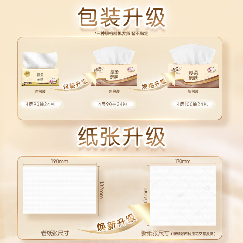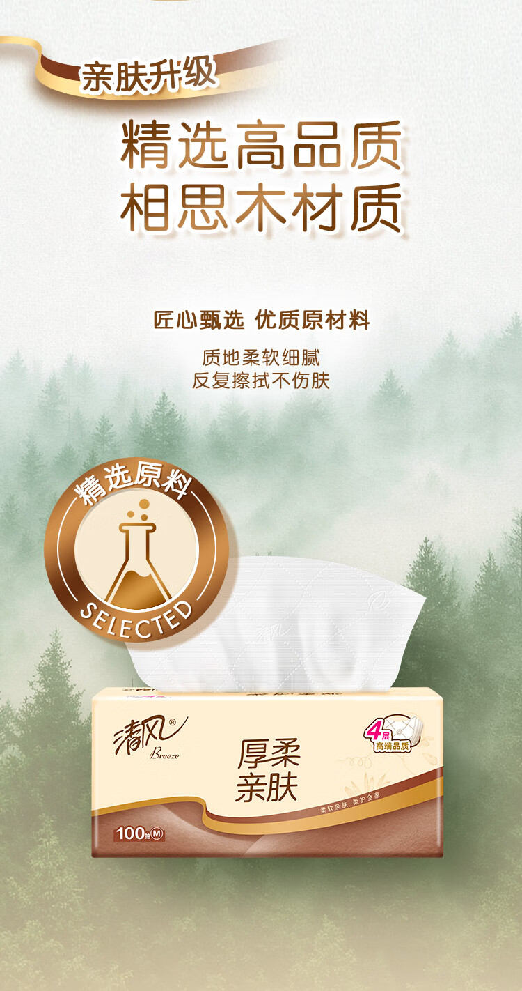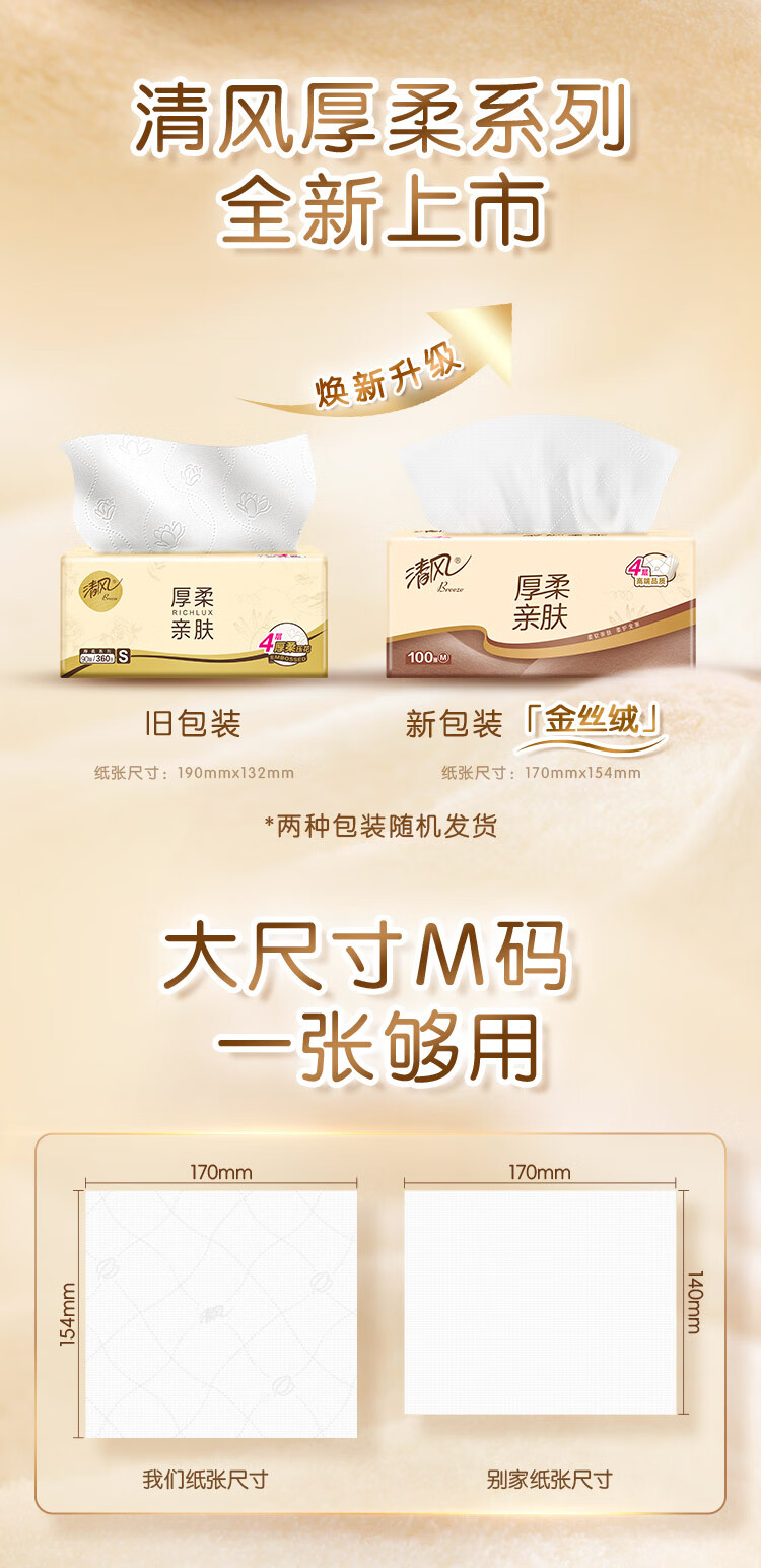 清风抽纸 厚柔4层100抽*24包M码 纸巾面巾纸 卫生纸 餐巾纸 整箱销售