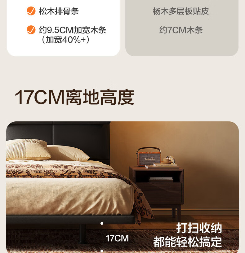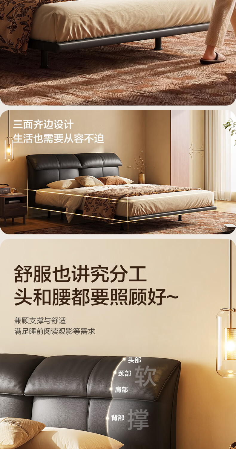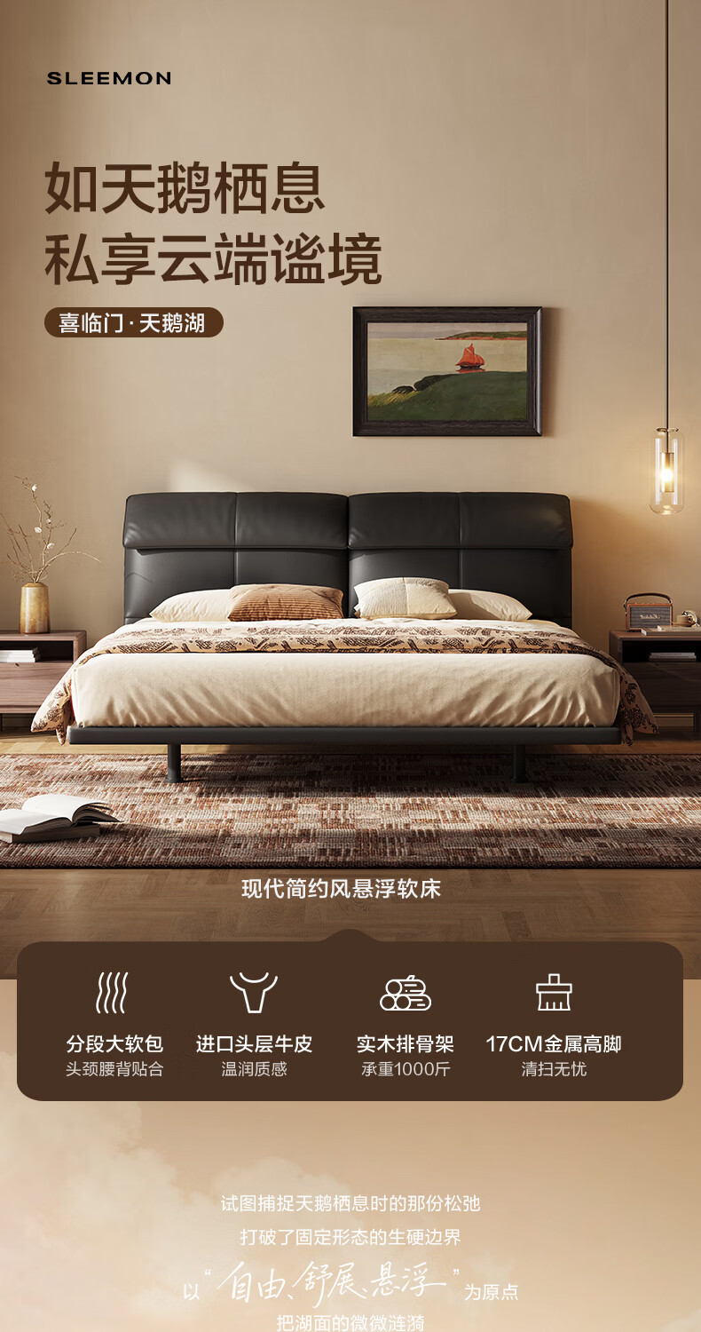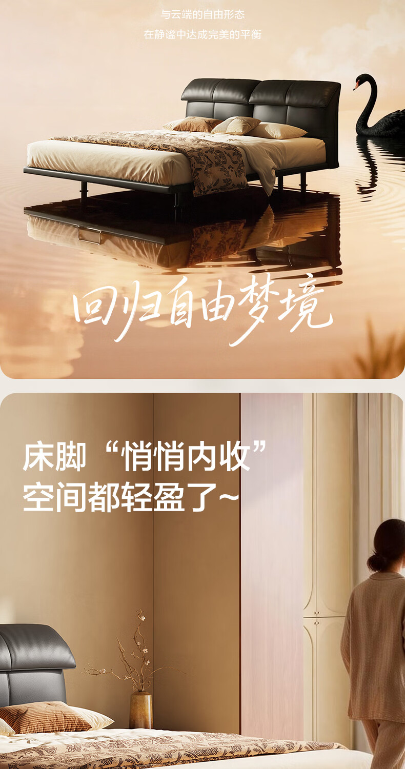 CBD家居现代简约真皮软包床双人主卧大床奶油风婚床头层牛皮甜心悬浮 甜心悬浮-水墨黑单床 卷帘排骨架 1800*2000