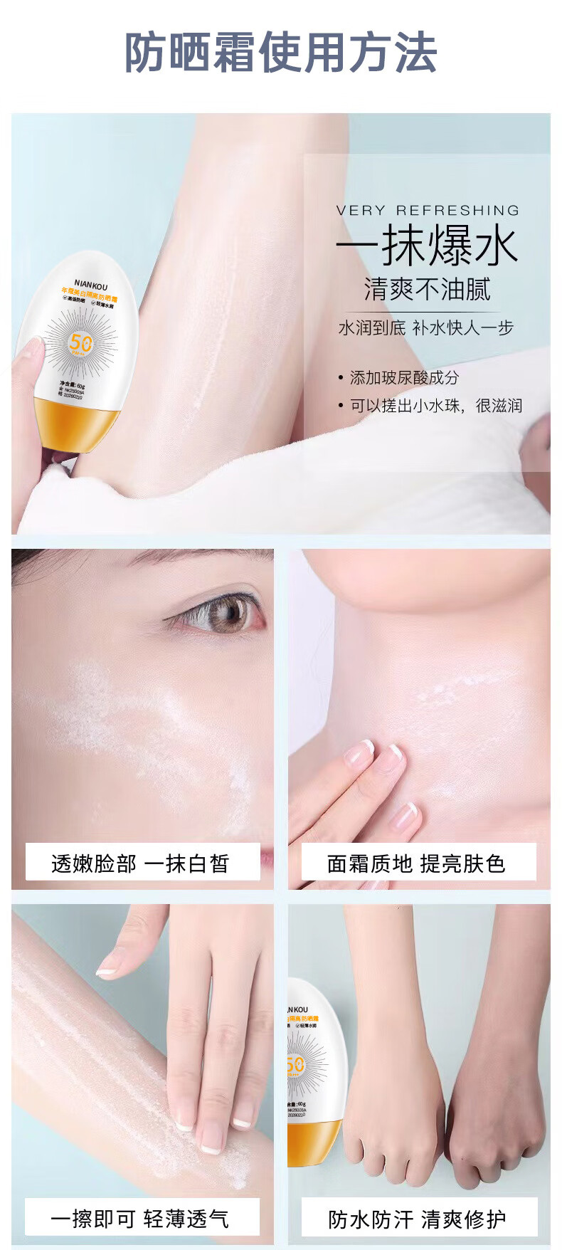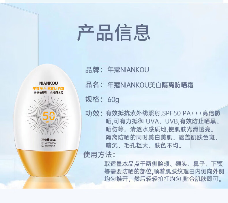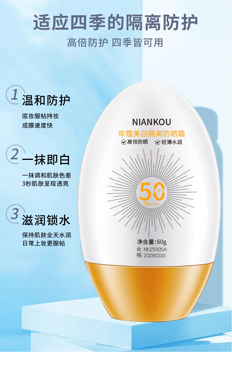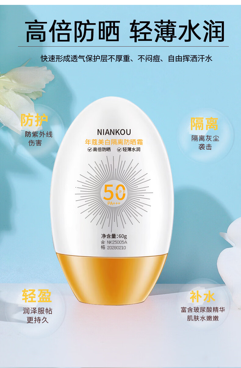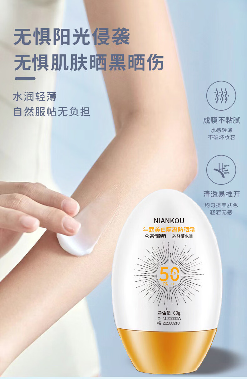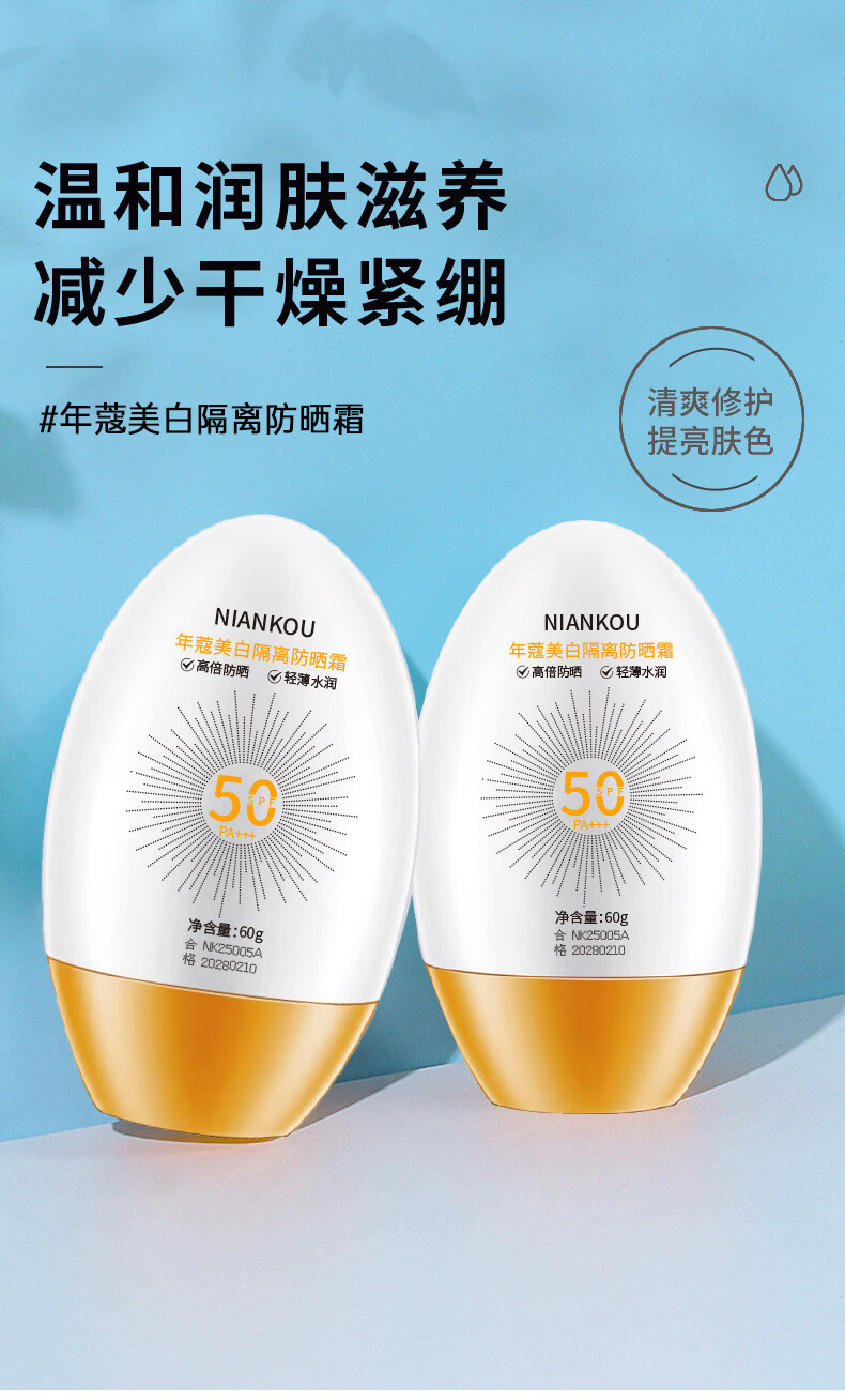年蔻(NIANKOU)美白隔离防晒乳SPF50+多效合一防紫外线防水防汗清爽养肤隔离防晒 【新款全蛋】高倍防晒60g*2瓶