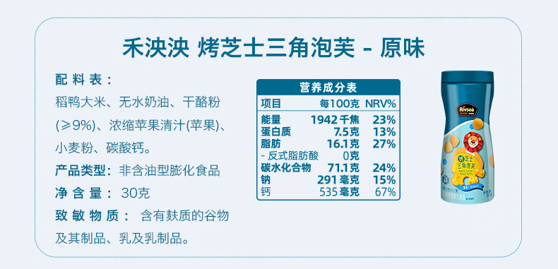 禾泱泱烤芝士三角泡芙原味30g 高钙含蛋白宝宝零食小巧易抓稻鸭大米