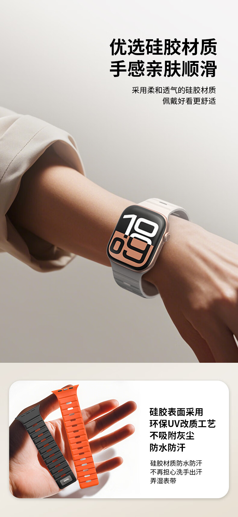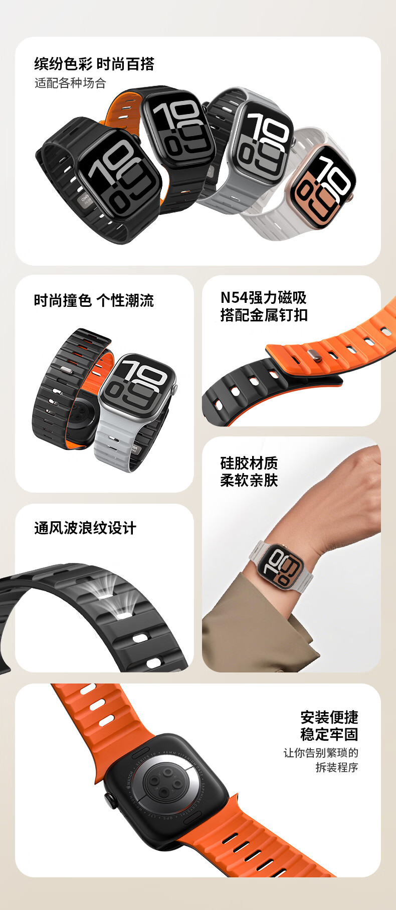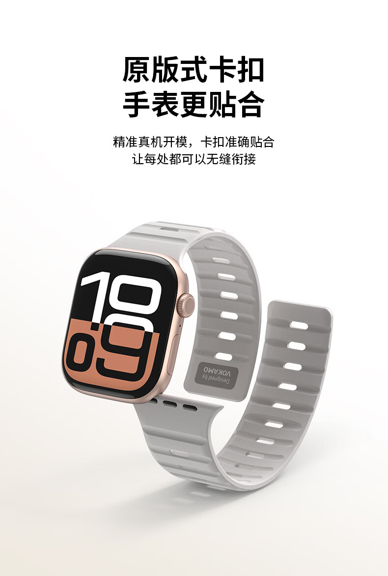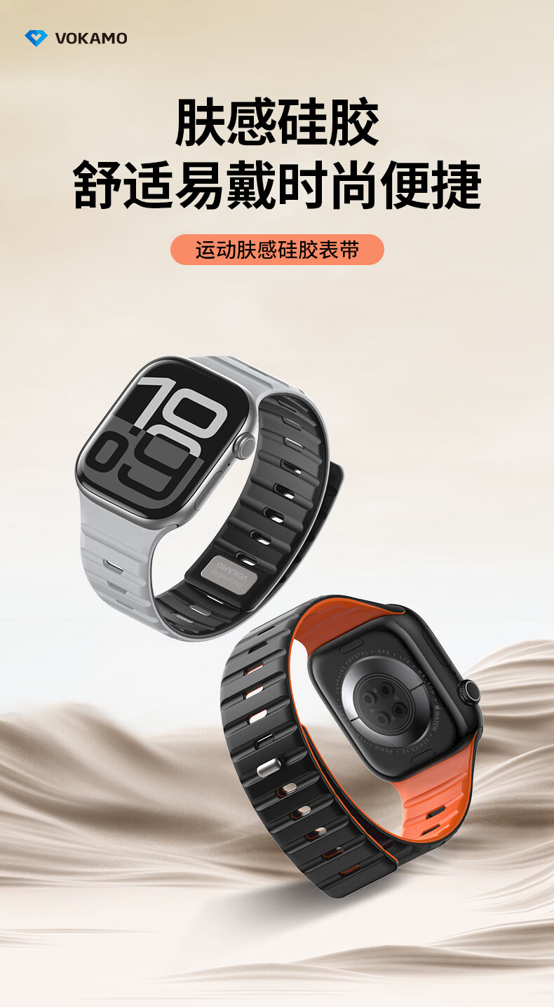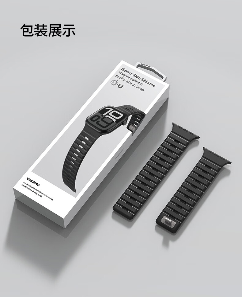 VOKAMO沃咔曼适用Apple watch S11/10/9硅胶磁吸表带透气金属卡扣iwatch Ultra3/2苹果手表腕带夏日运动 黑色 44/45/46/49MM