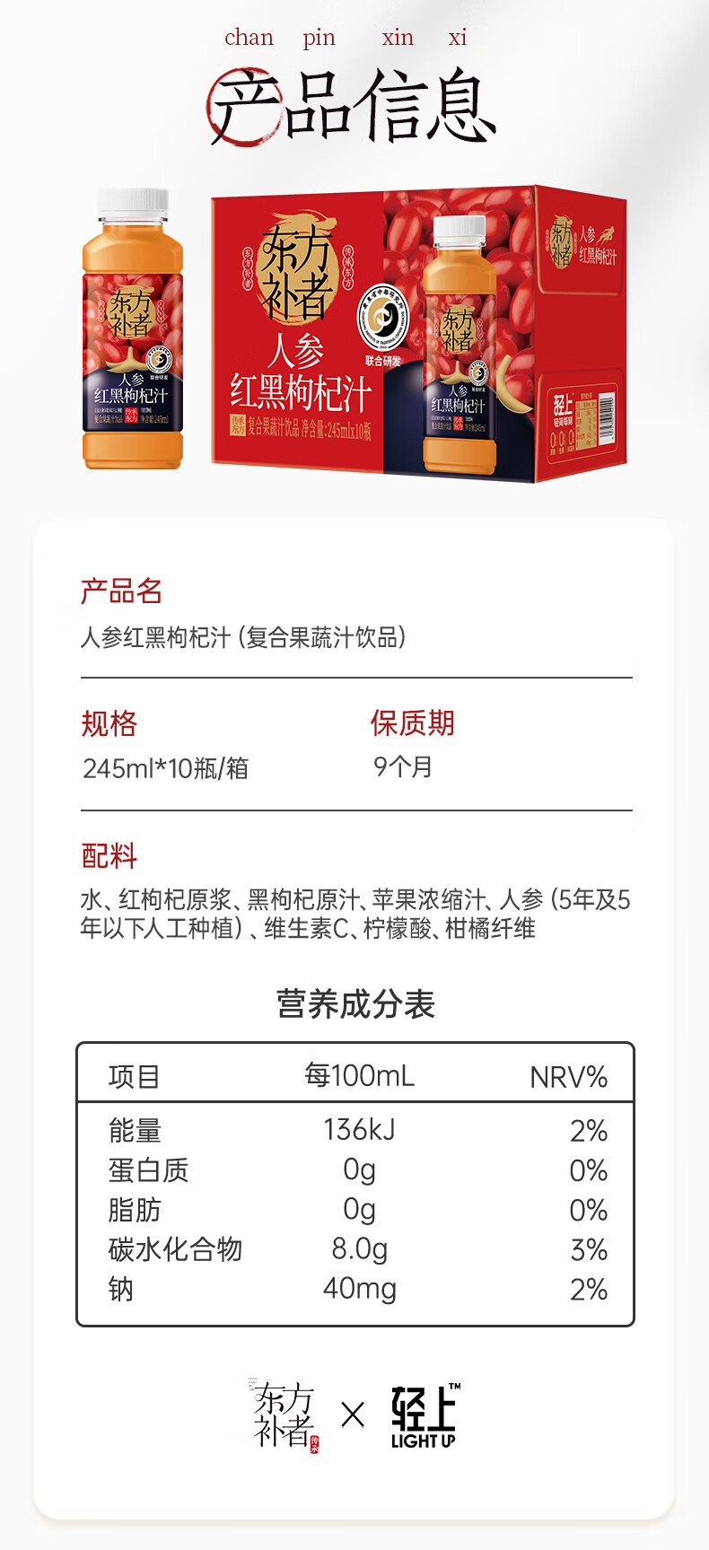 轻上东方补者人参红黑枸杞汁长白山人参小瓶装饮料 整箱装礼盒装 人参红黑枸杞汁245ml*10瓶