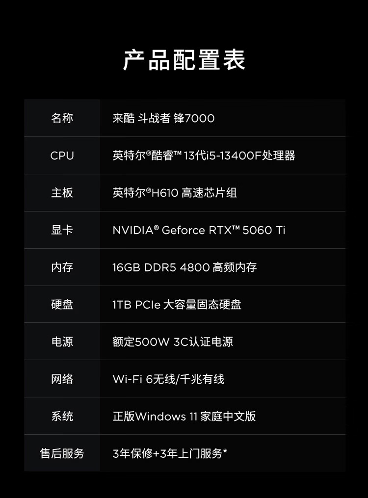 联想(Lenovo)来酷斗战者锋7000游戏主机台式电脑(13代i5-13400F RTX5060TI 8G显卡 16G DDR5 1TB)国家补贴