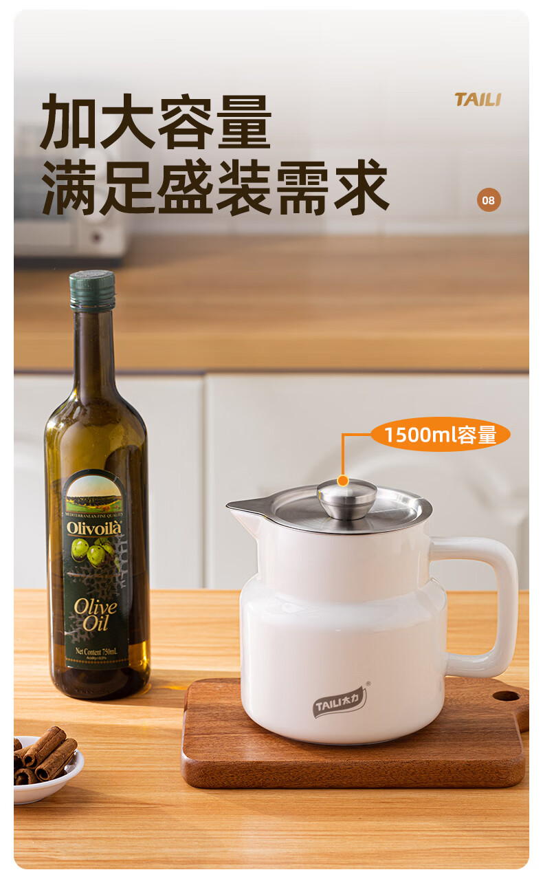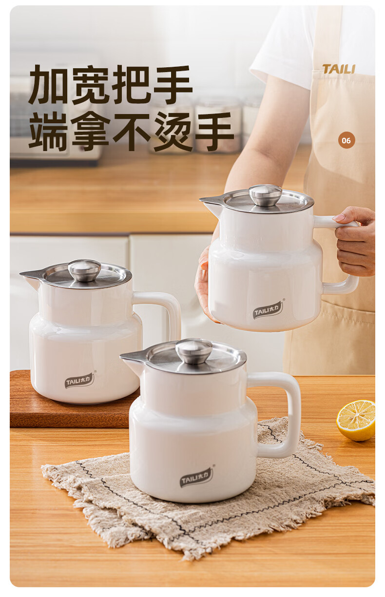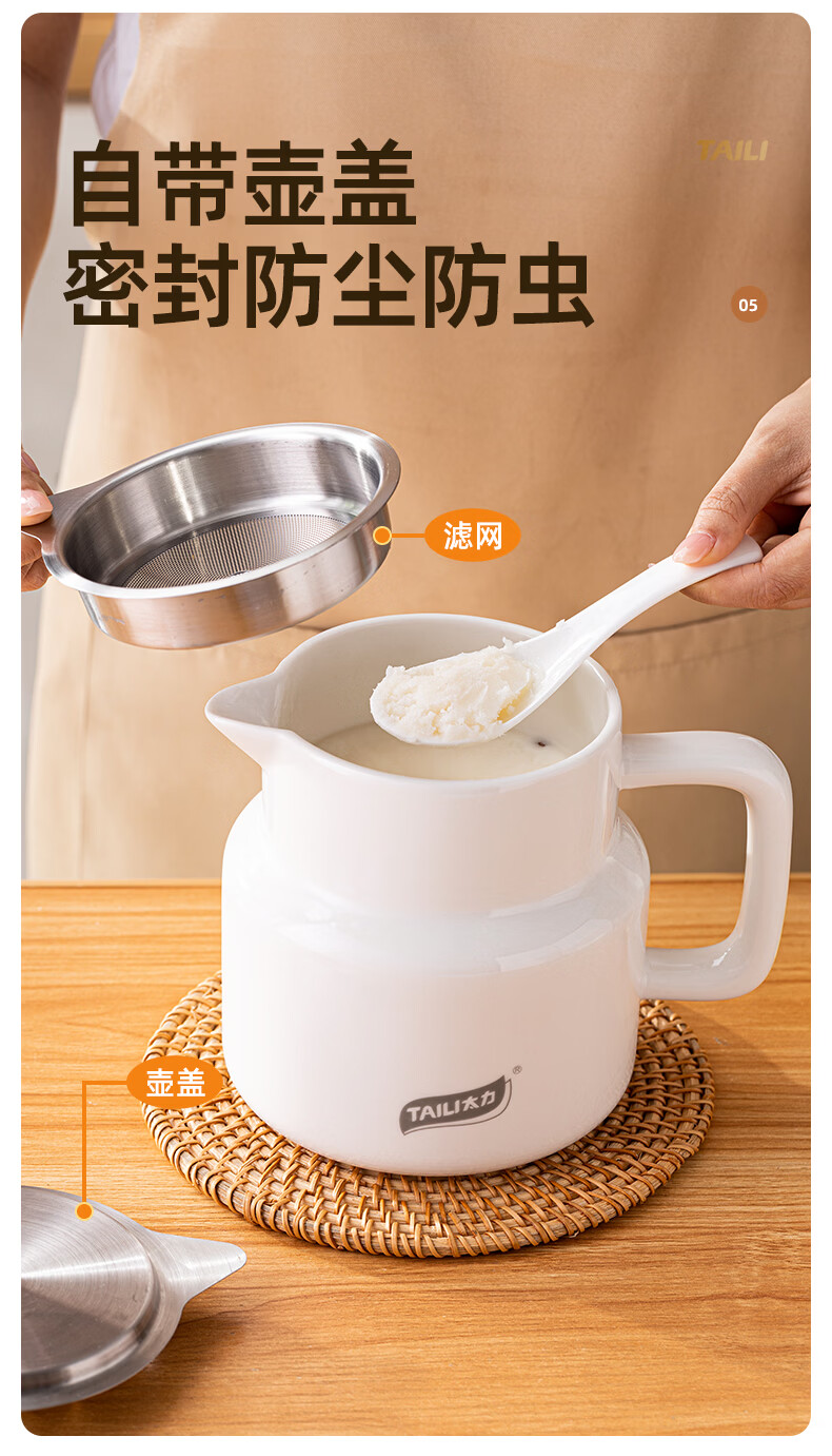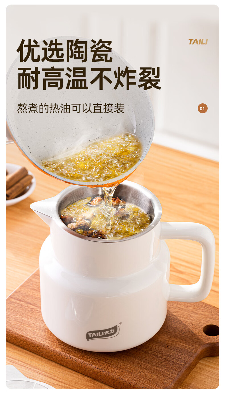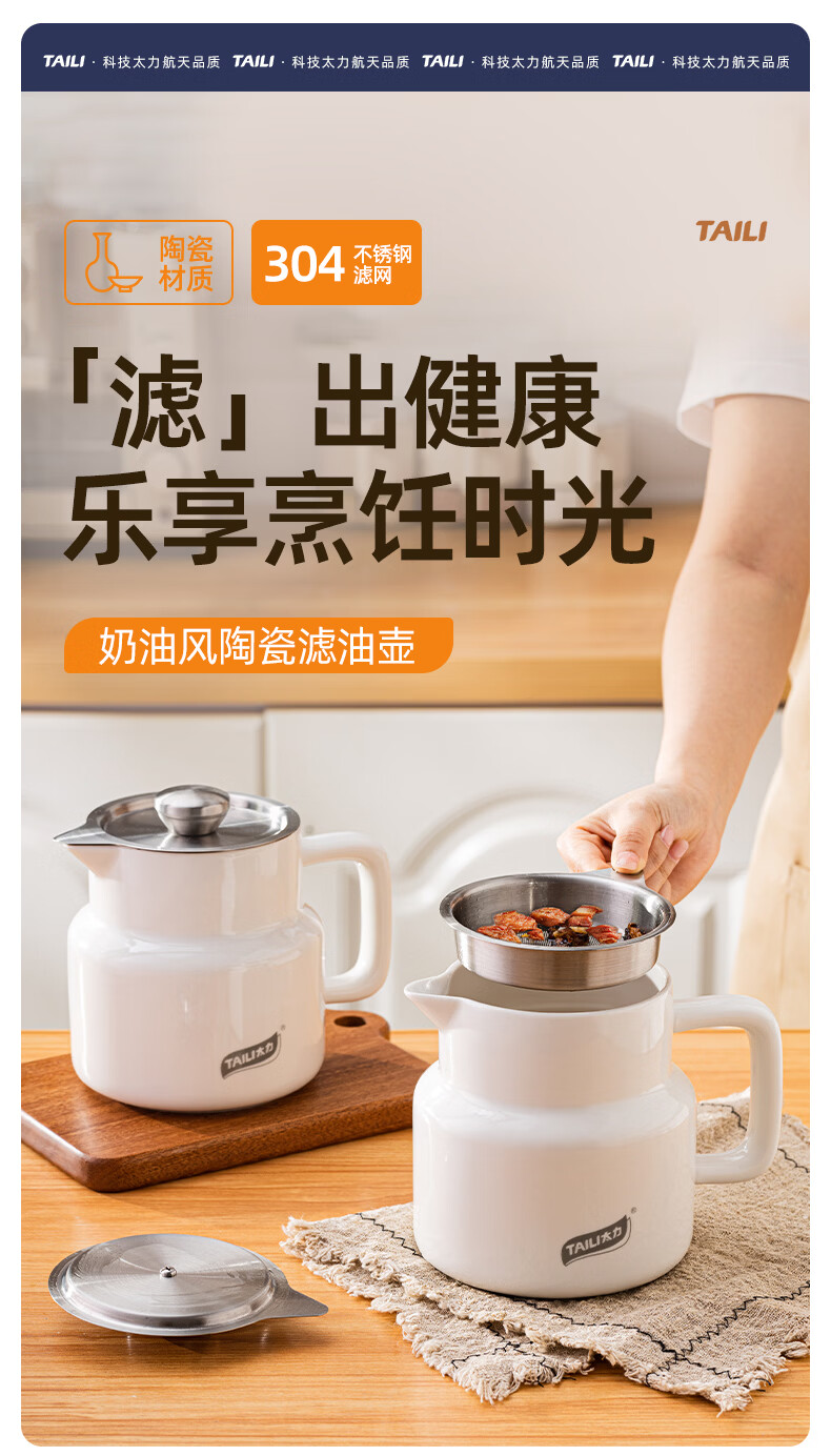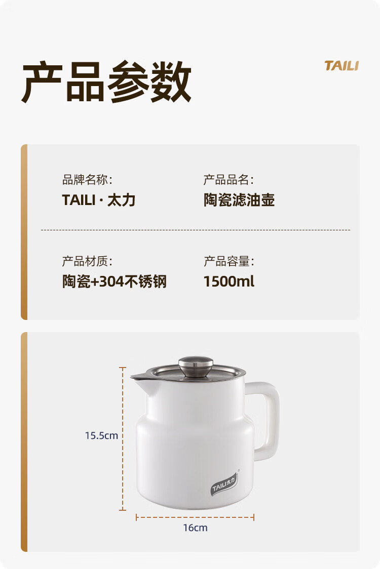 太力厨房家用猪油罐滤油壶大容量陶瓷储油罐带过滤盖 储油壶 1500ml