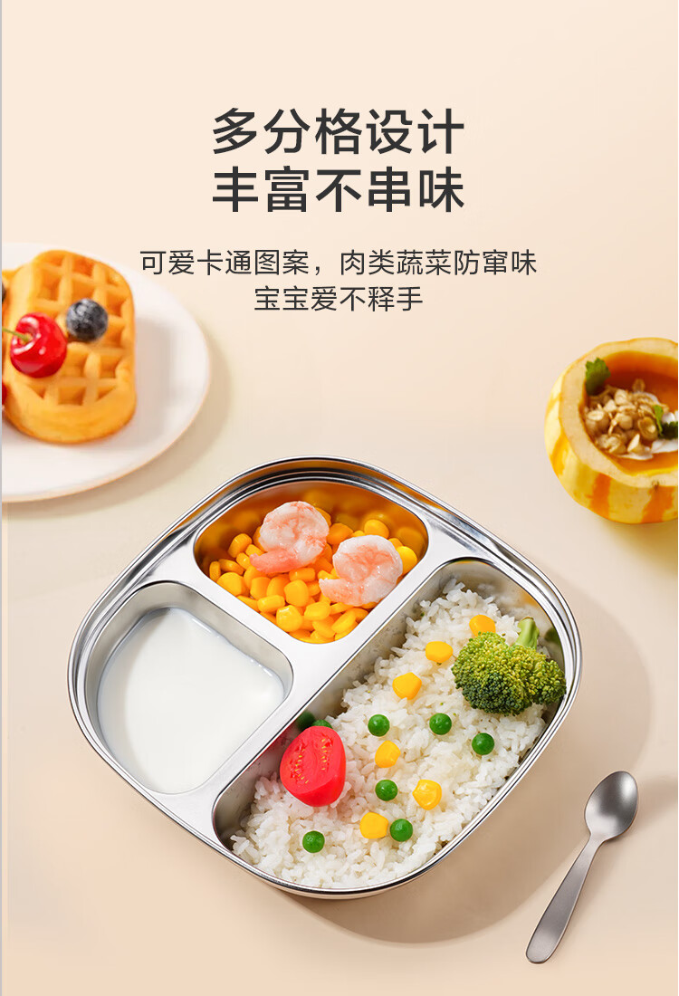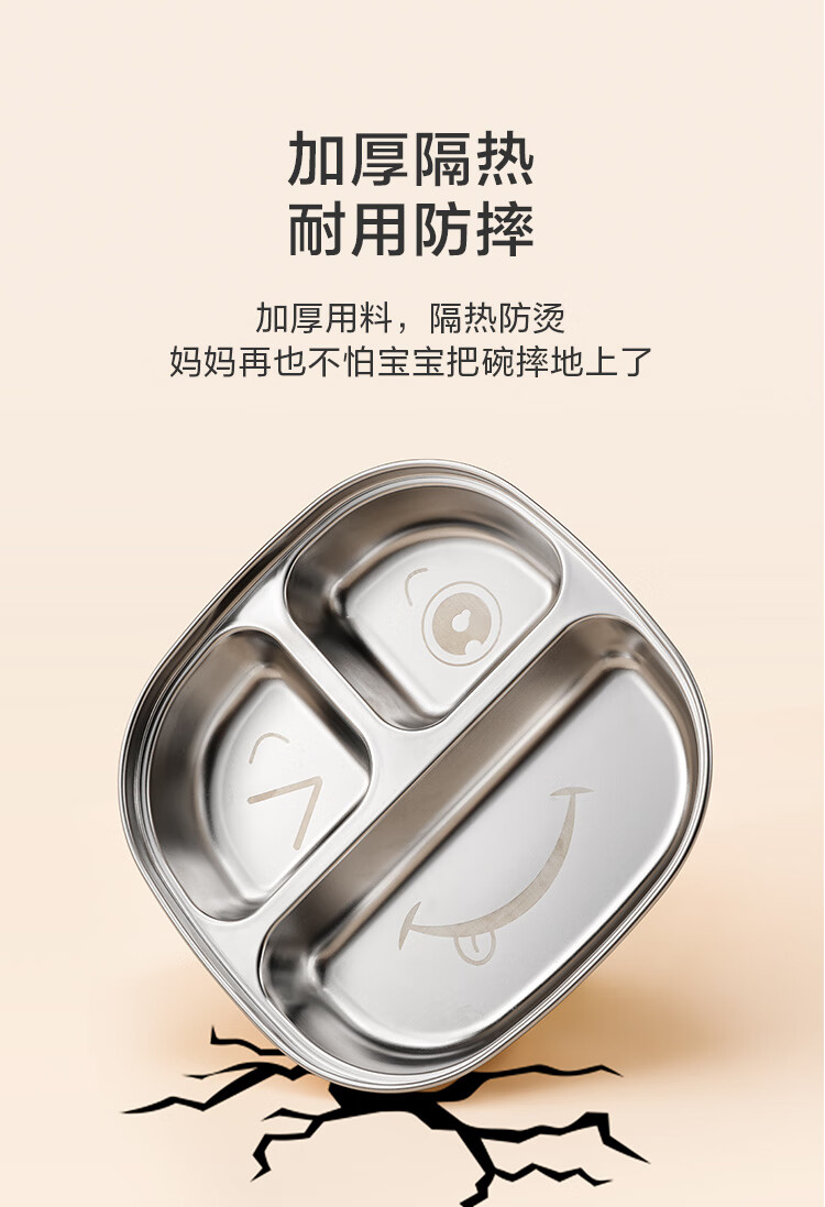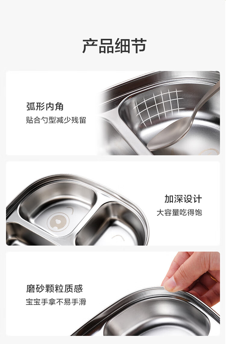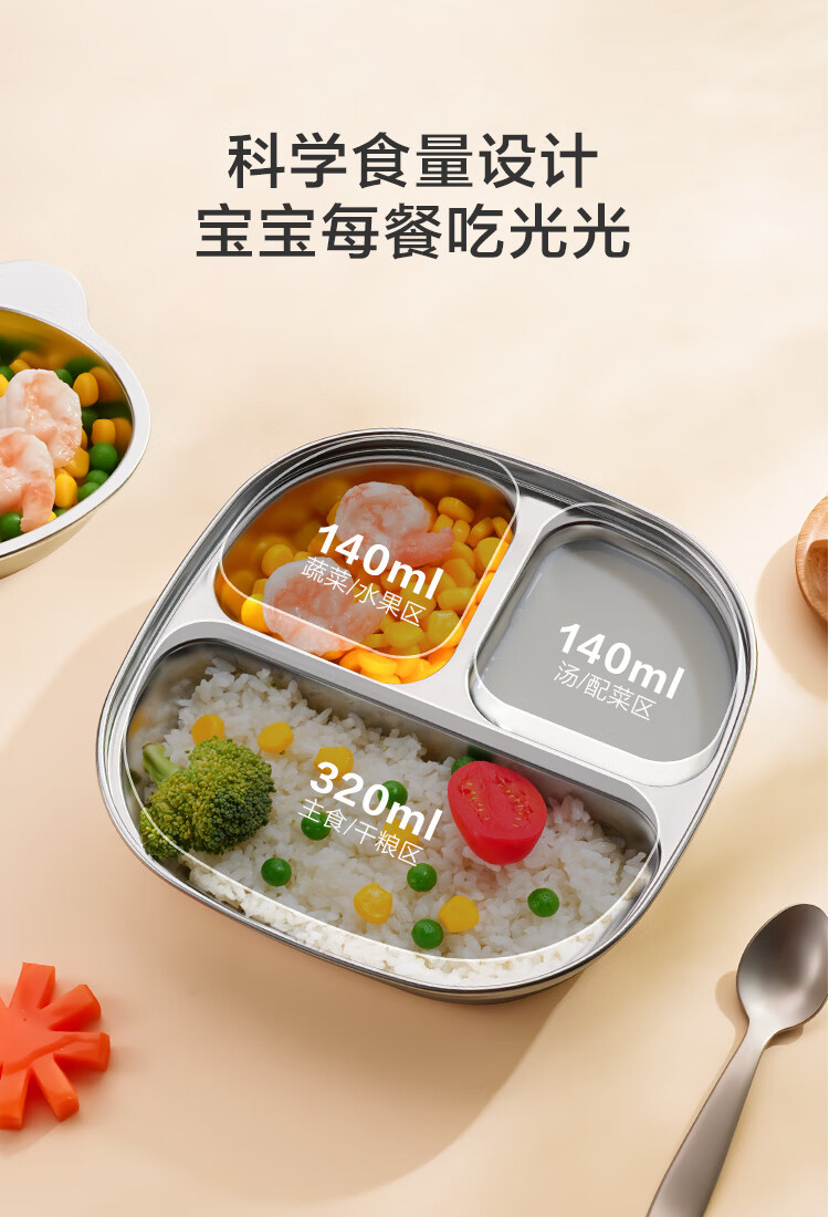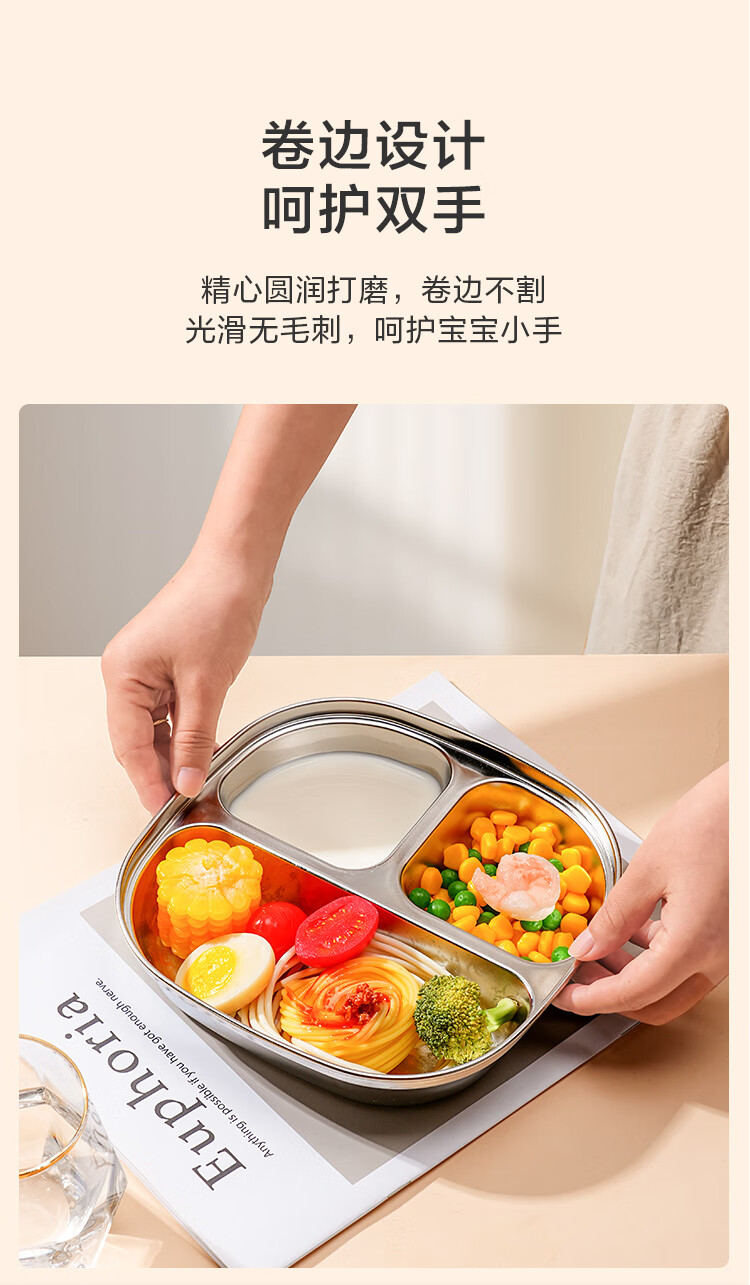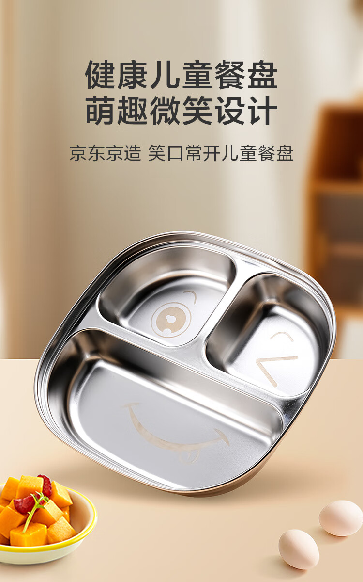 京东京造 儿童碗饭碗 304不锈钢宝宝辅食盘汤碗小学生餐具三格托盘600ml
