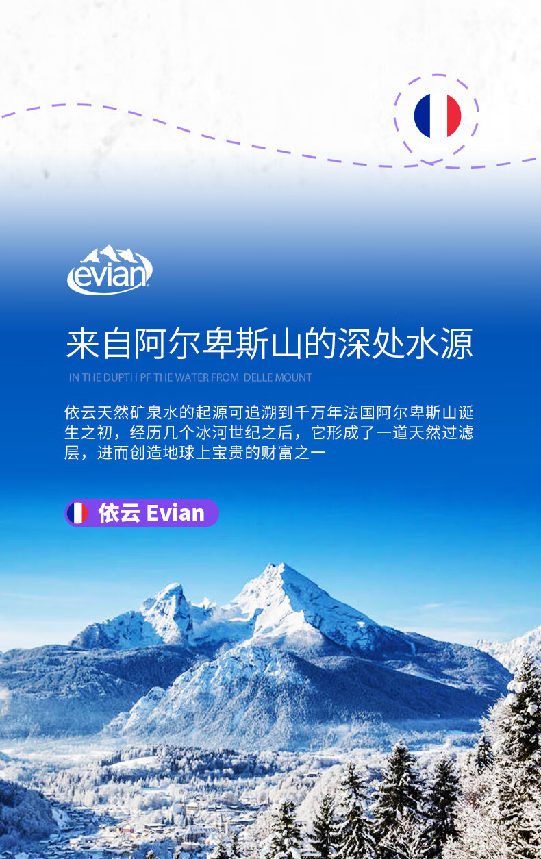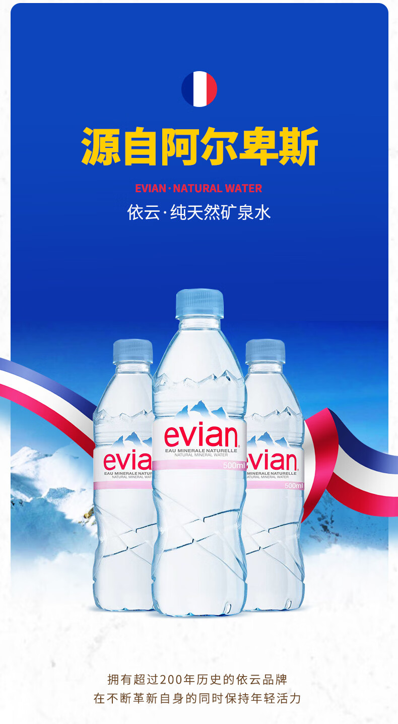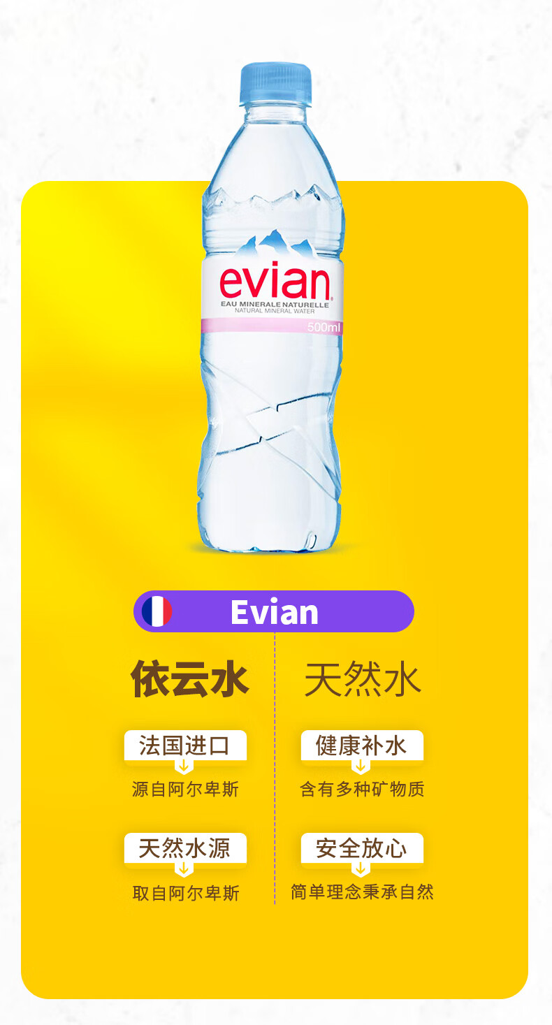 依云(evian)法国原装进口天然矿泉水500ml*24瓶(软瓶)饮用水 整箱装
