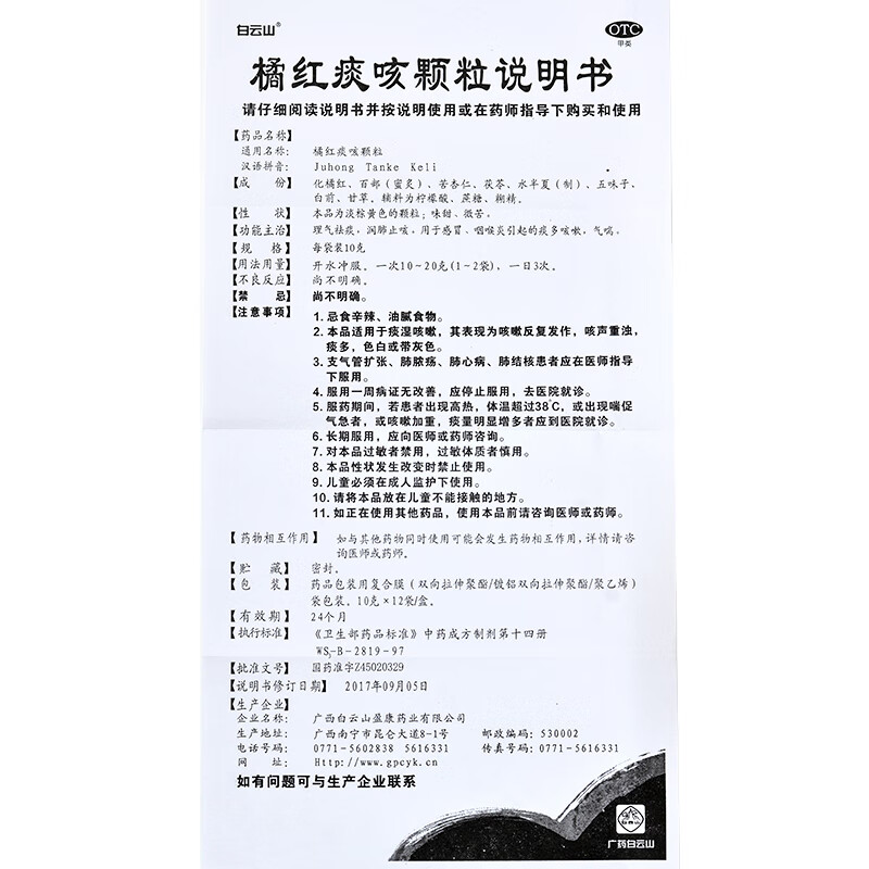 白云山 橘红痰咳颗粒 10g*12袋/盒 清肺 化痰 止咳 治疗感冒引起的痰多咳嗽 气喘