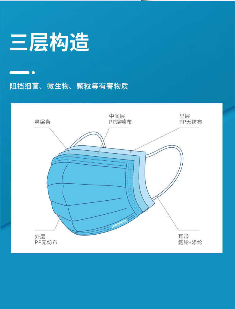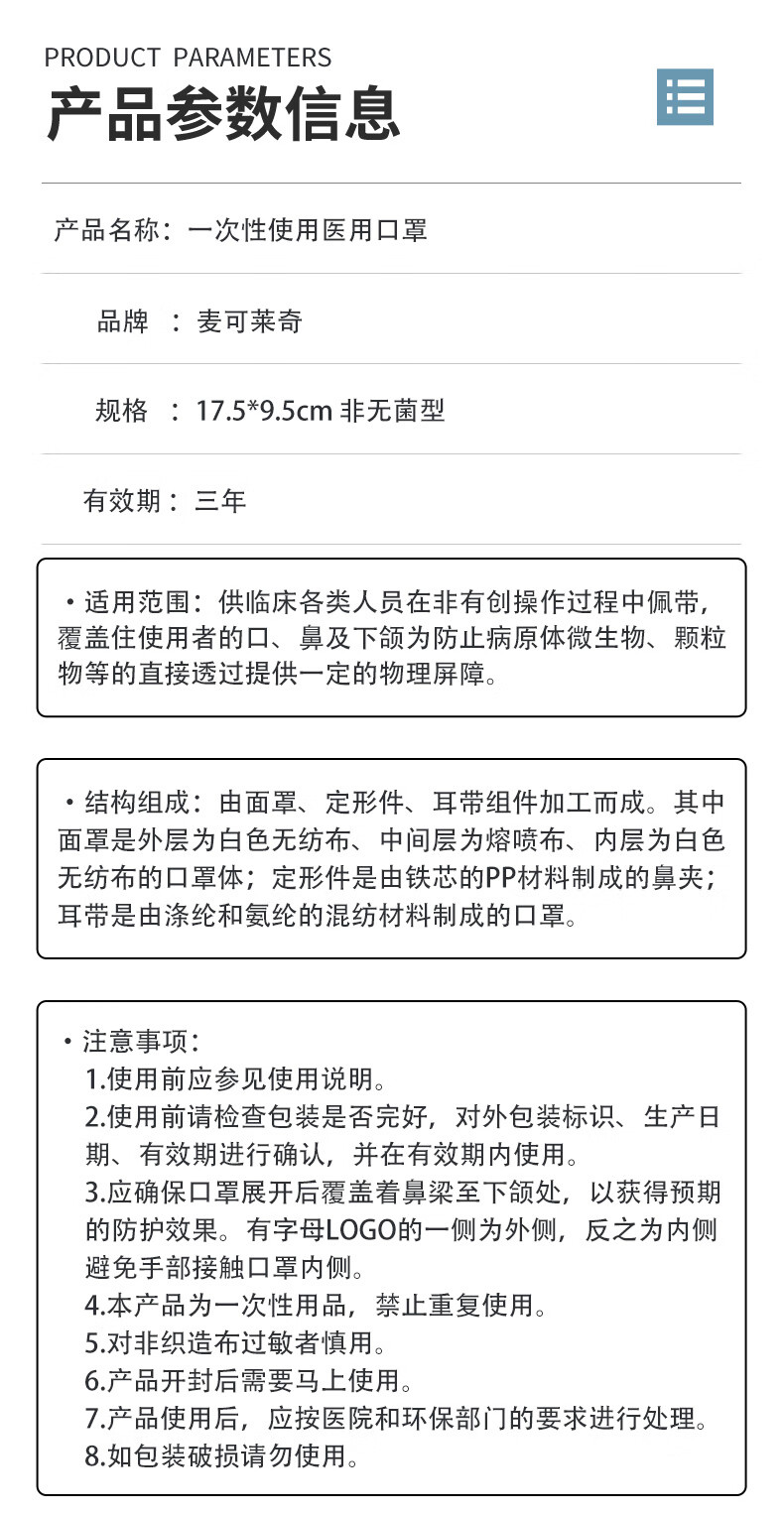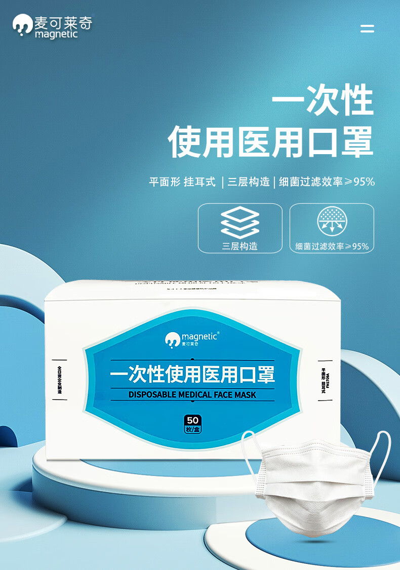 麦可莱奇一次性使用医用口罩三层过滤符合标准舒适亲肤泡泡纱耳绳符合国标 白色 50枚