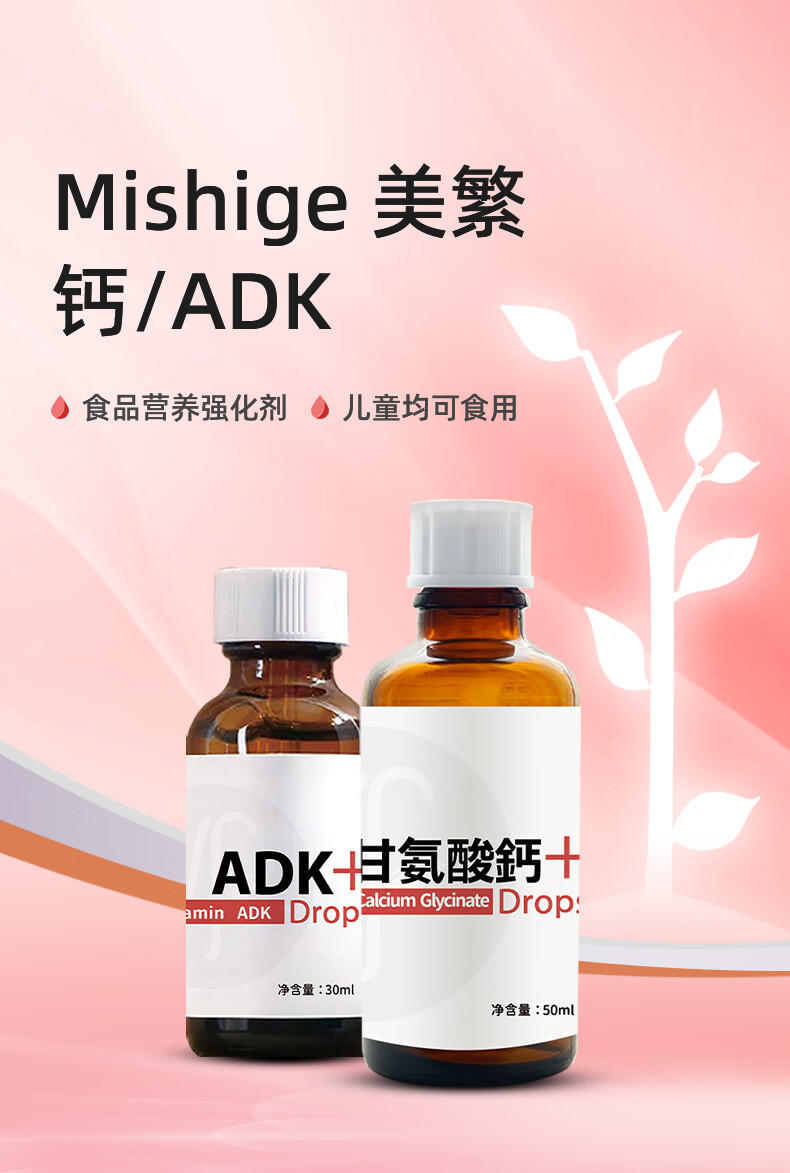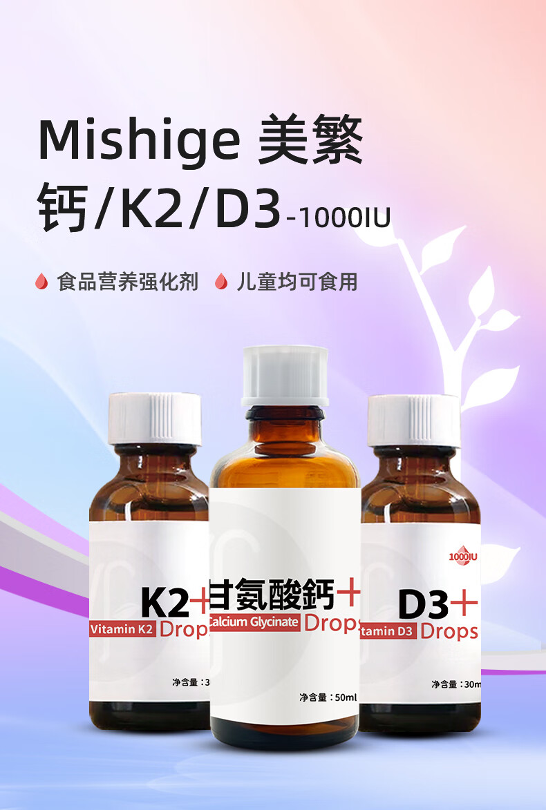 美繁Mishige甘氨酸钙+维生素D3滴剂1000IU+维生素K2 营养组合DSM原料 美繁螯合钙*1瓶+维ADK* 1瓶*1盒