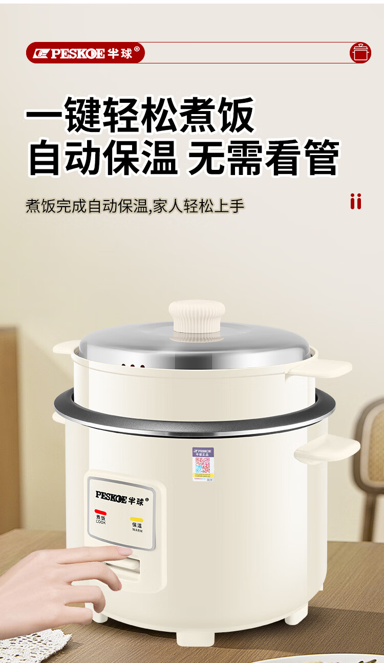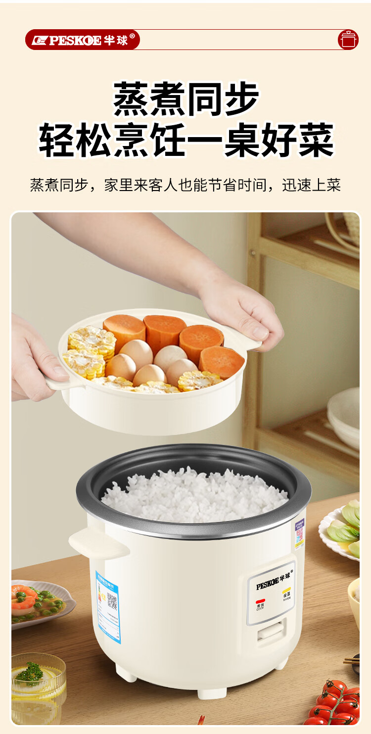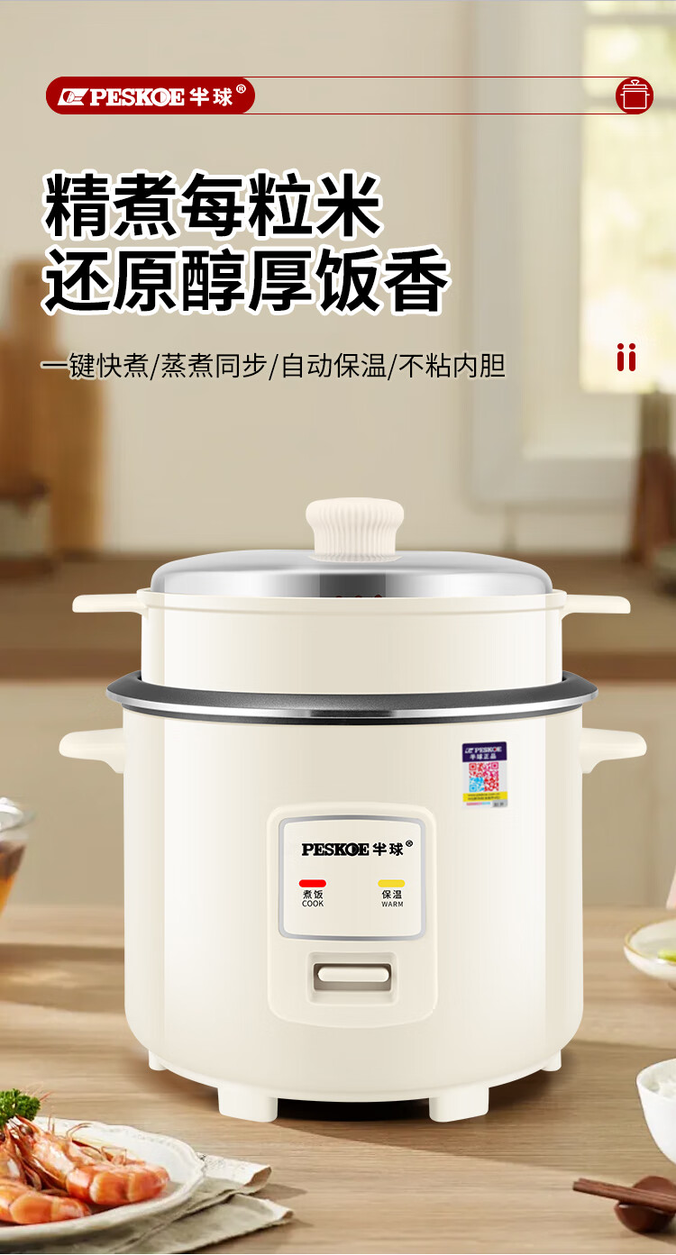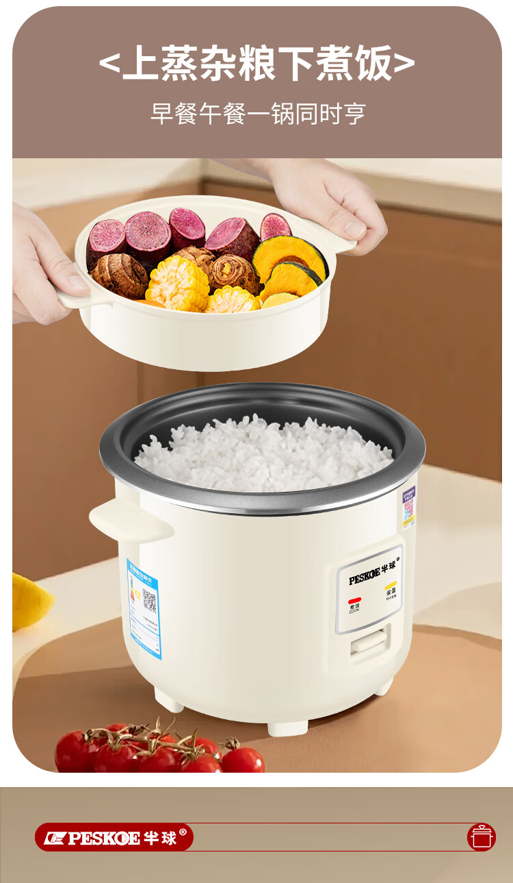 半球(PESKOE)老式电饭锅家用小型迷你学生宿舍多功能3-4人单人电饭煲1-2人不粘锅蒸煮一体5-6人大容量 2L 不粘内胆2-3人用(带蒸笼)