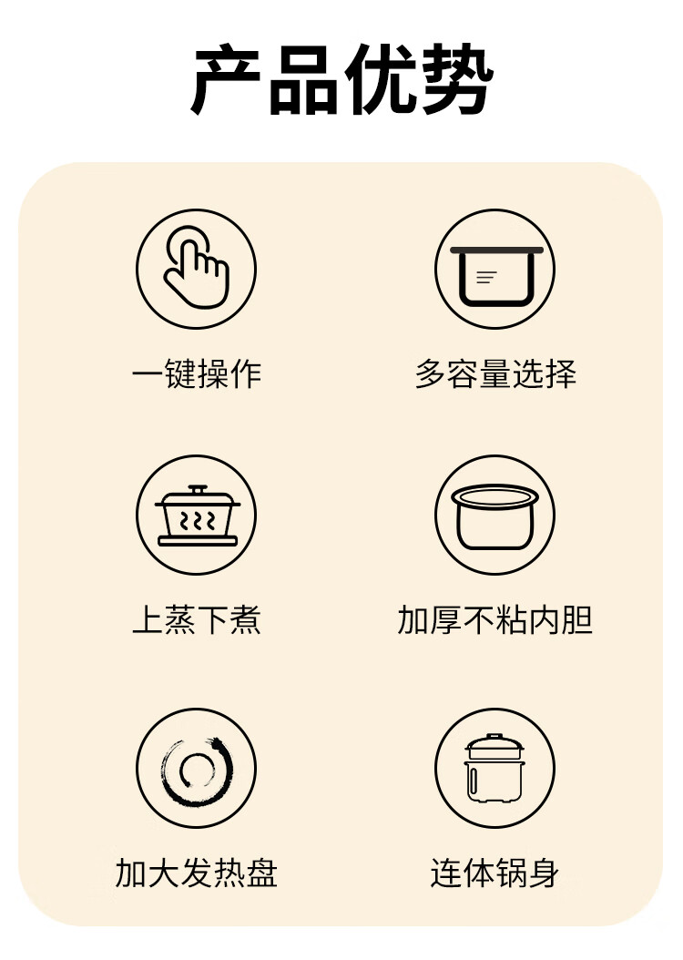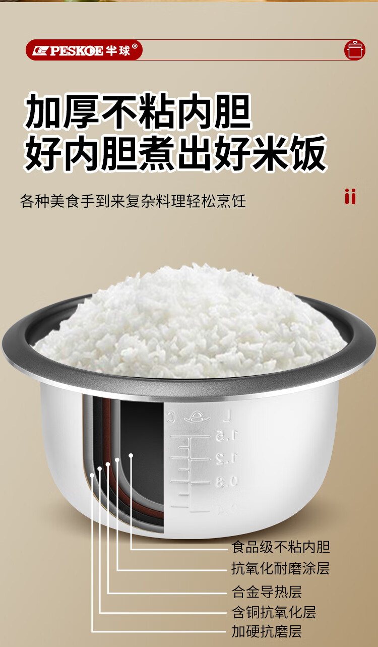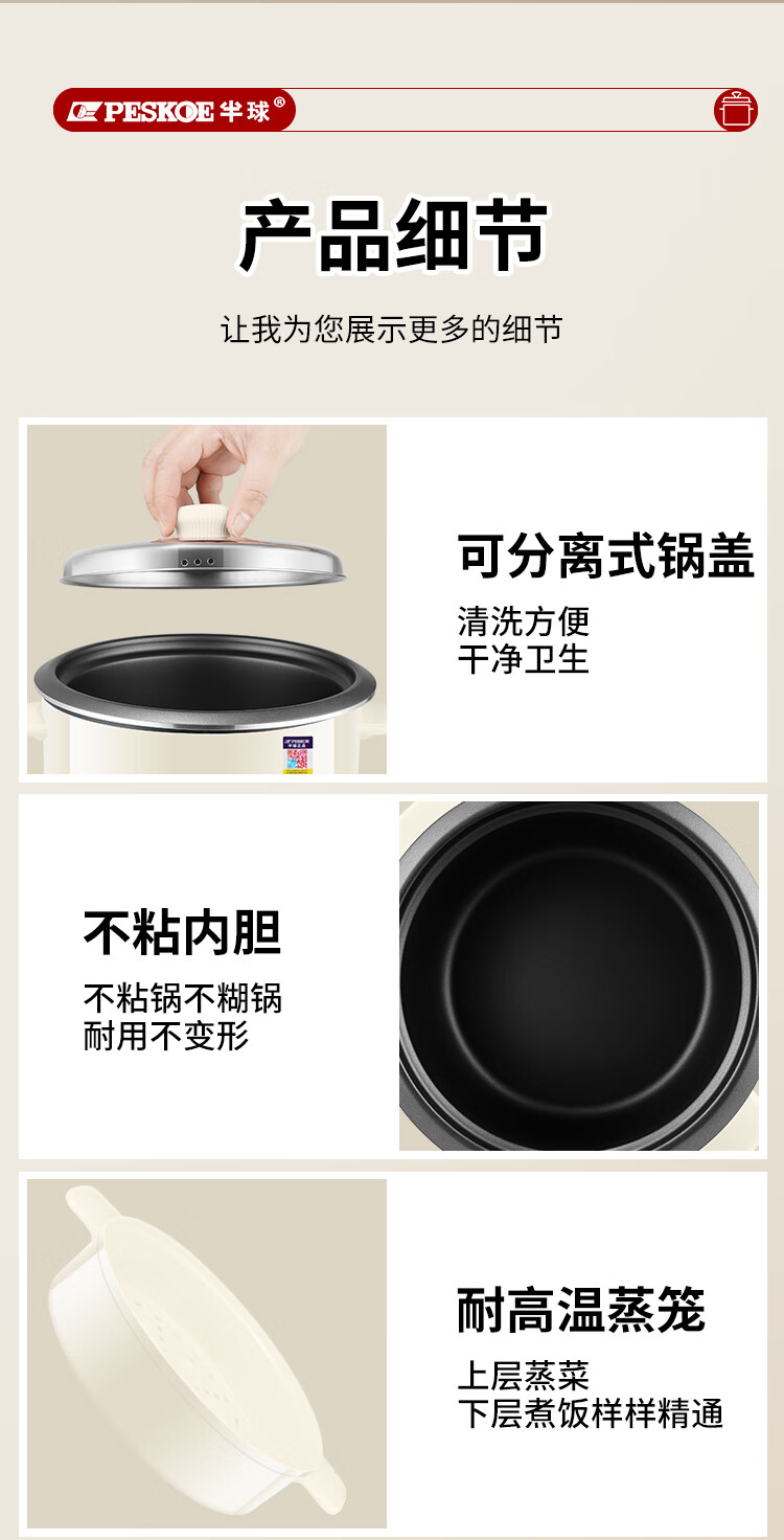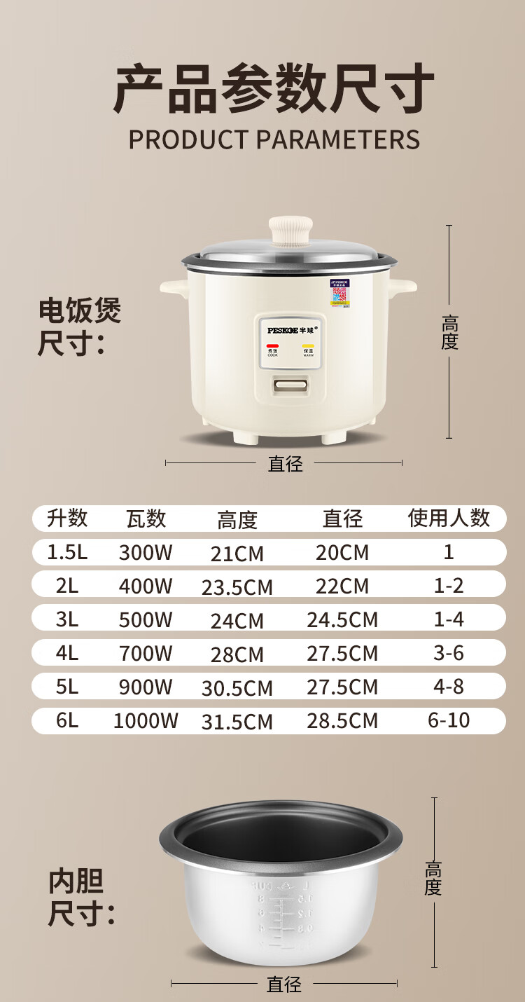半球(PESKOE)老式电饭锅家用小型迷你学生宿舍多功能3-4人单人电饭煲1-2人不粘锅蒸煮一体5-6人大容量 2L 不粘内胆2-3人用(带蒸笼)