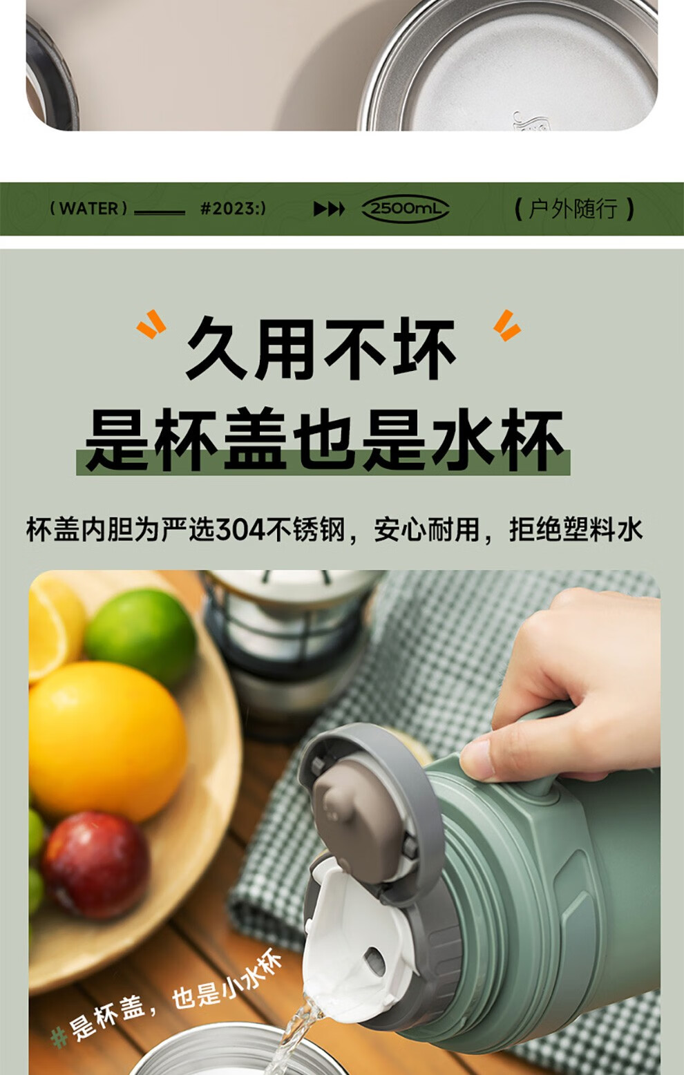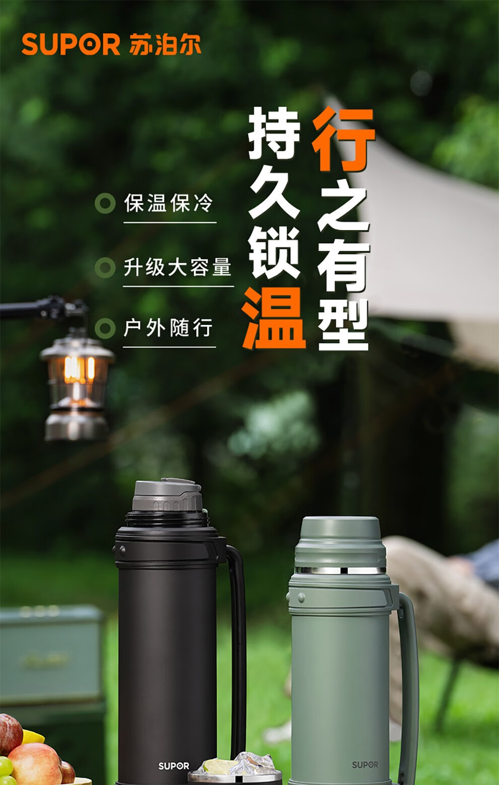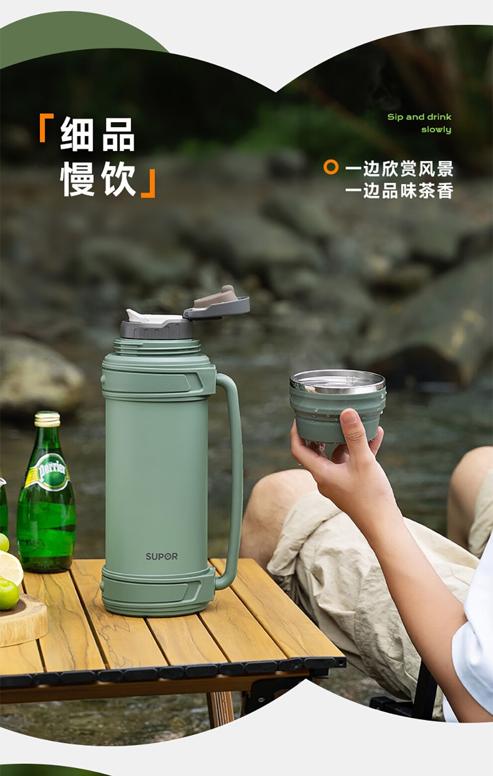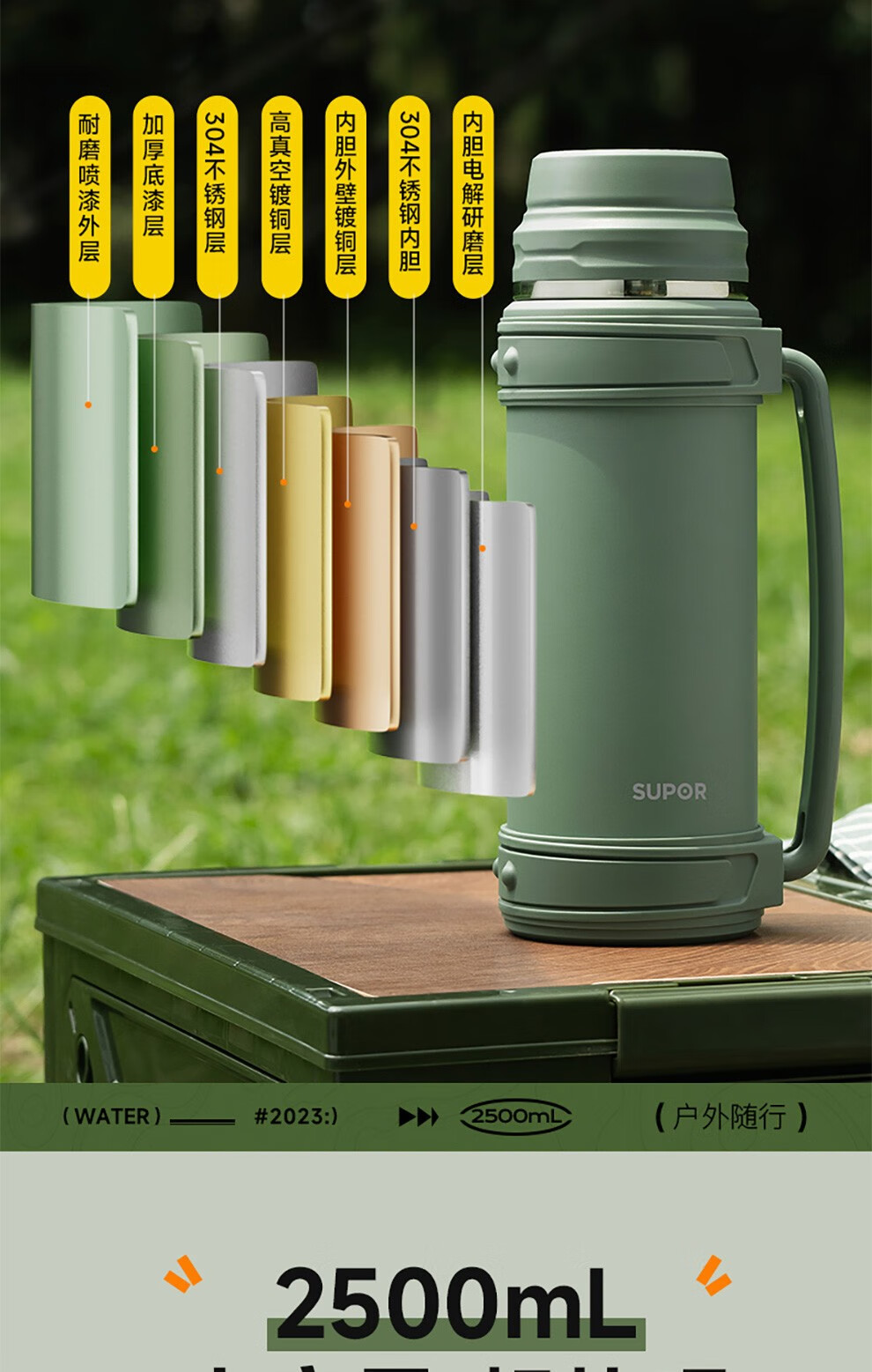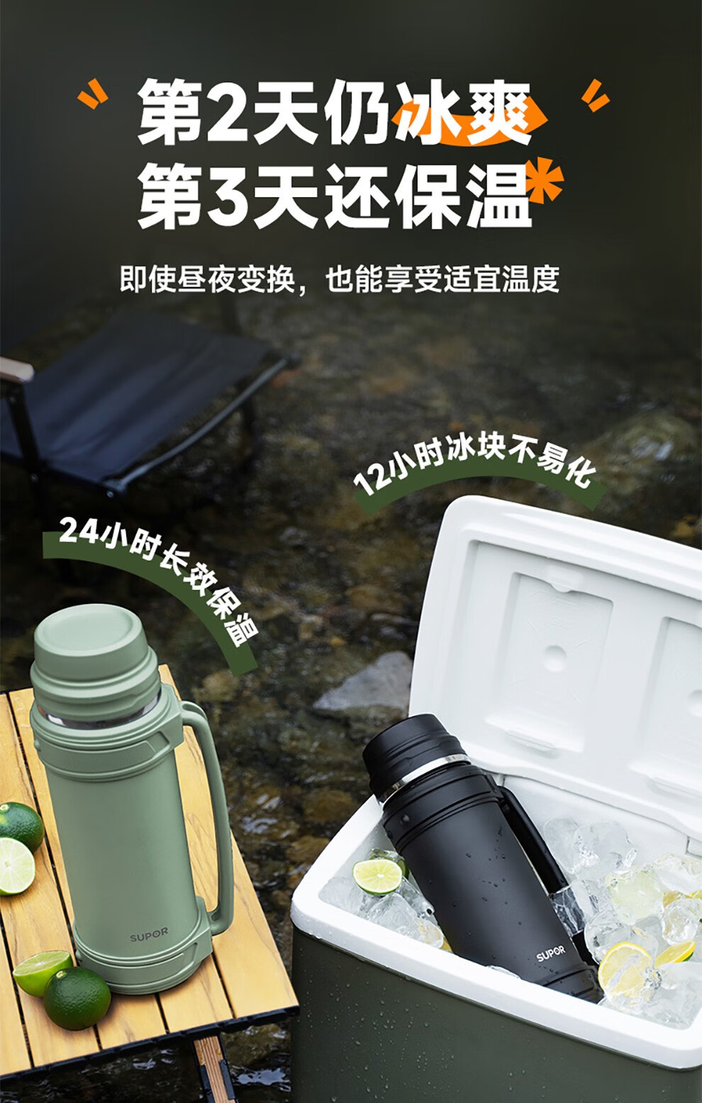 苏泊尔(SUPOR)保温壶大容量304不锈钢72小时户外旅行壶便携水壶运动水壶暖水瓶 营地绿2升约4斤水【背带+全钢杯盖】