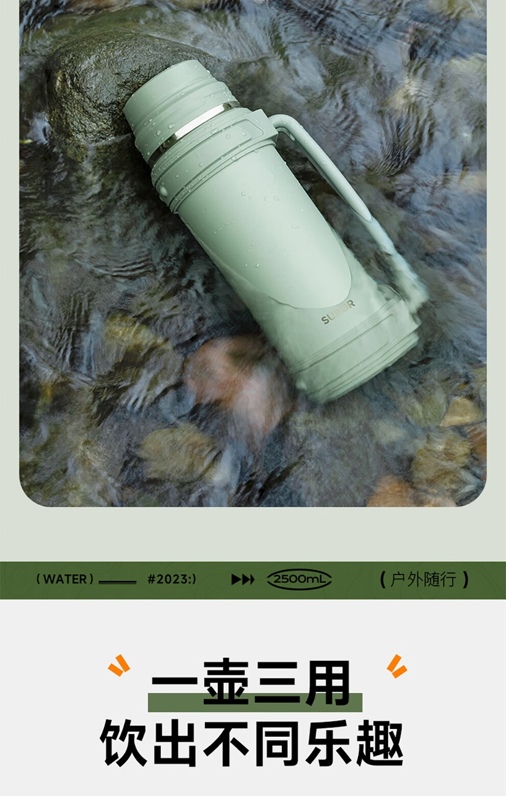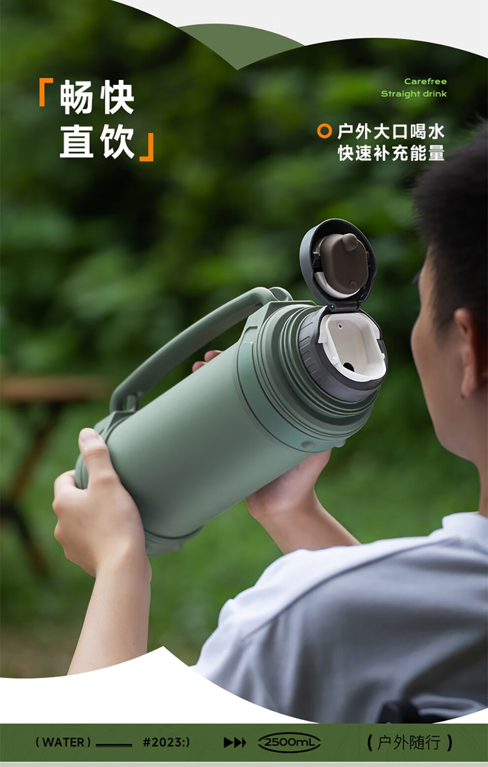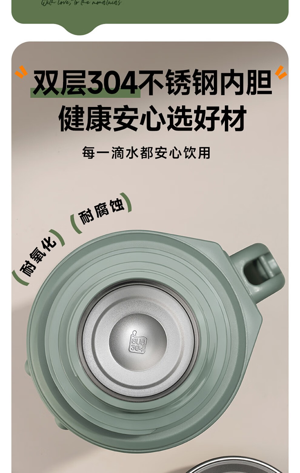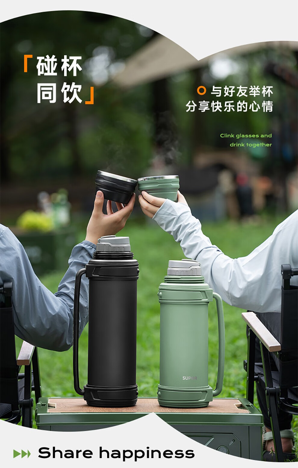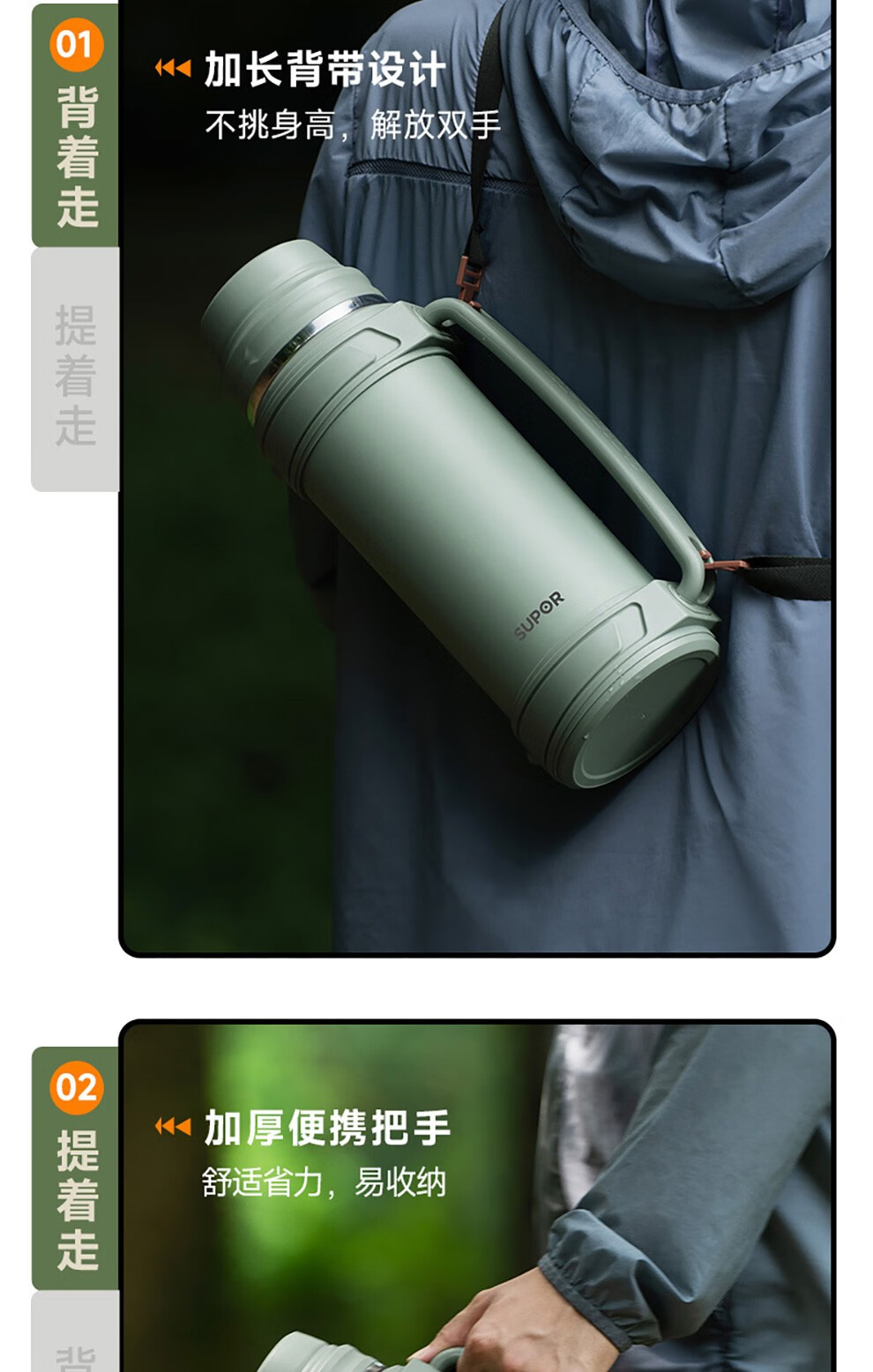 苏泊尔(SUPOR)保温壶大容量304不锈钢72小时户外旅行壶便携水壶运动水壶暖水瓶 营地绿2升约4斤水【背带+全钢杯盖】