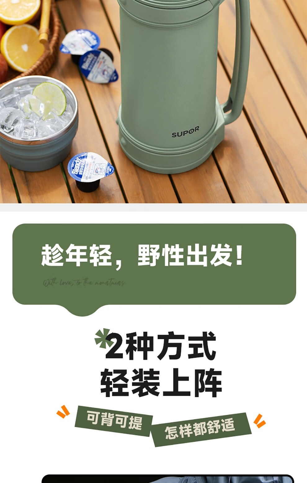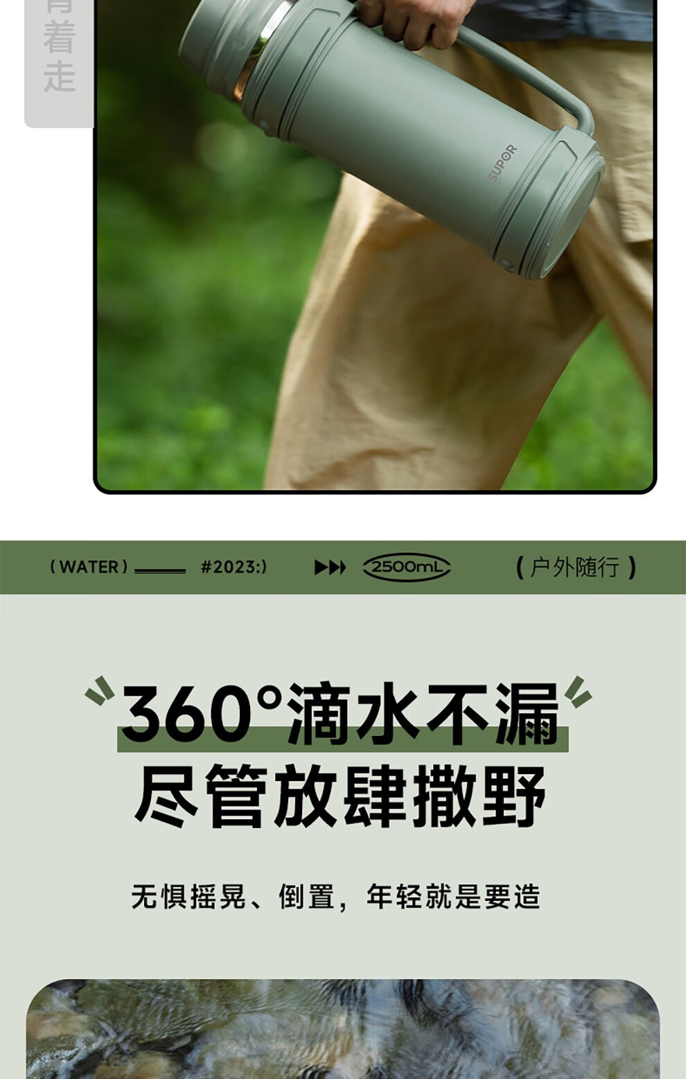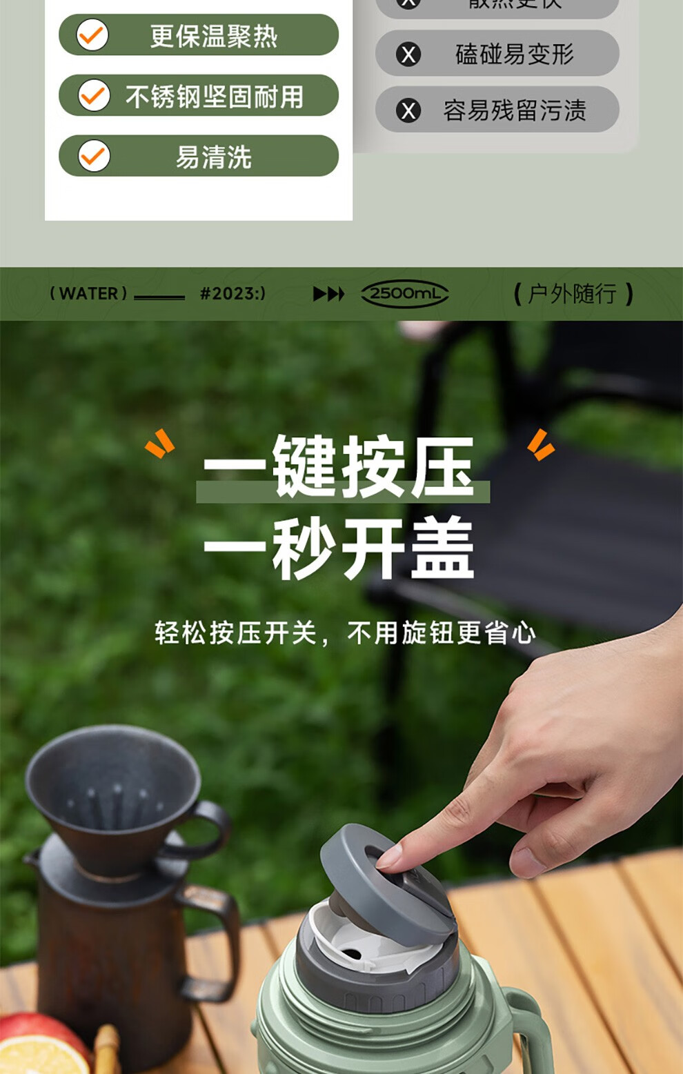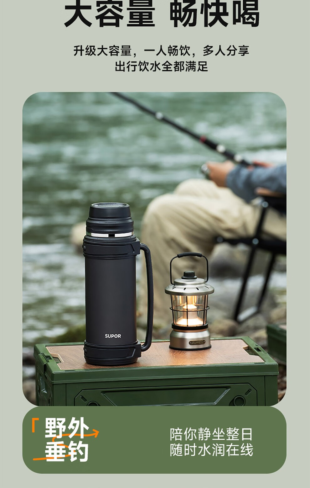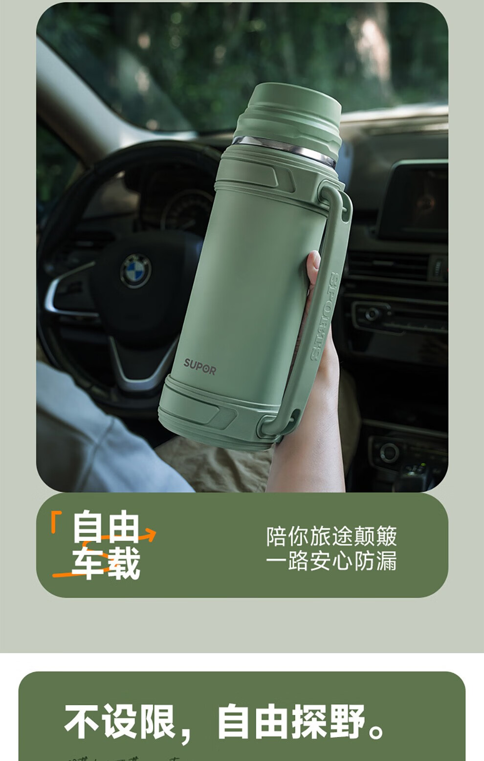 苏泊尔(SUPOR)保温壶大容量304不锈钢72小时户外旅行壶便携水壶运动水壶暖水瓶 营地绿2升约4斤水【背带+全钢杯盖】
