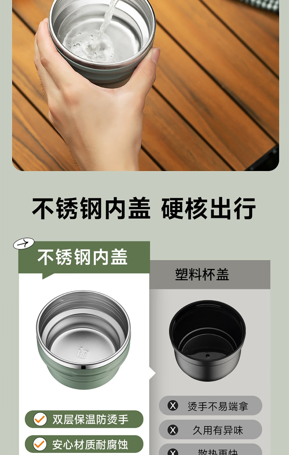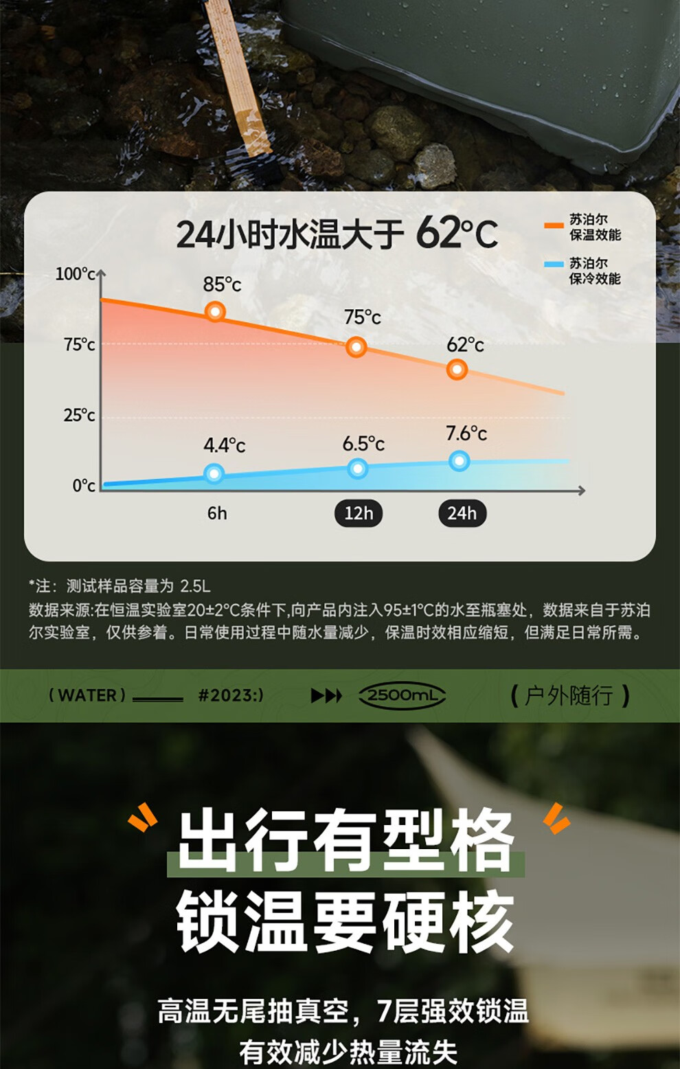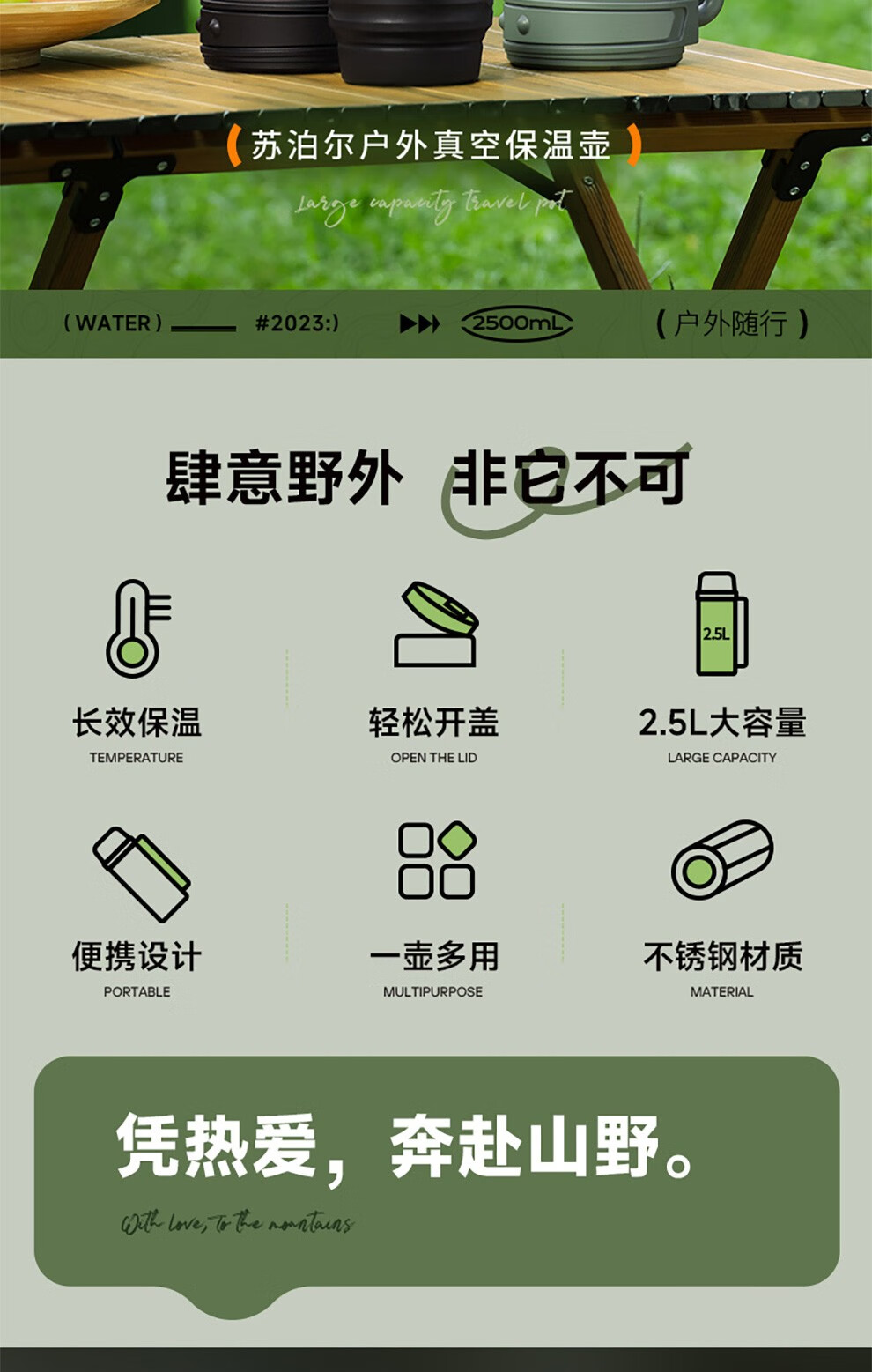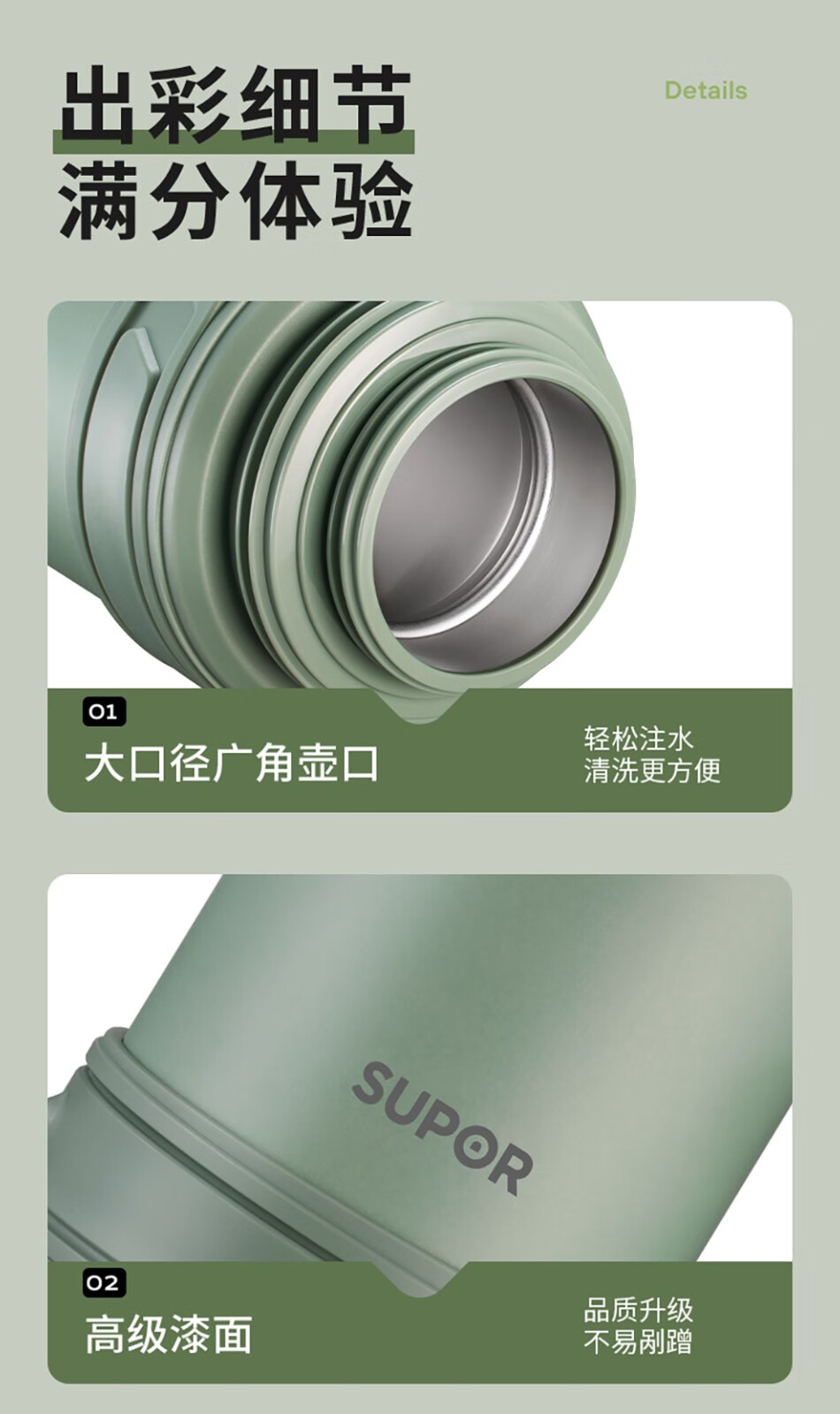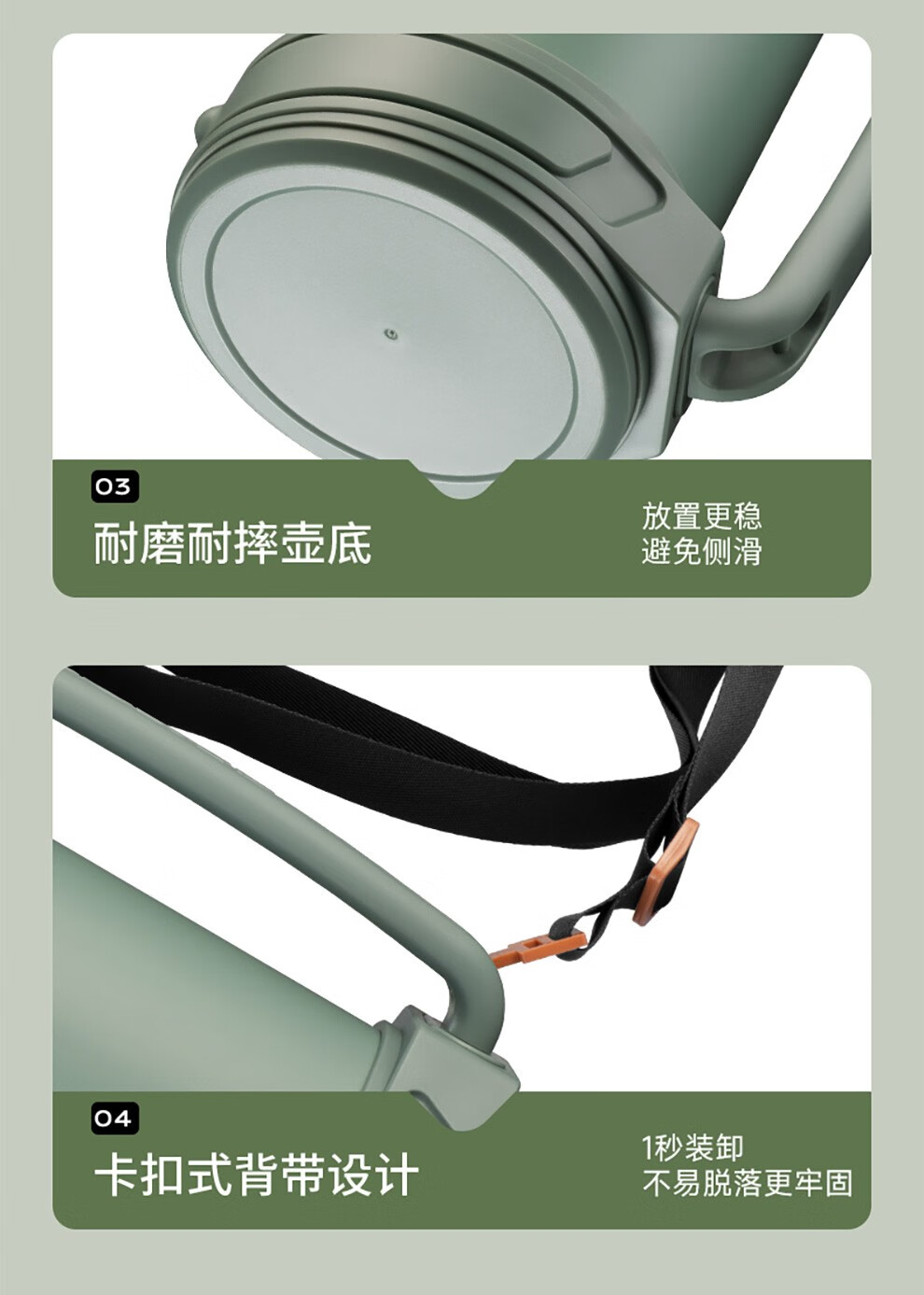 苏泊尔(SUPOR)保温壶大容量304不锈钢72小时户外旅行壶便携水壶运动水壶暖水瓶 营地绿2升约4斤水【背带+全钢杯盖】