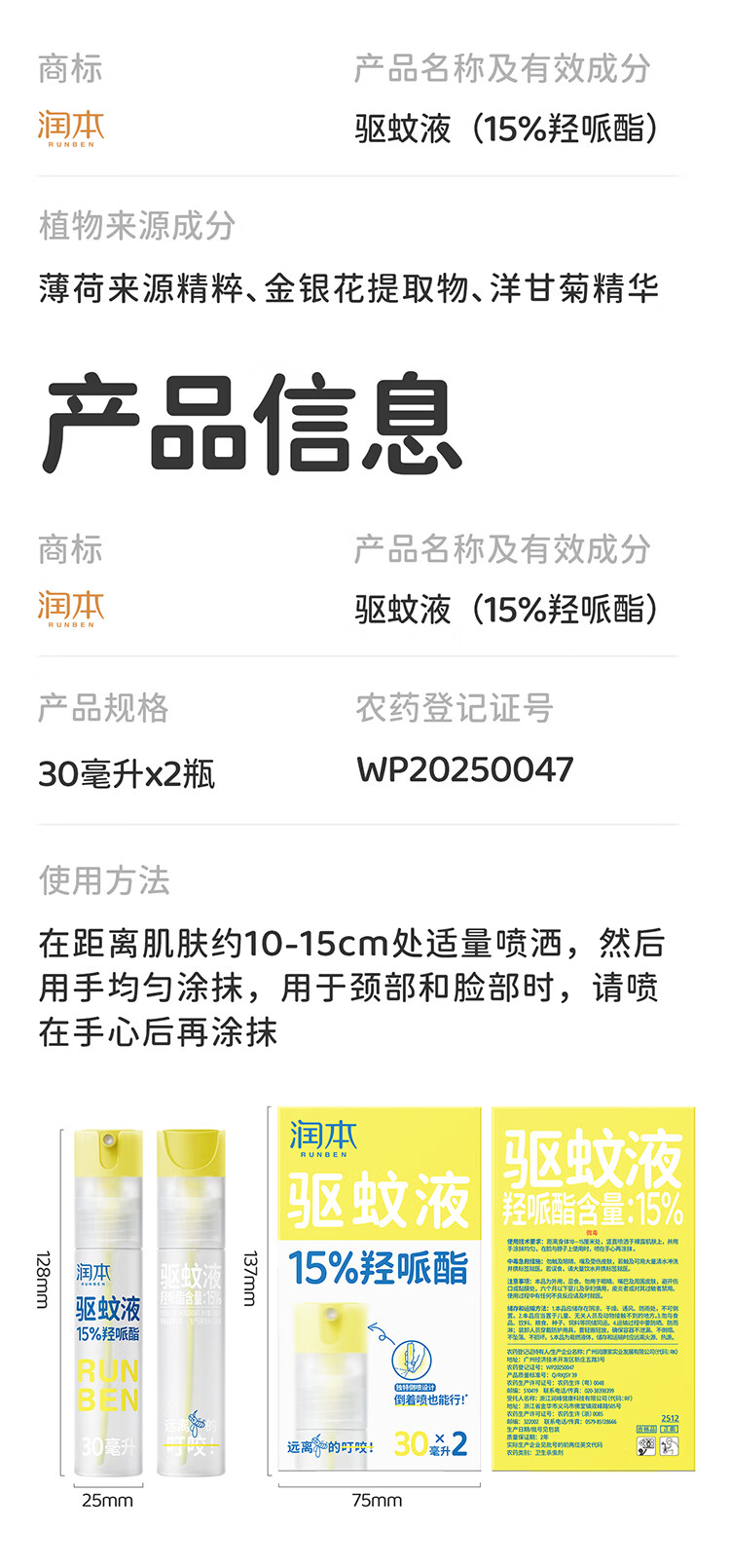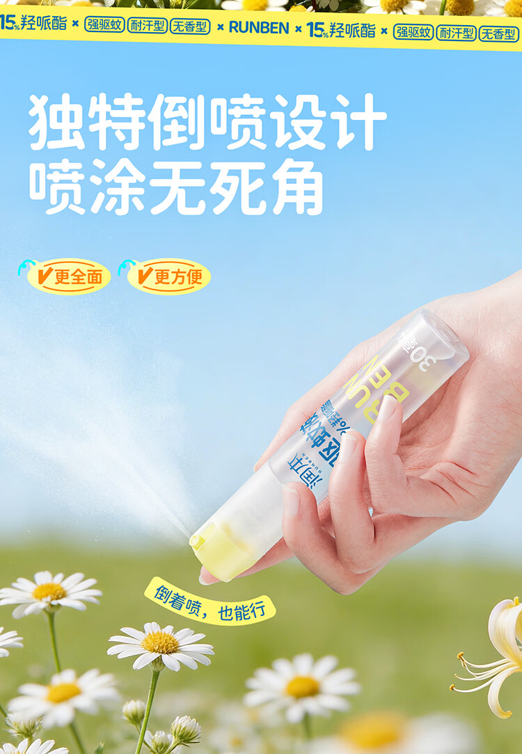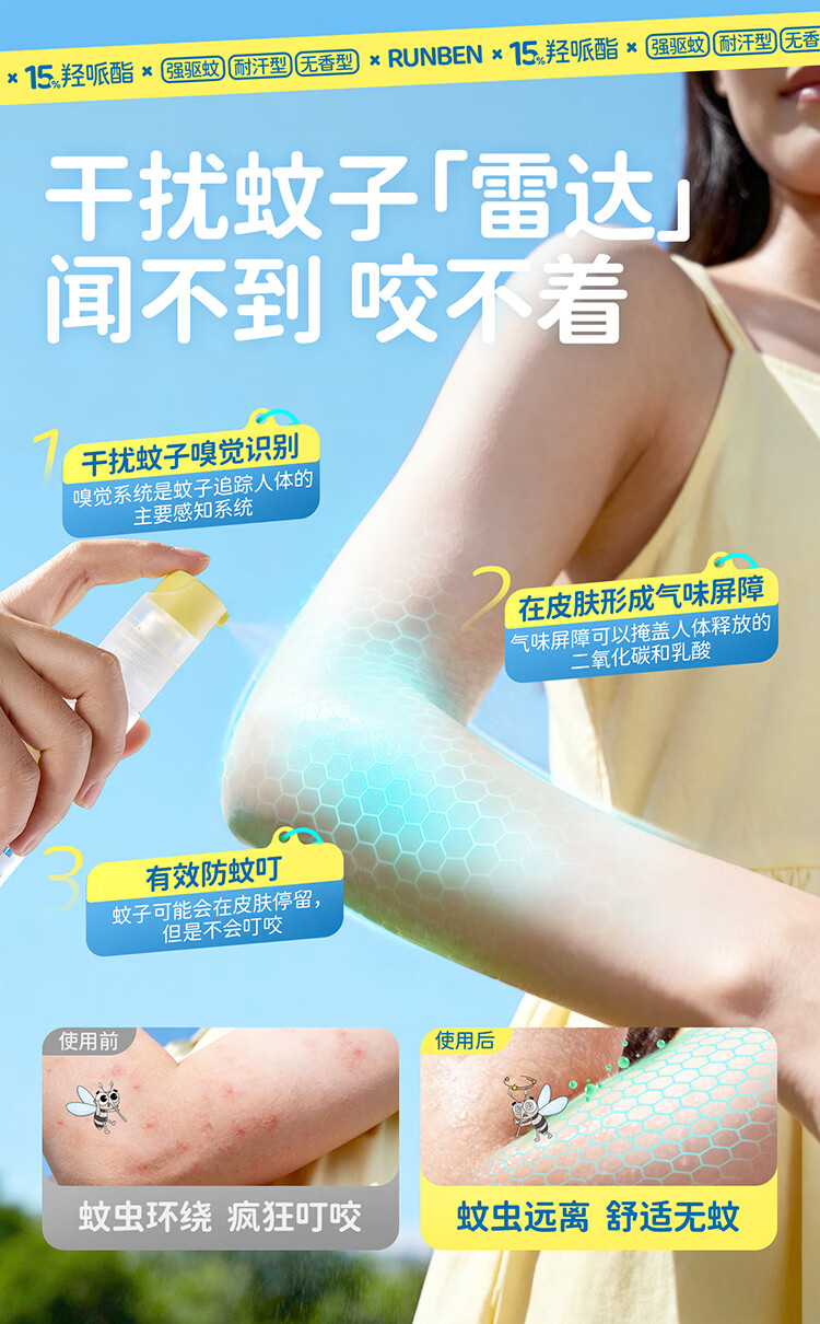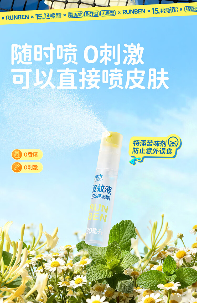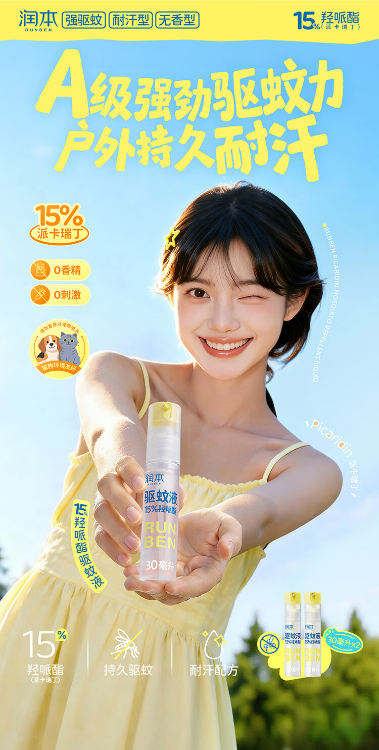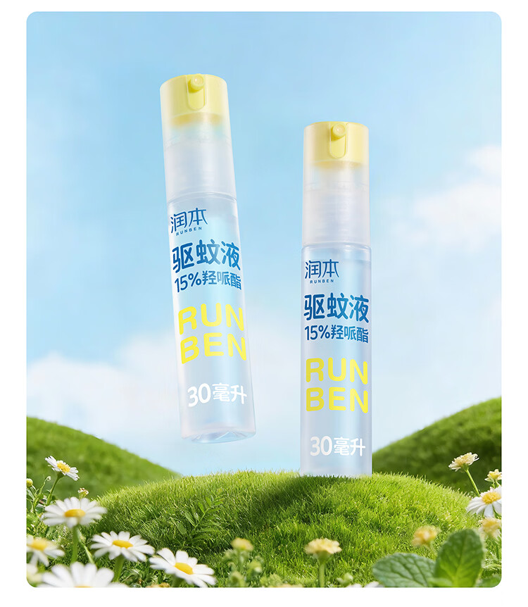 润本(RUNBEN)驱蚊液驱蚊喷雾花露水户外防蚊虫叮咬驱蚊水15%派卡瑞丁30ml*2 [15%羟哌酯-强劲驱蚊8h]30ml*2