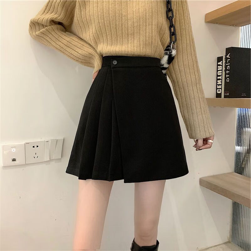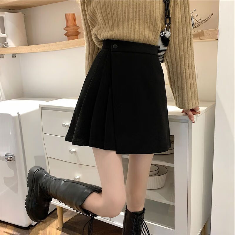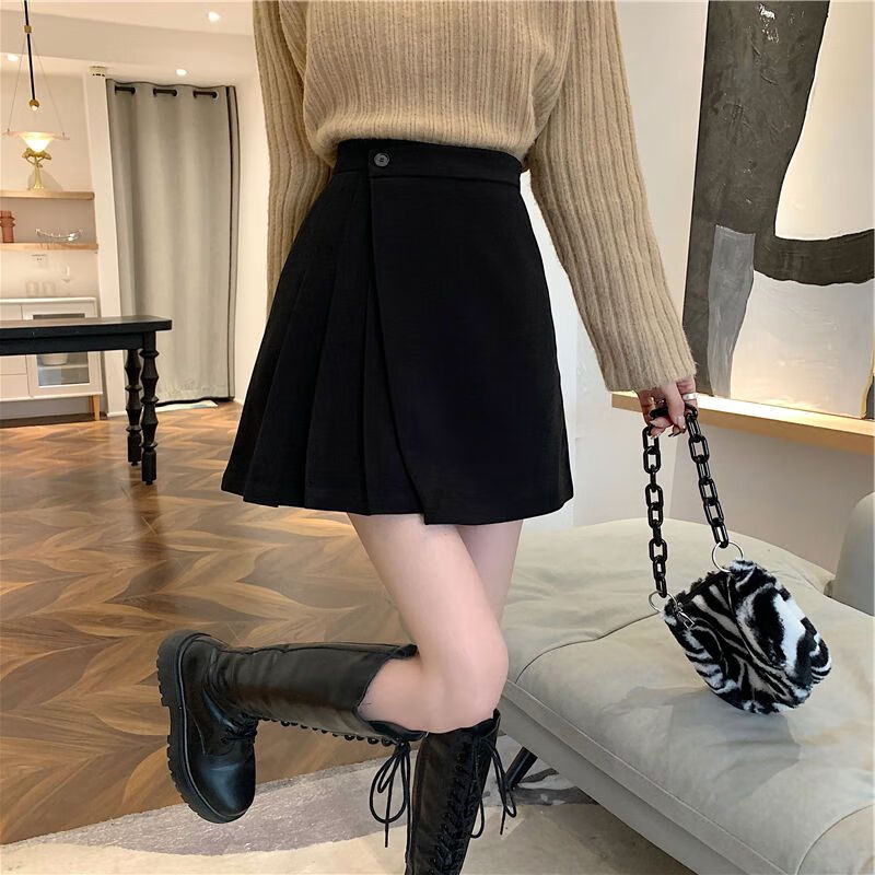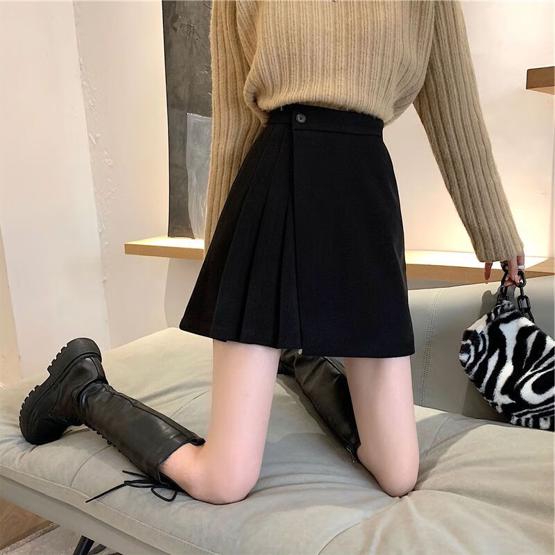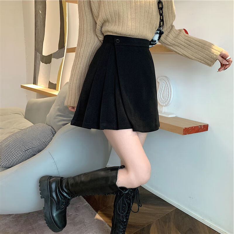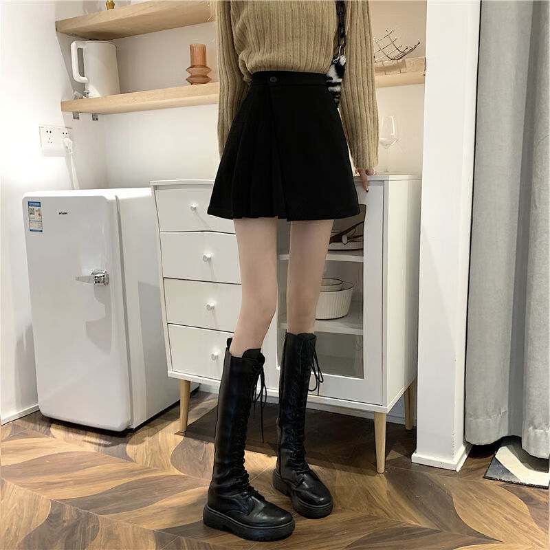 皮尔卡丹(pierre cardin)毛呢百褶裙春秋不规则半身裙子新款a字高腰显瘦包臀短裙 黑色 M码:建议100-110斤