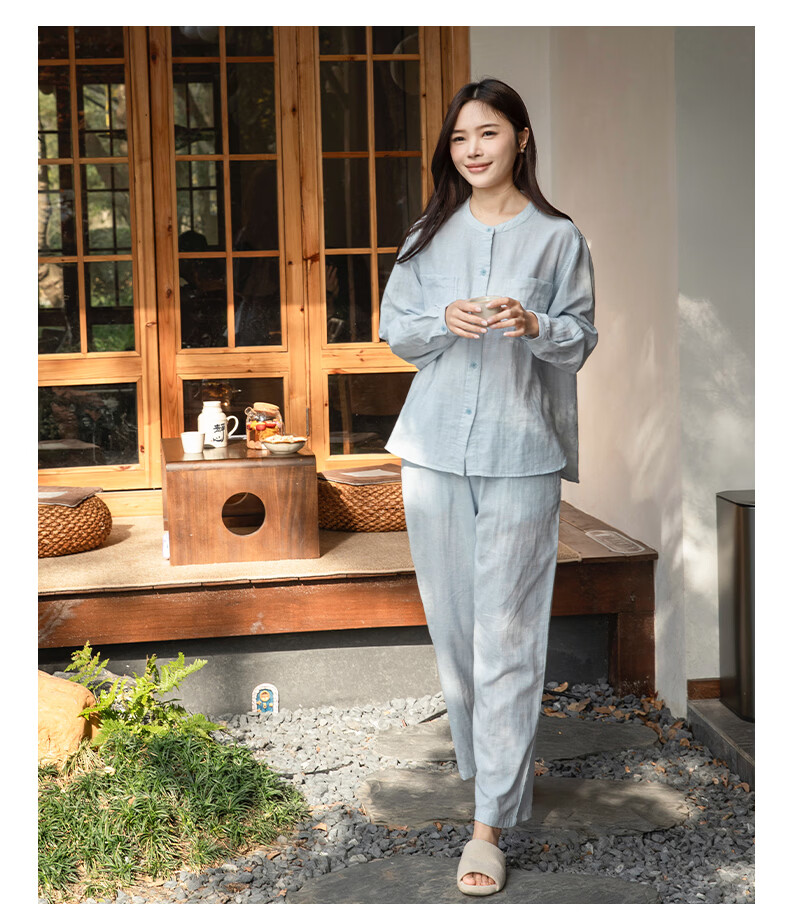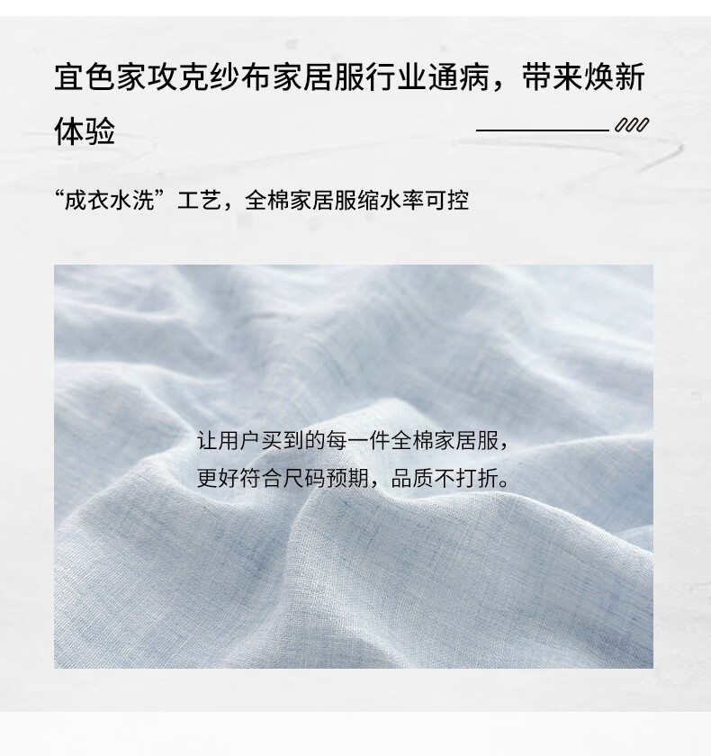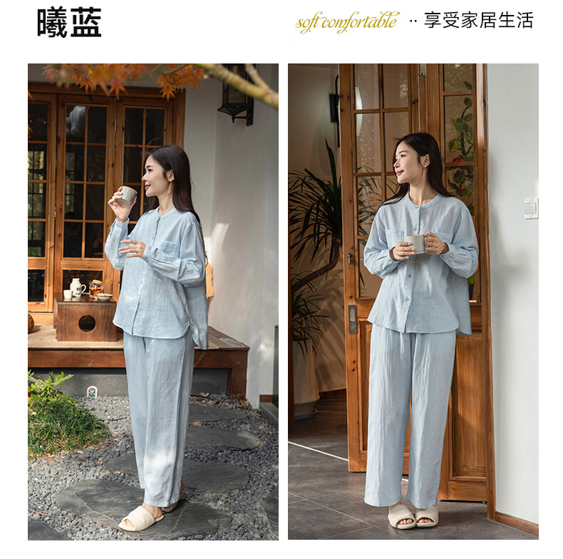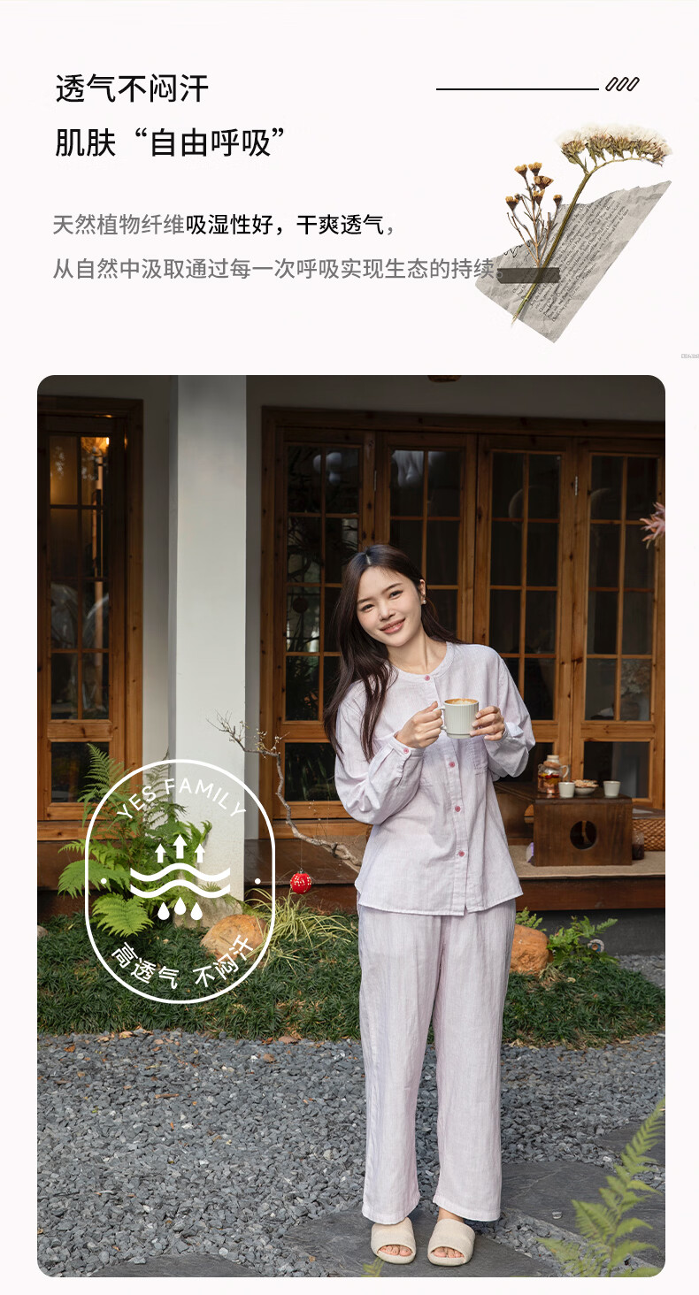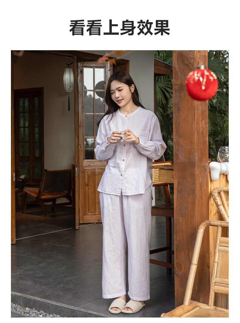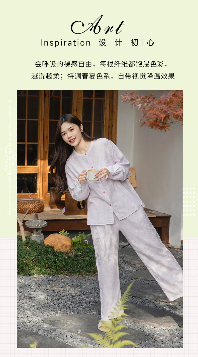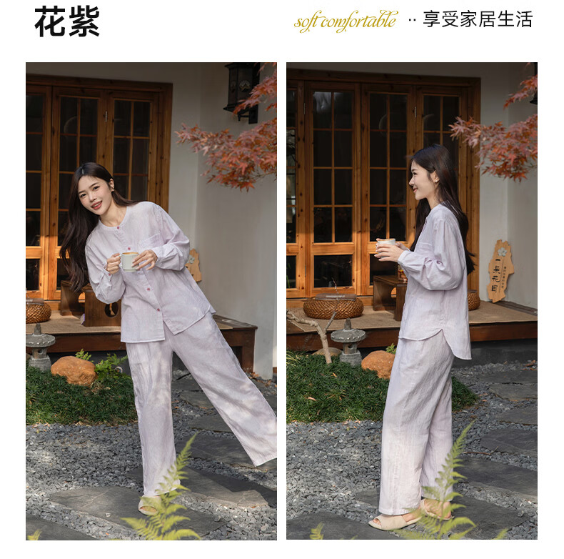 宜色家女士纯棉睡衣双层棉纱家居服 V领七分袖带胸垫A类透气宽松抗静电 薰衣草 M (女80-120斤)