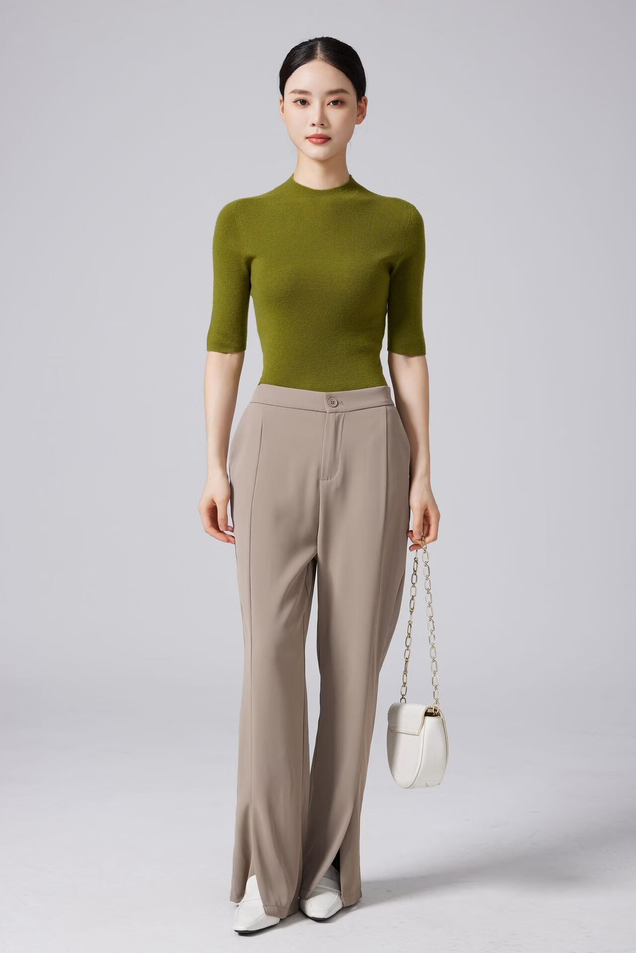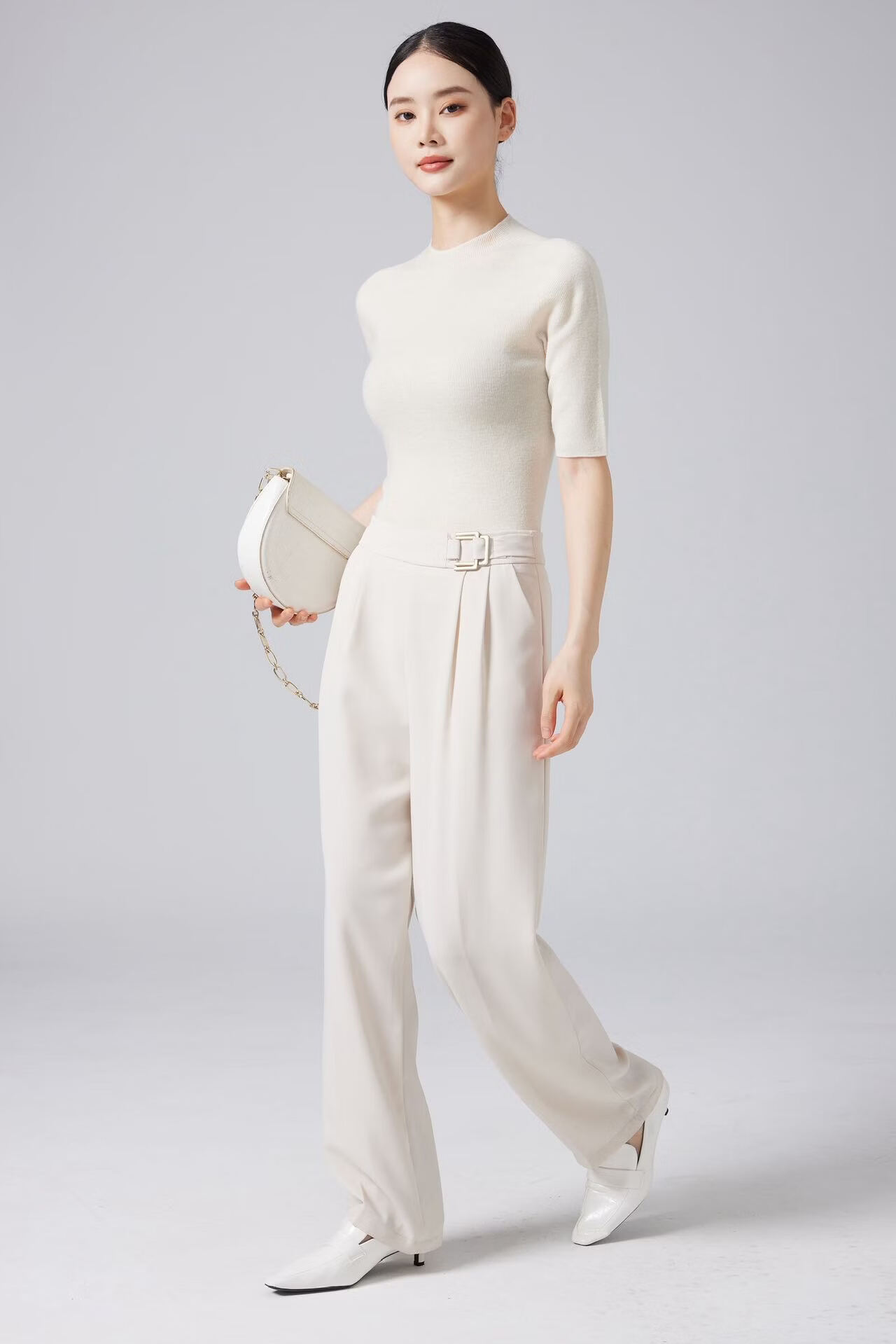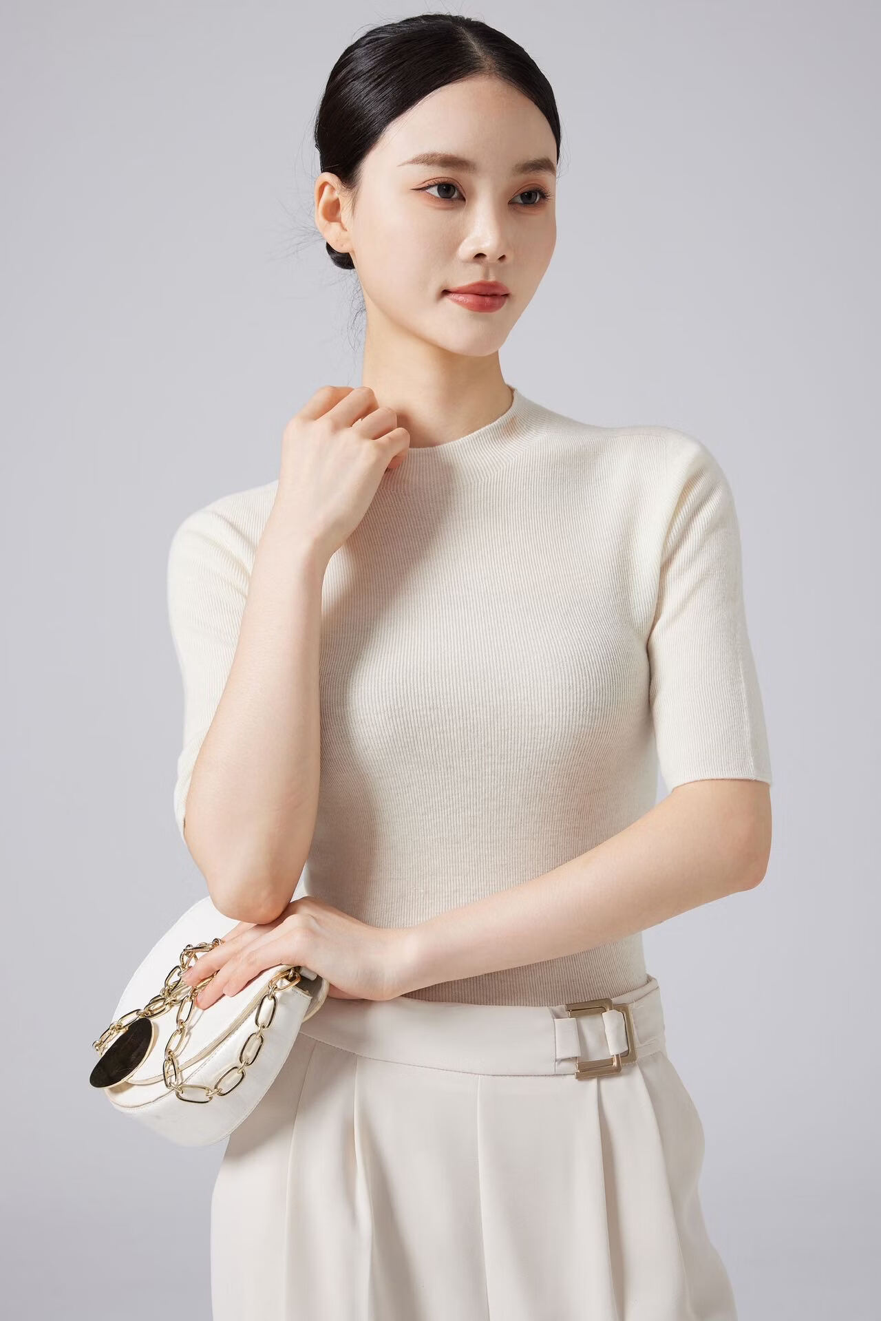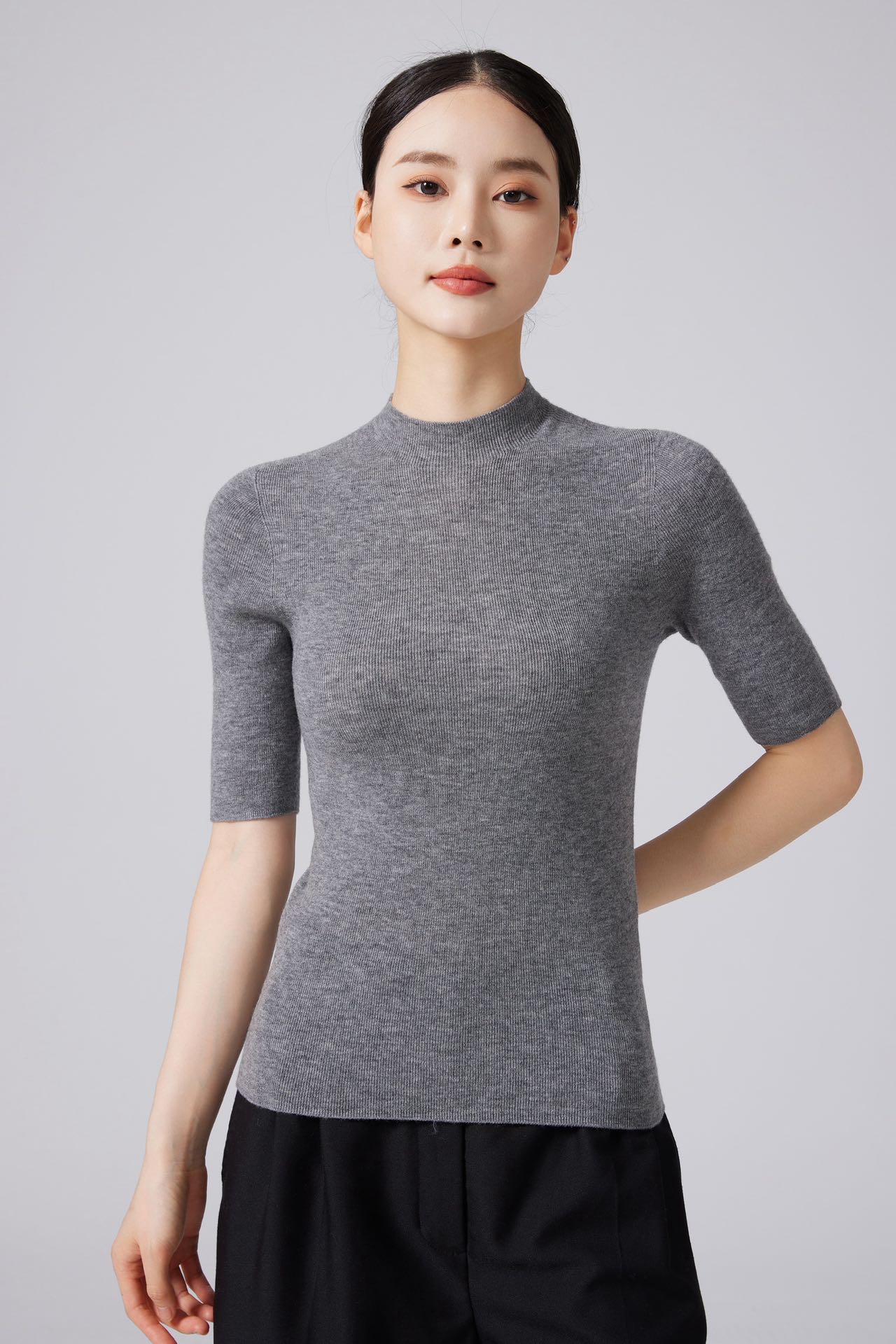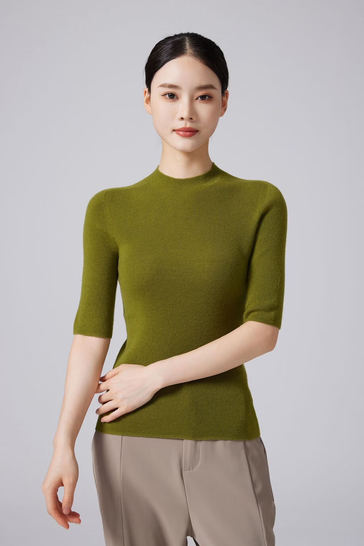 【京东直采】100羊毛半高领五分袖无缝女短袖打底针织衫t恤上衣 白色 S 体重【90-110斤】