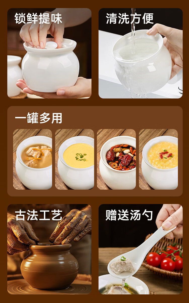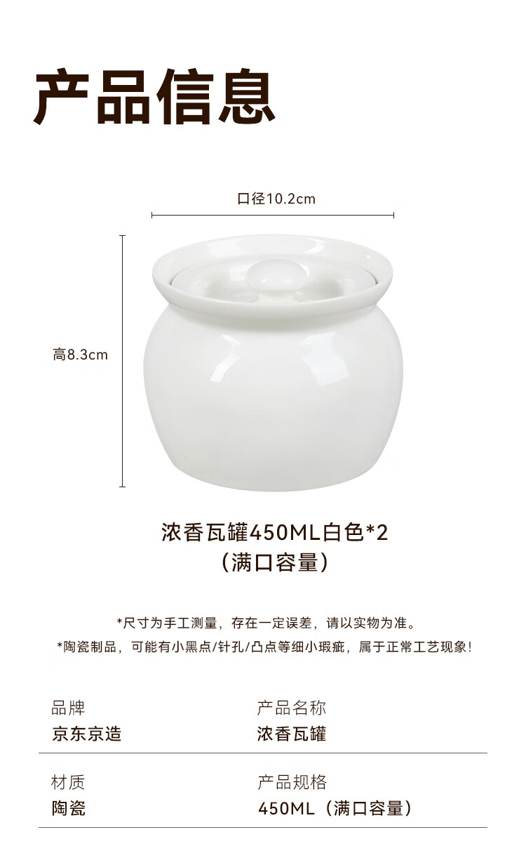 京东京造 炖盅【传统瓦罐】陶瓷蒸蛋辅食带盖赠勺子 瓦罐450ML白色2只装