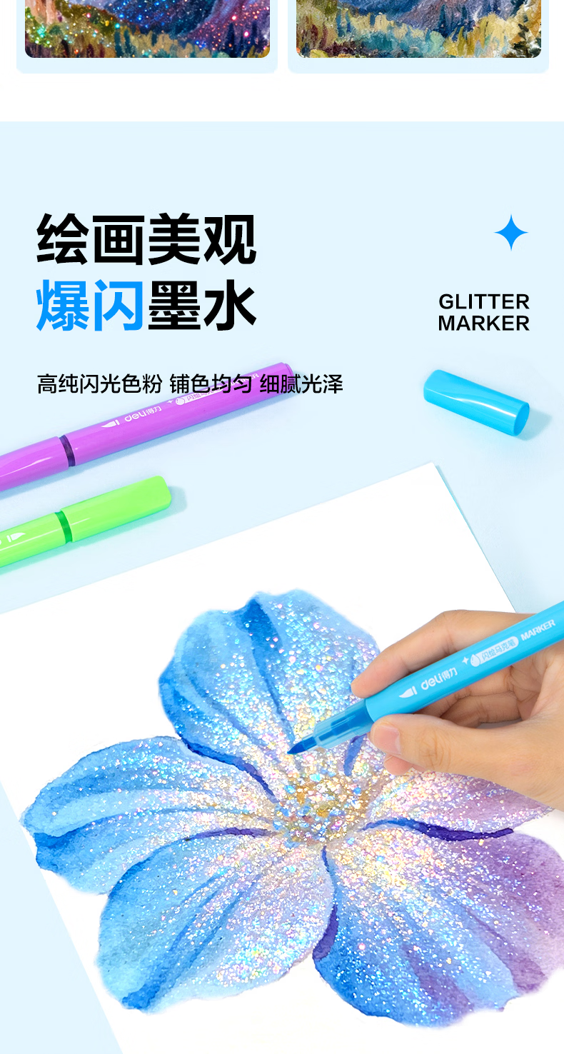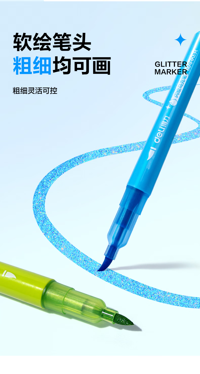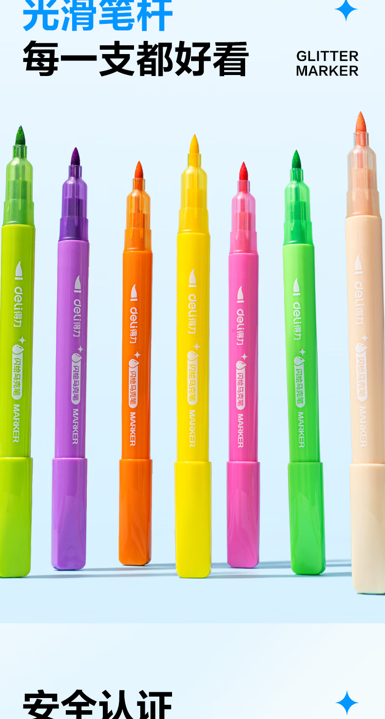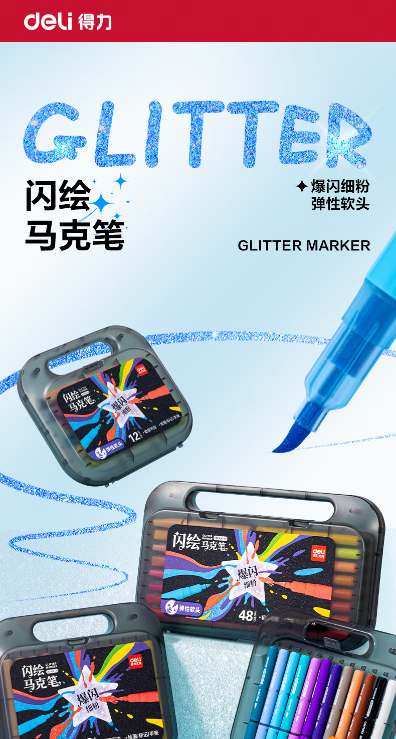 得力(deli)闪光软头丙烯马克笔学生美术专用不透色可叠色爆闪水性彩色笔画笔儿童文具颜料记号笔 软绘闪光马克笔-12色