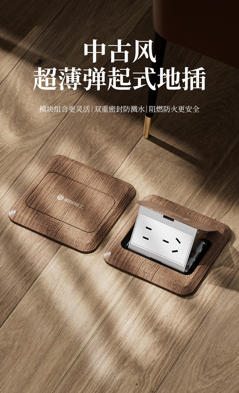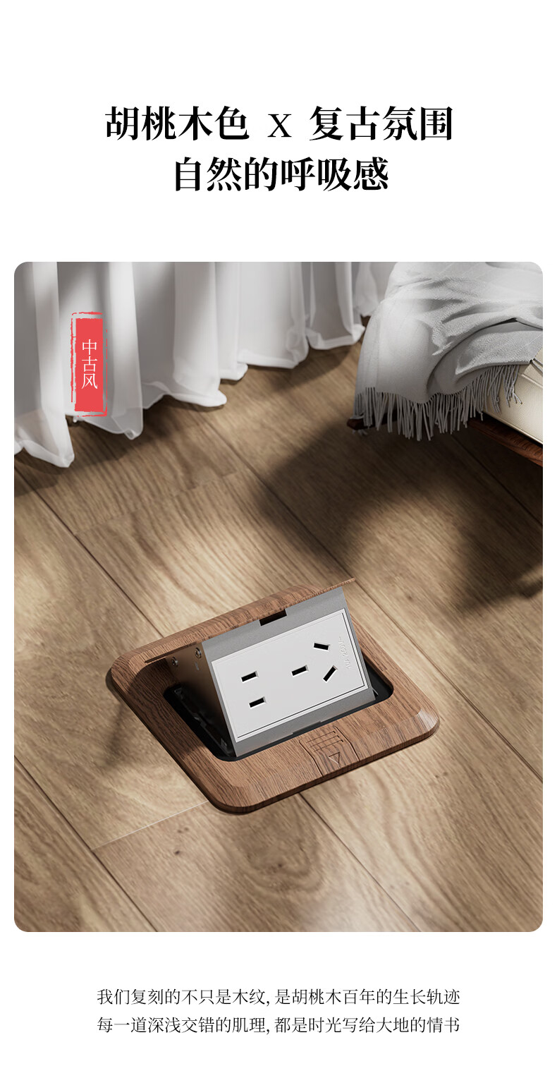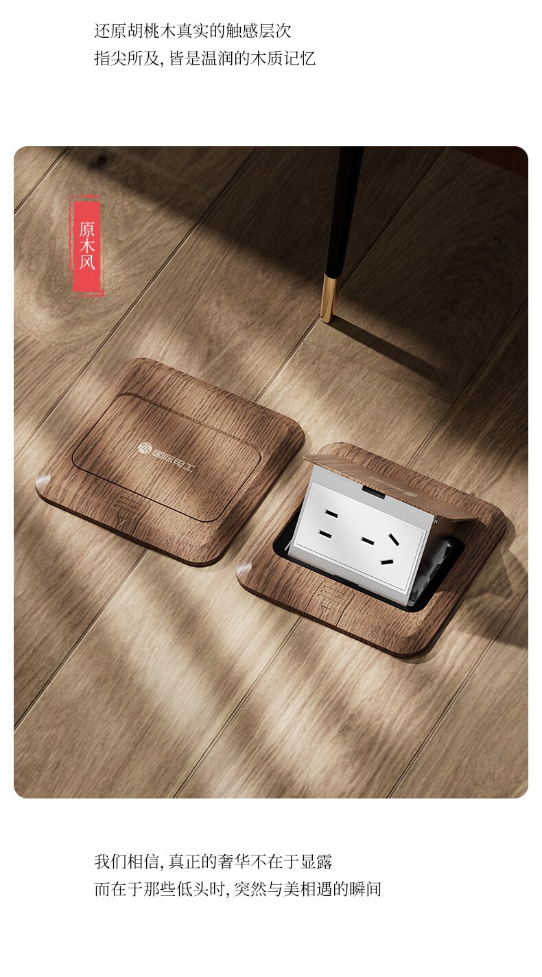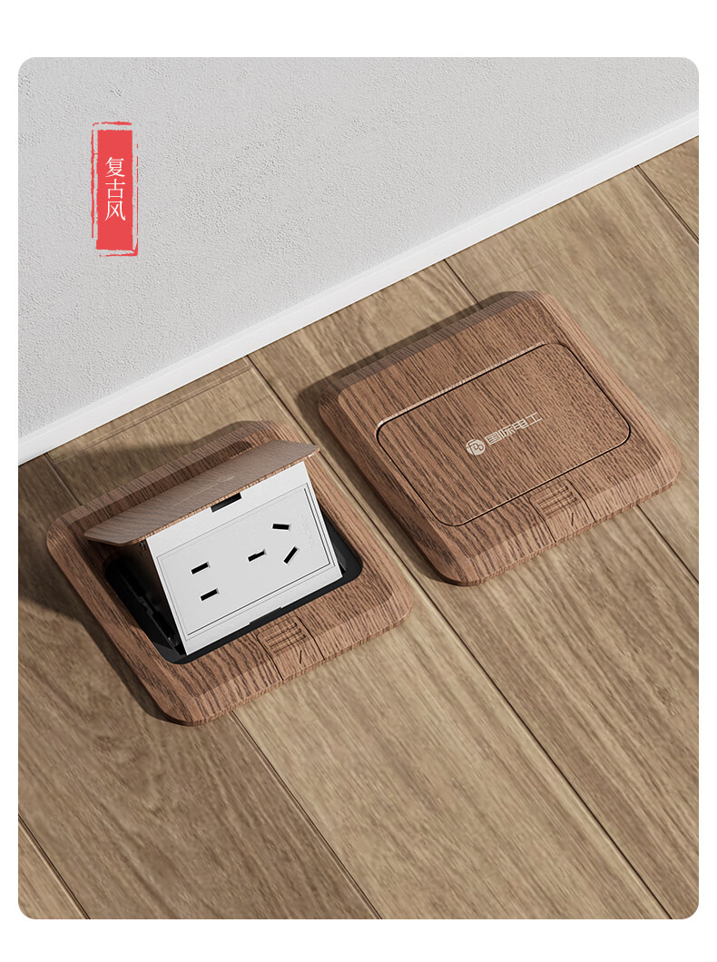 国际电工中古风超薄弹起式地插120型地面复古插座不锈钢防水暗盒地插盒 胡桃木-五孔插座