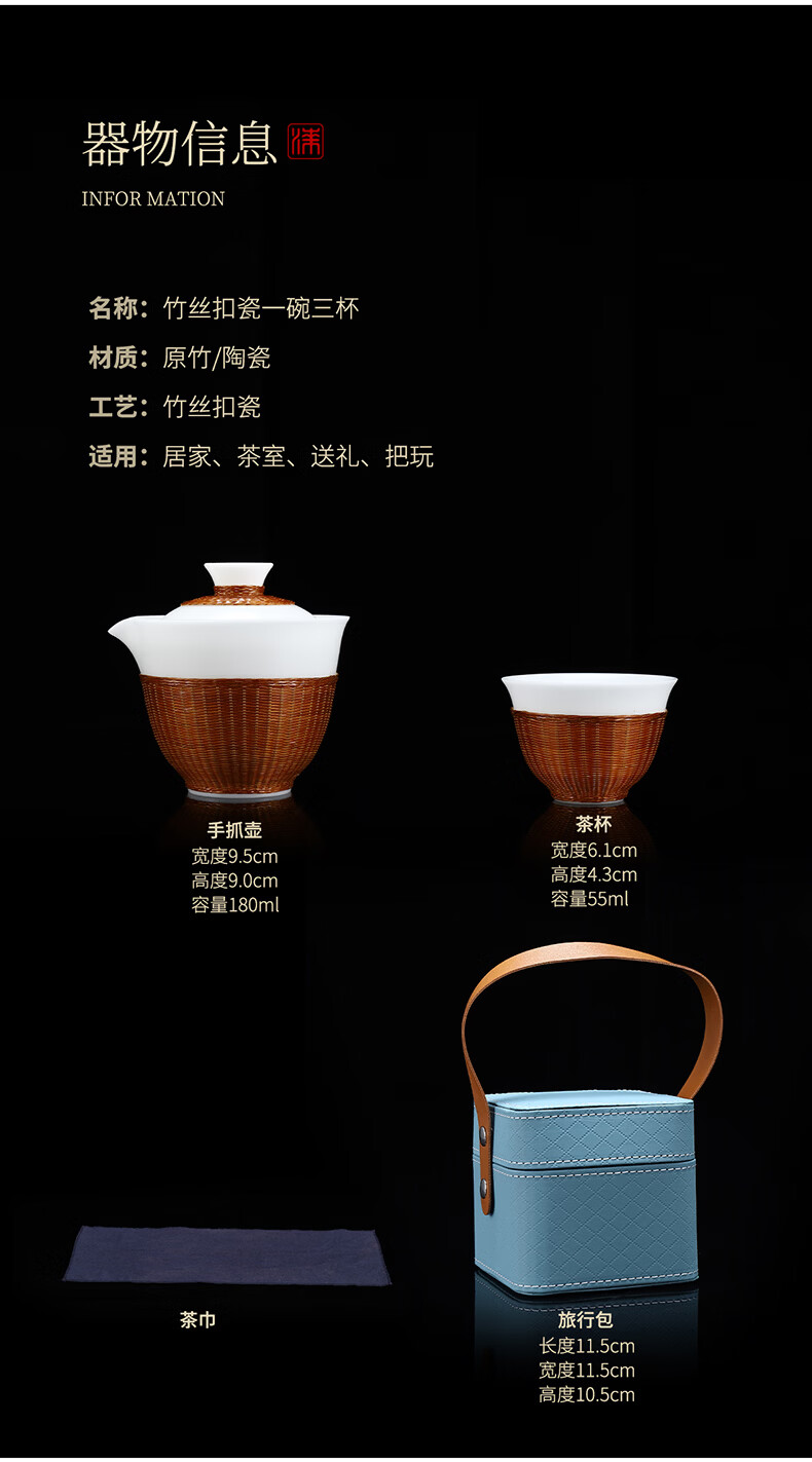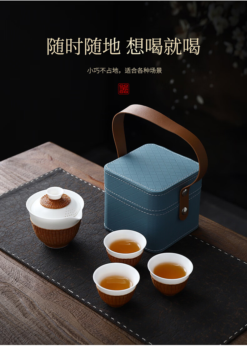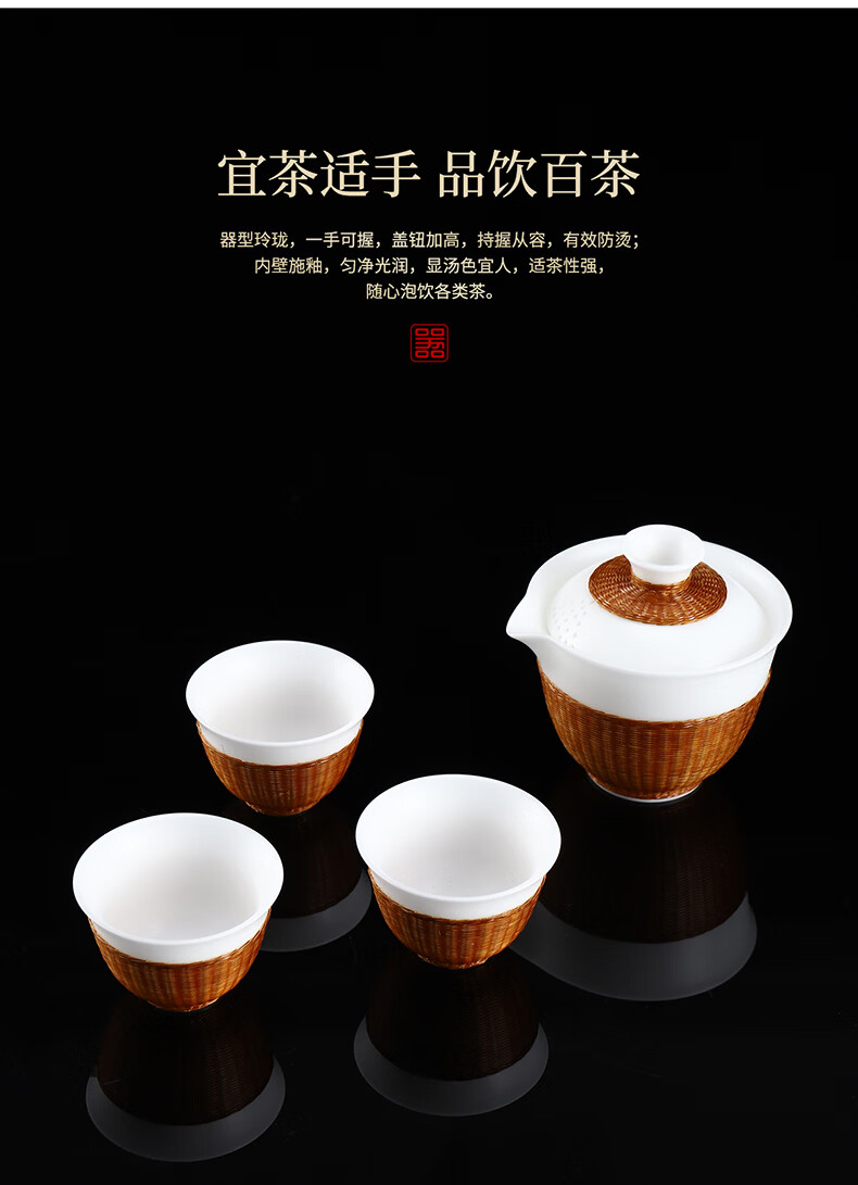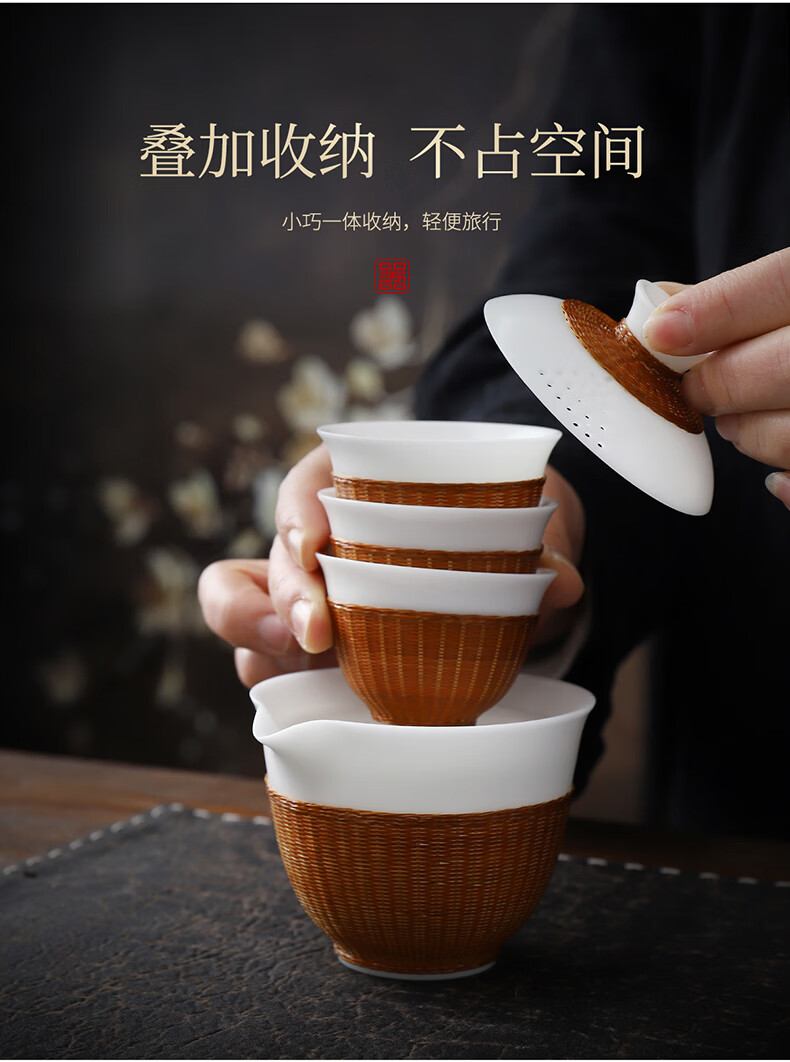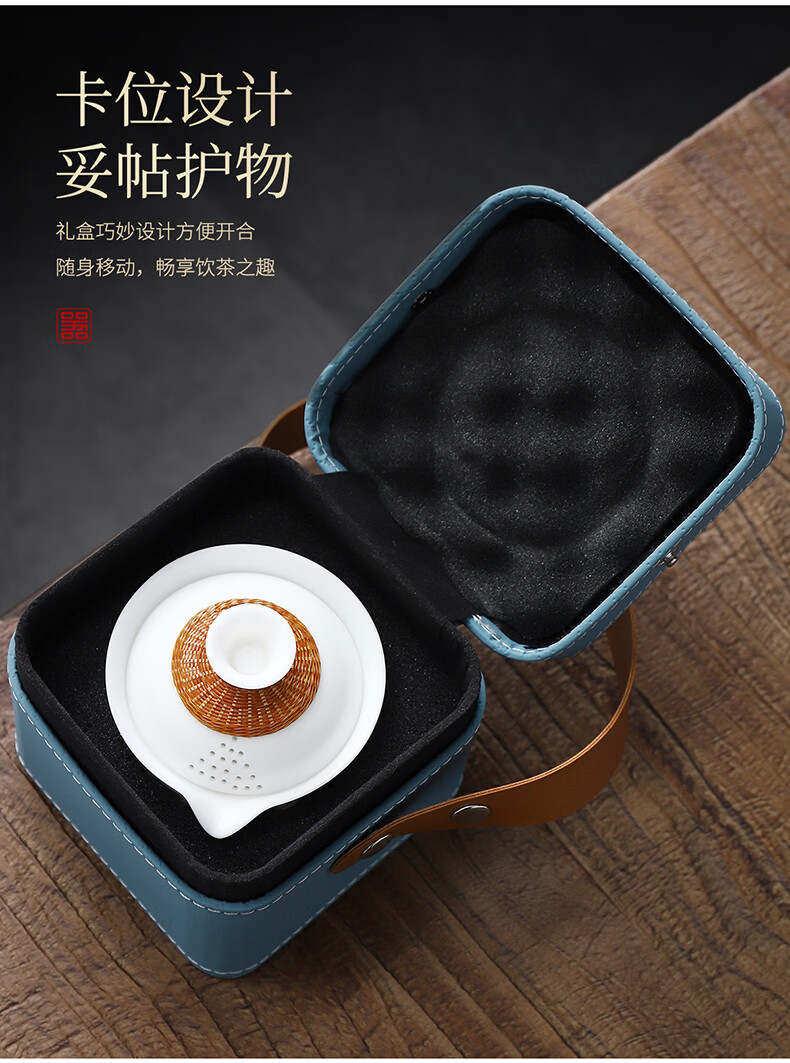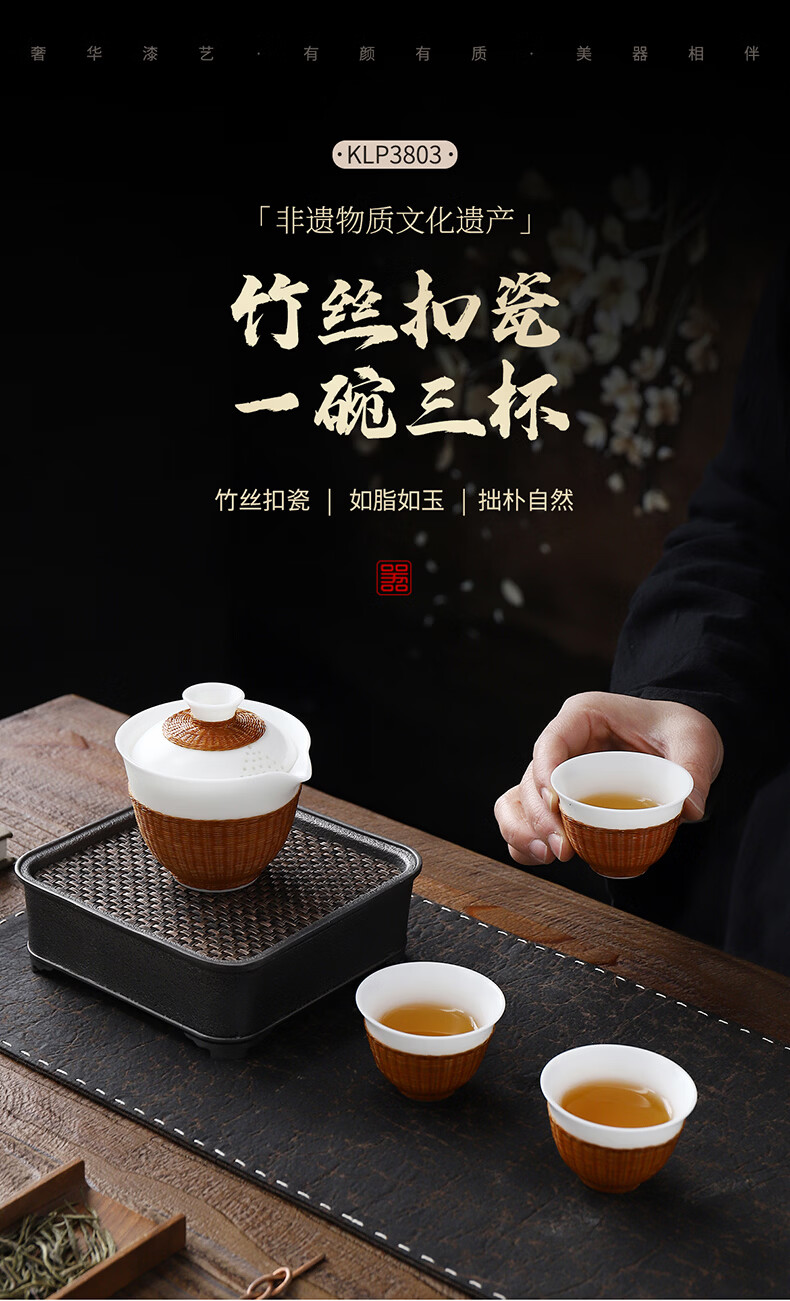 器美优品竹丝扣瓷旅行茶具便携式快客杯瓷胎竹编非遗手工四川特色商务送礼 竹丝扣瓷烤红旅行茶具一碗三杯