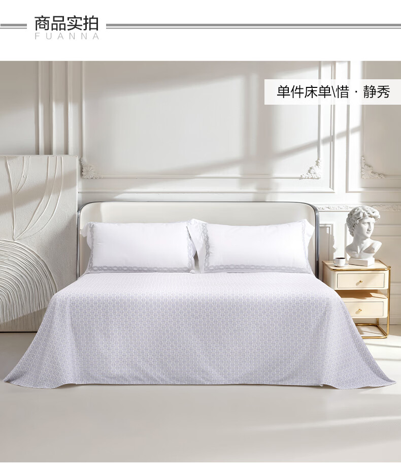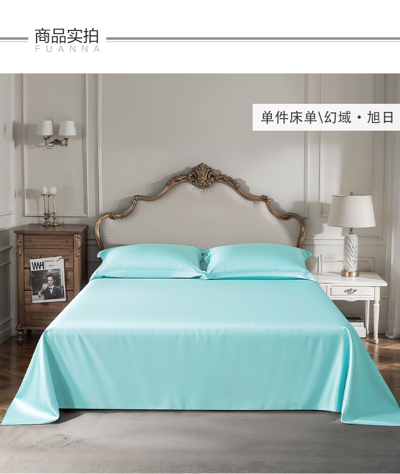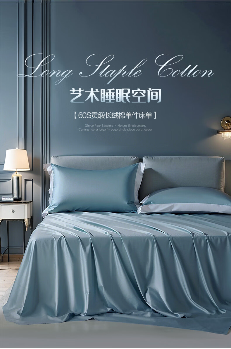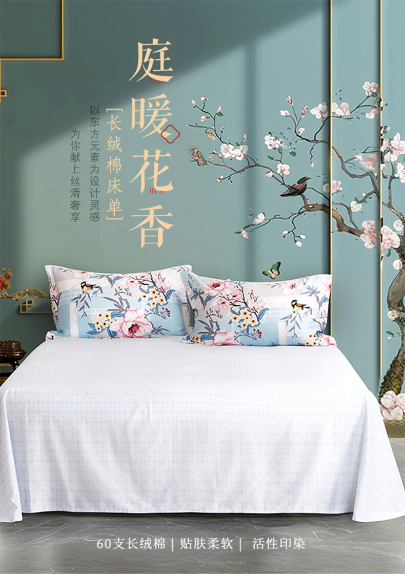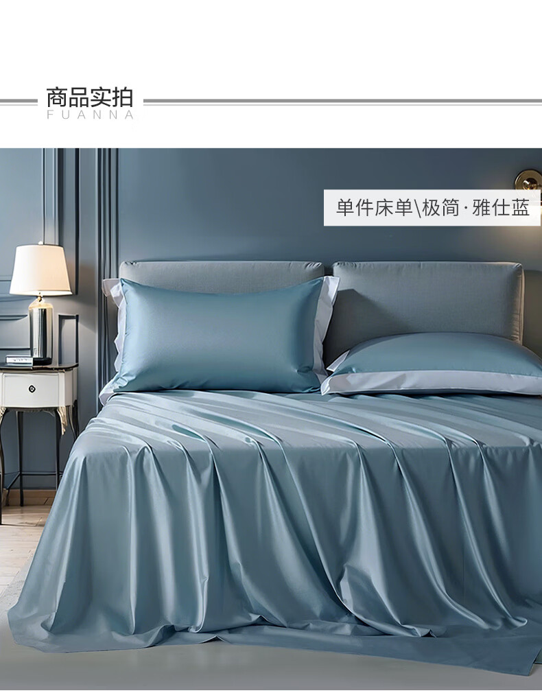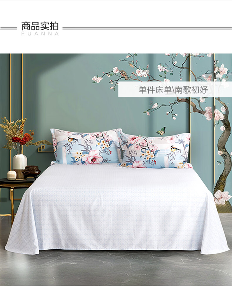 富安娜家纺60支长绒棉单件床单亲肤纯棉高支贡缎被单家用全棉床罩单件 【60支国风长绒棉】-初妤蓝 1.2米床适用 (180*240cm)