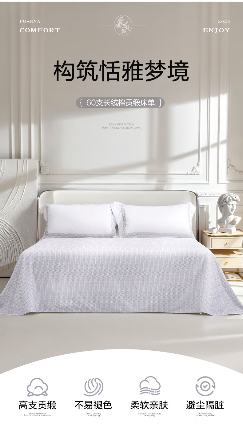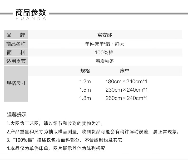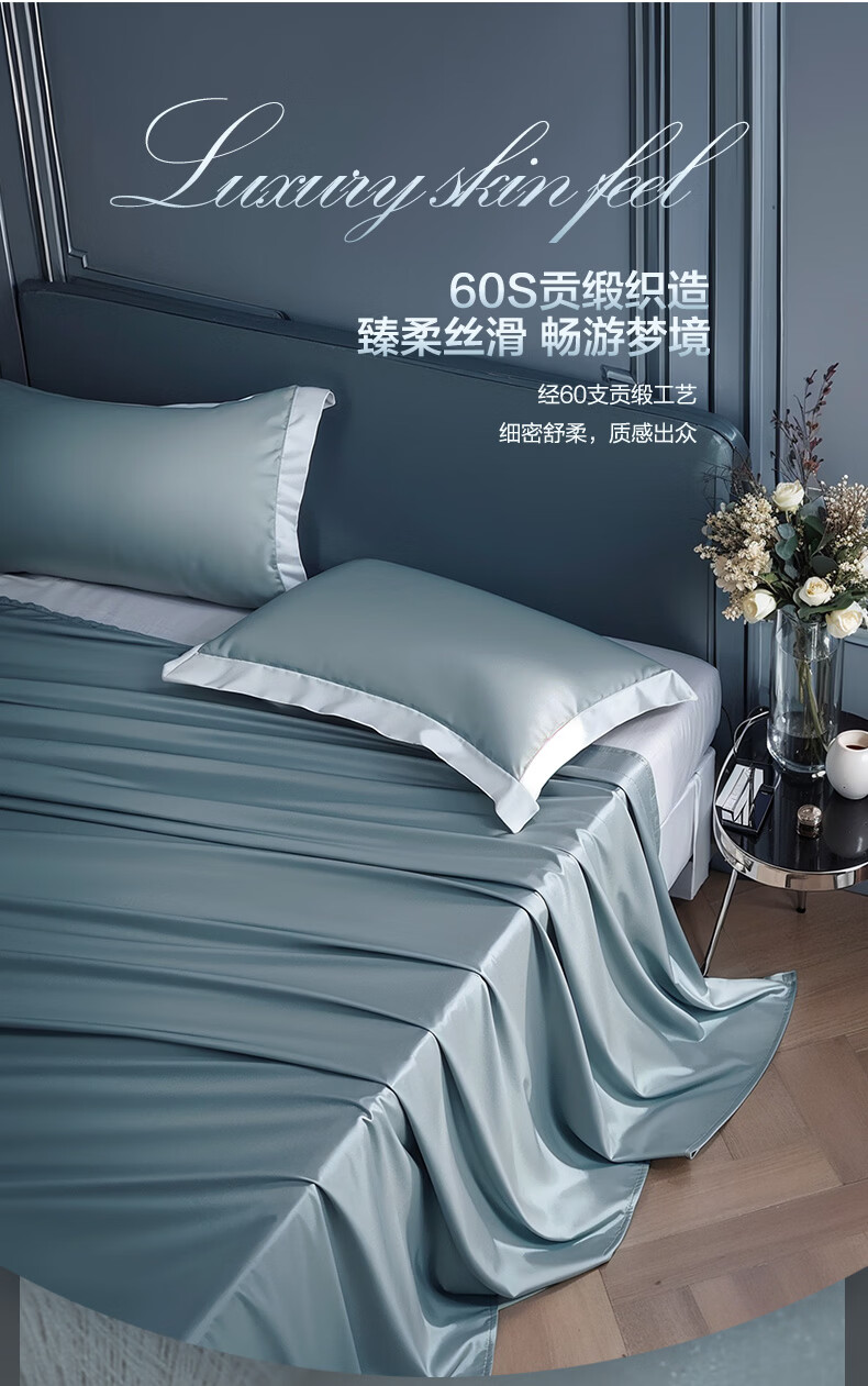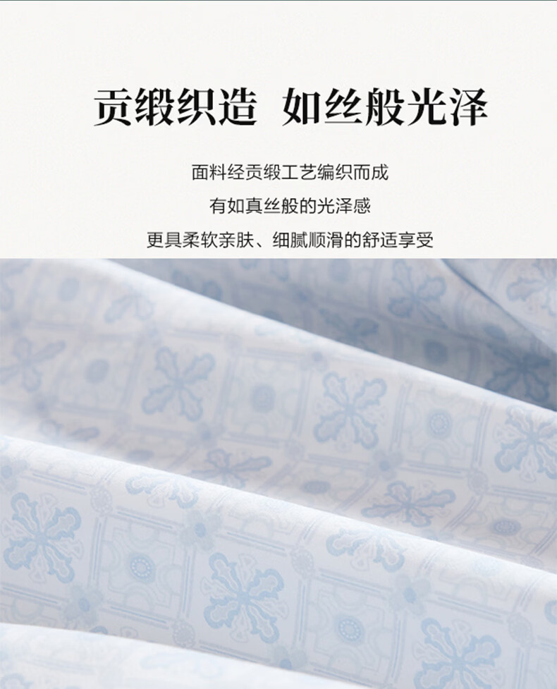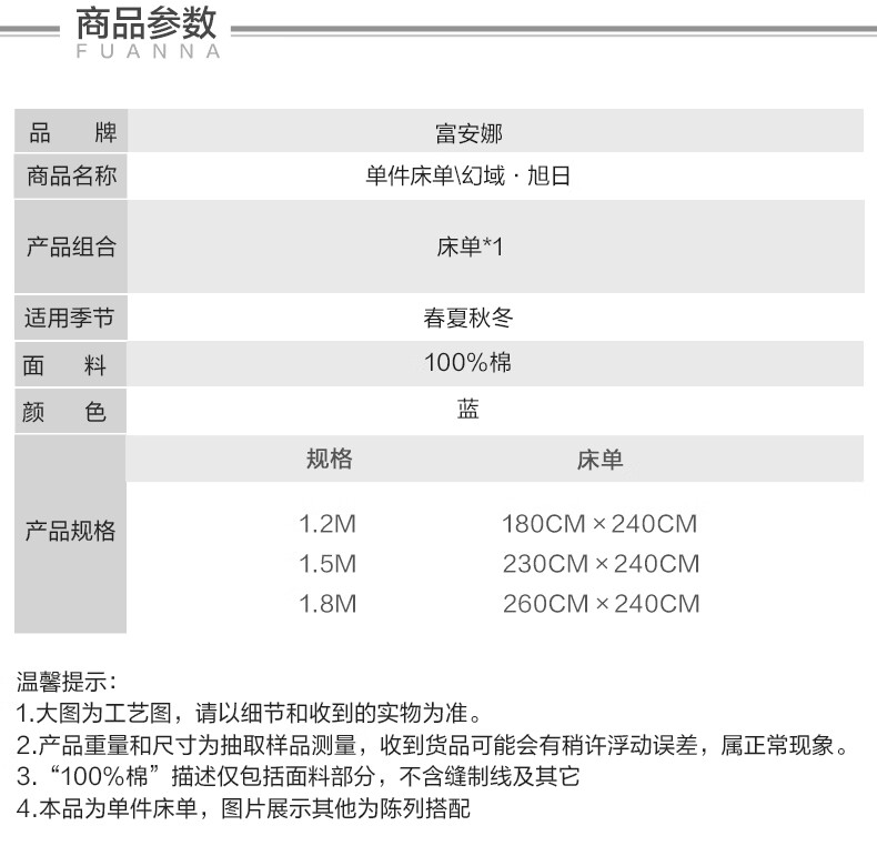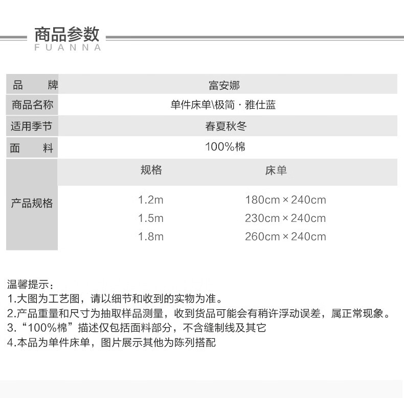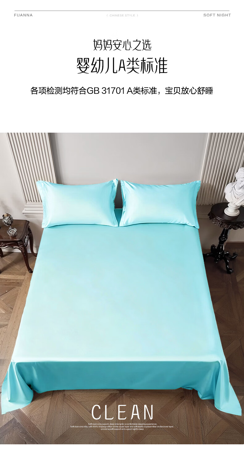 富安娜家纺60支长绒棉单件床单亲肤纯棉高支贡缎被单家用全棉床罩单件 【60支国风长绒棉】-初妤蓝 1.2米床适用 (180*240cm)