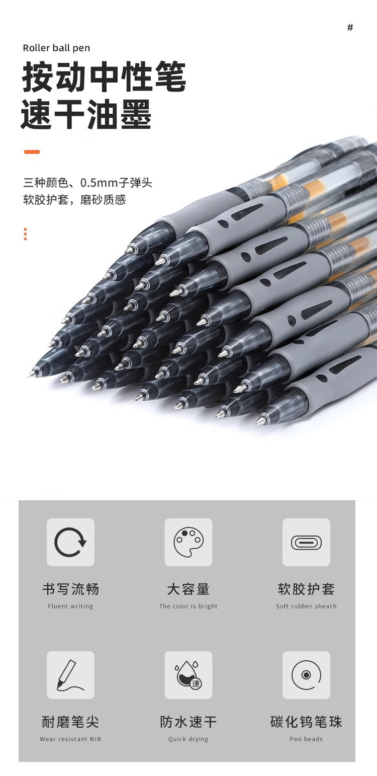 按动中性笔黑色碳素笔1008按动中性笔0.5m子弹头水性笔黑色碳素笔考试专用刷题签字笔 黑色3支+10笔芯 0.5mm