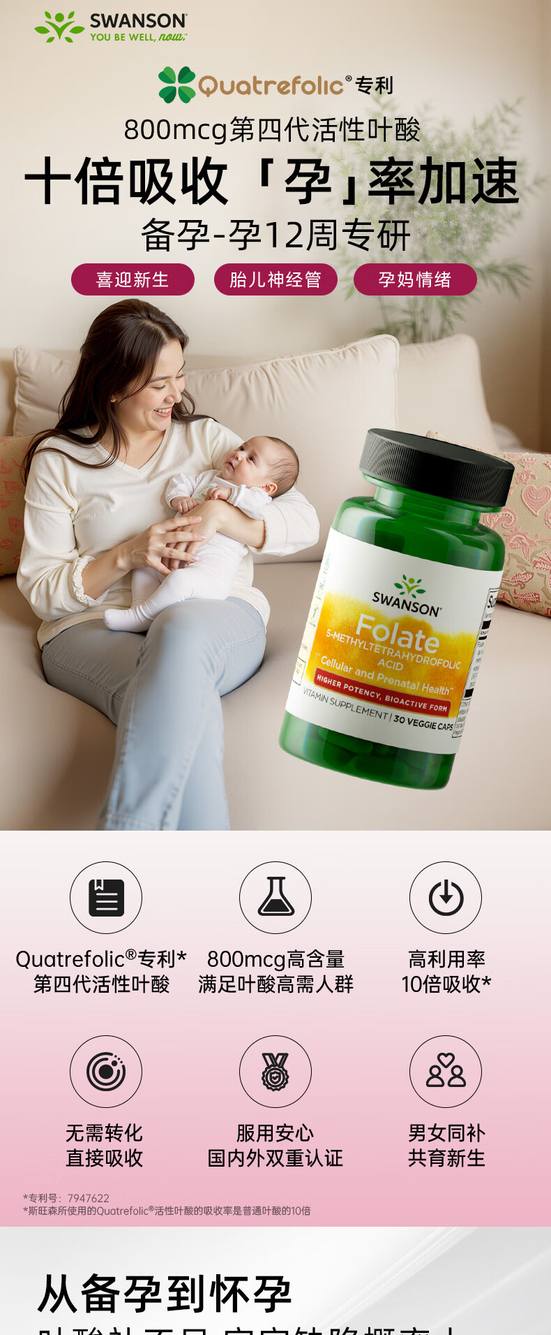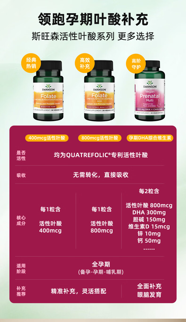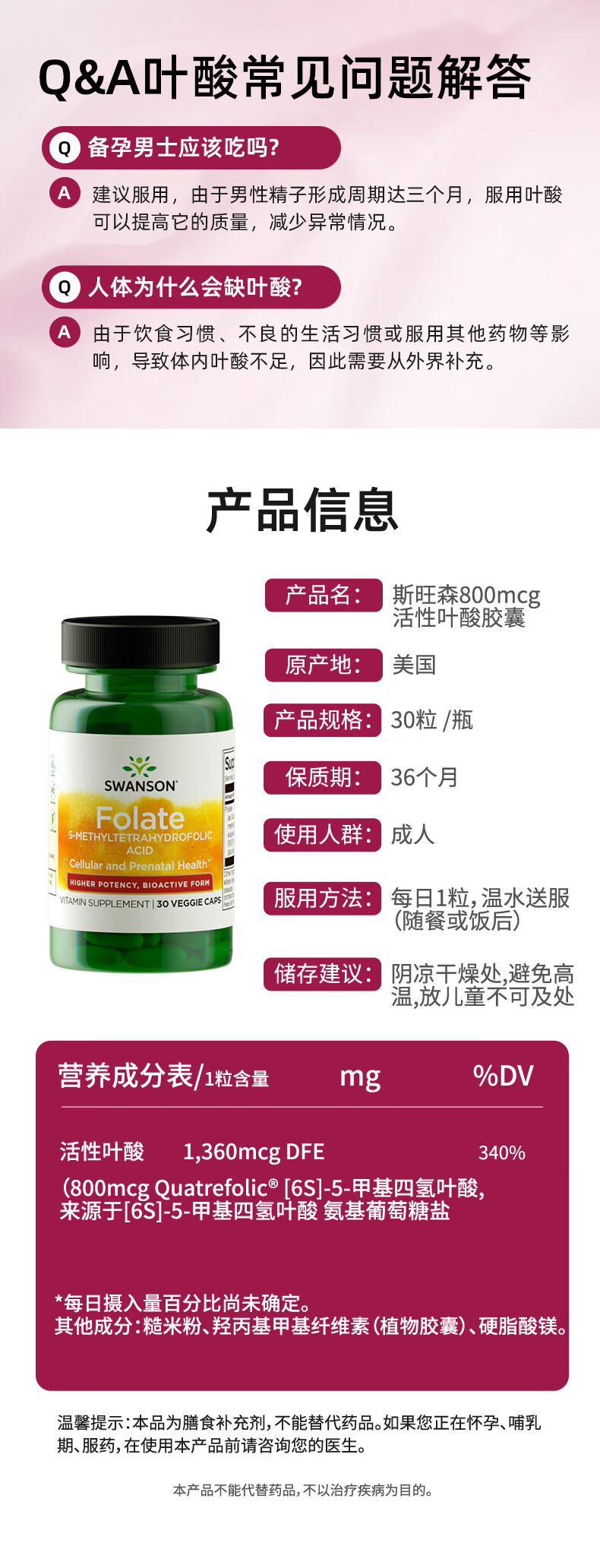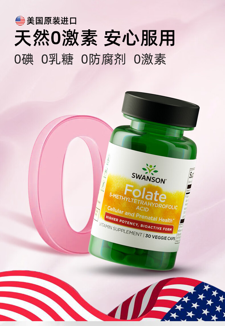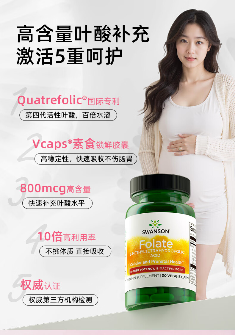 斯旺森(SWANSON)高活性叶酸800mcg30粒mini胶囊 男女士备孕孕妇CT/TT无碘专利配方