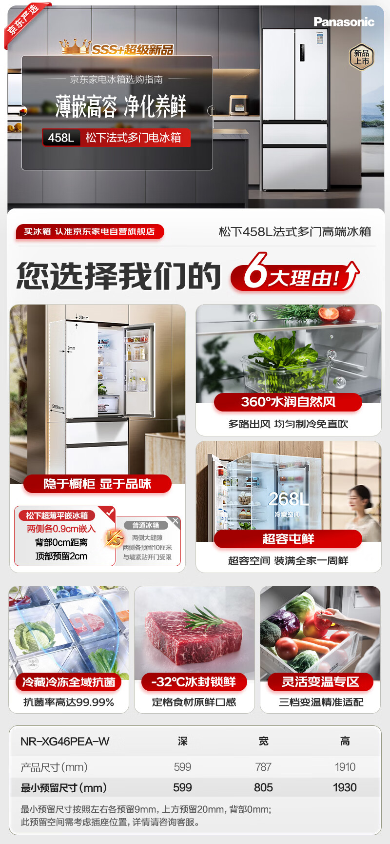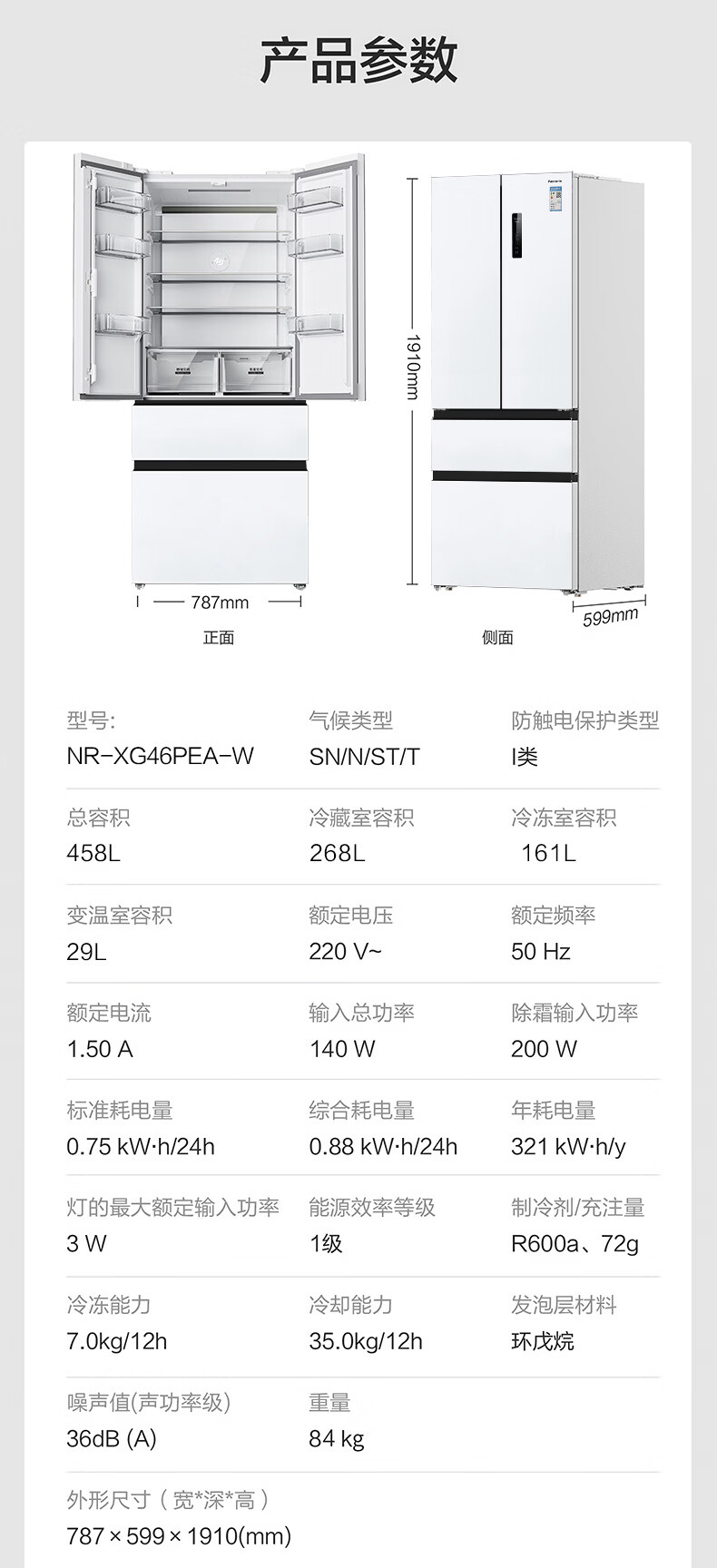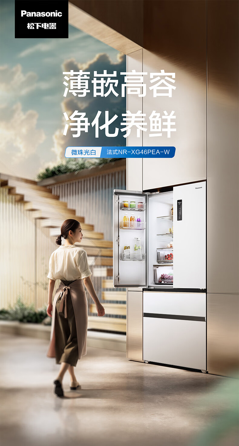 松下(Panasonic)雪墩墩458L法式多门冰箱超薄嵌入制冰银离子净味三挡变温一级能效风冷珠光白NR-XG46PEA-W以旧换新 【雪墩墩法式】小户型大容量