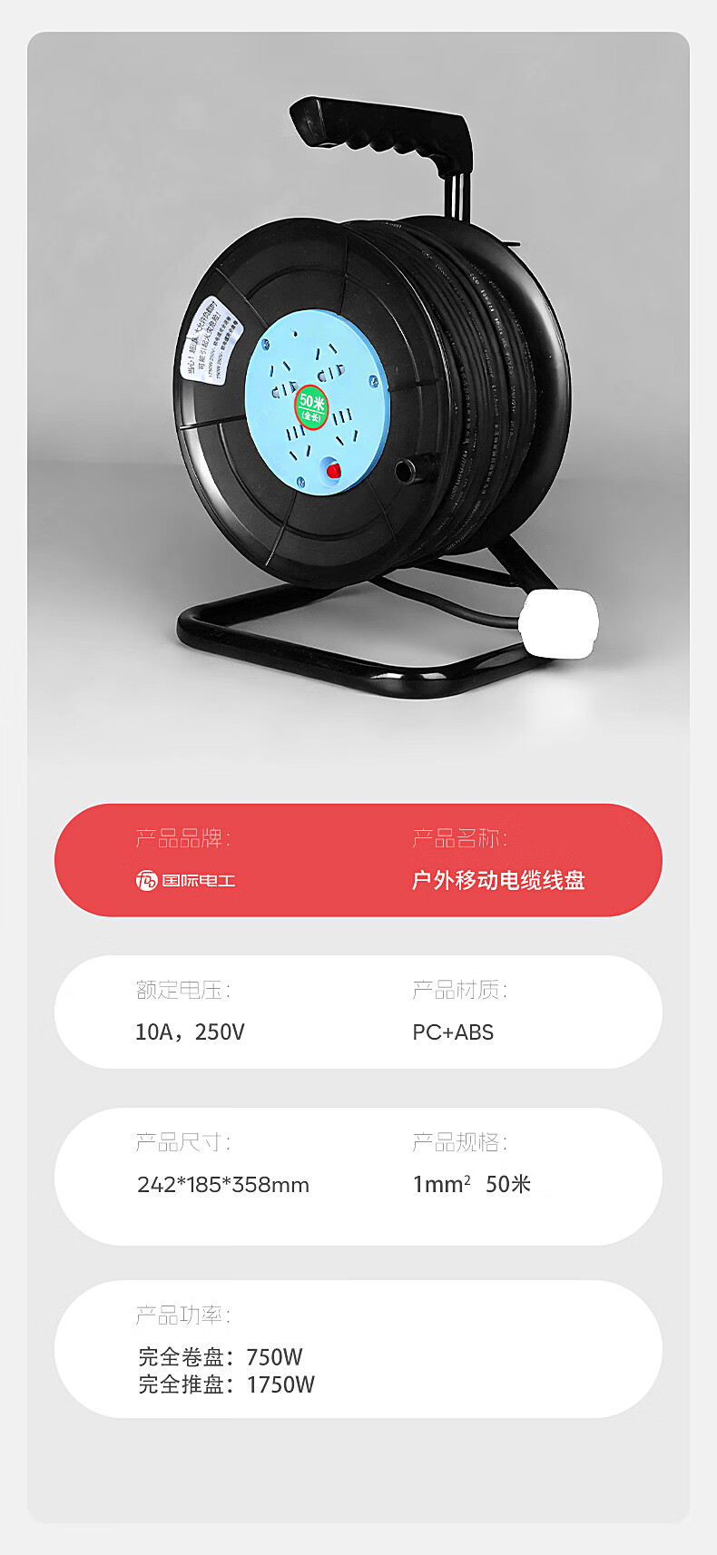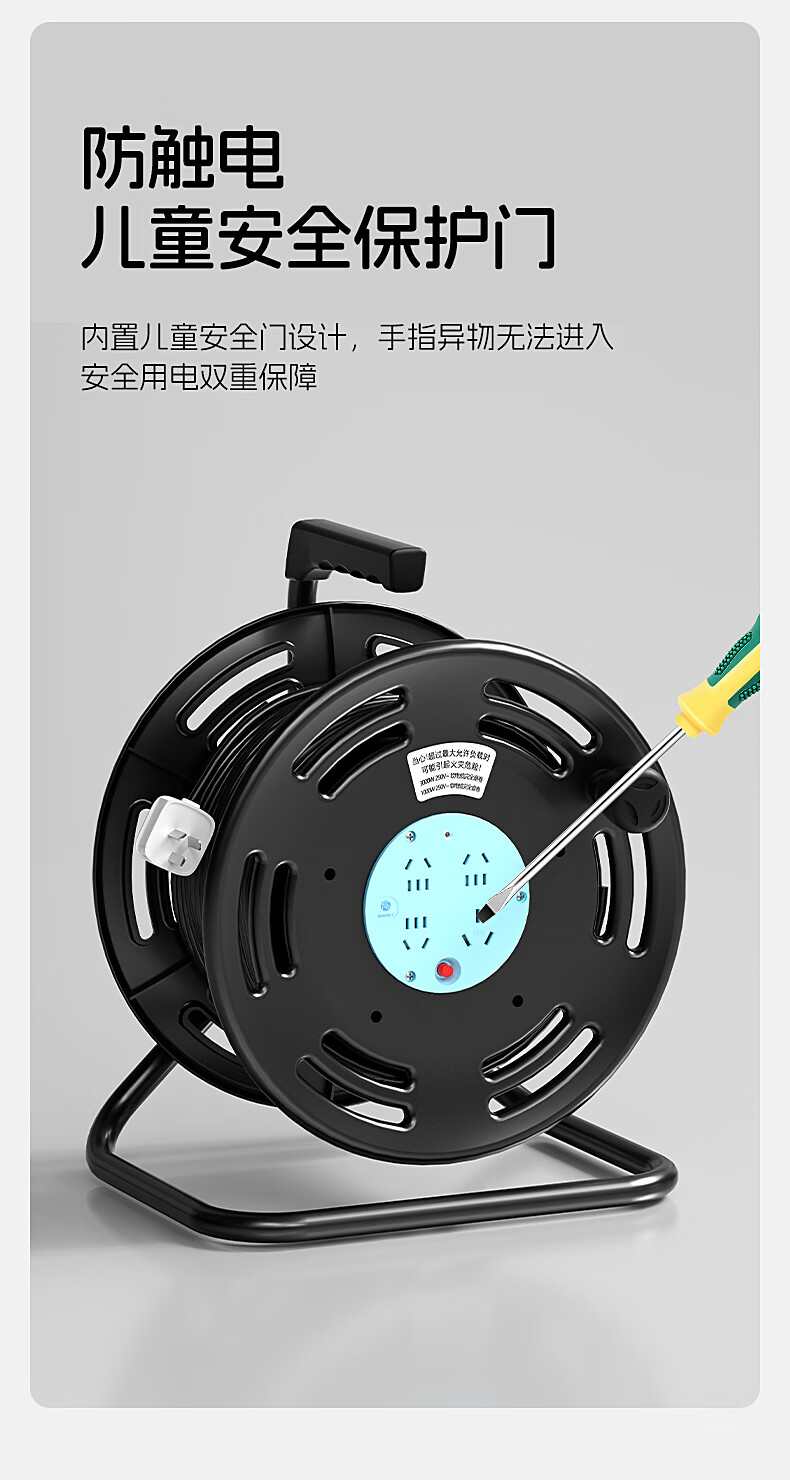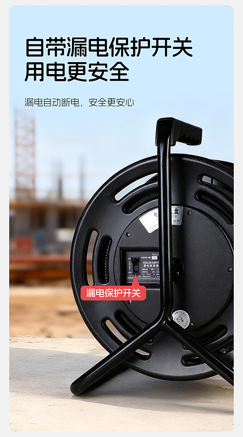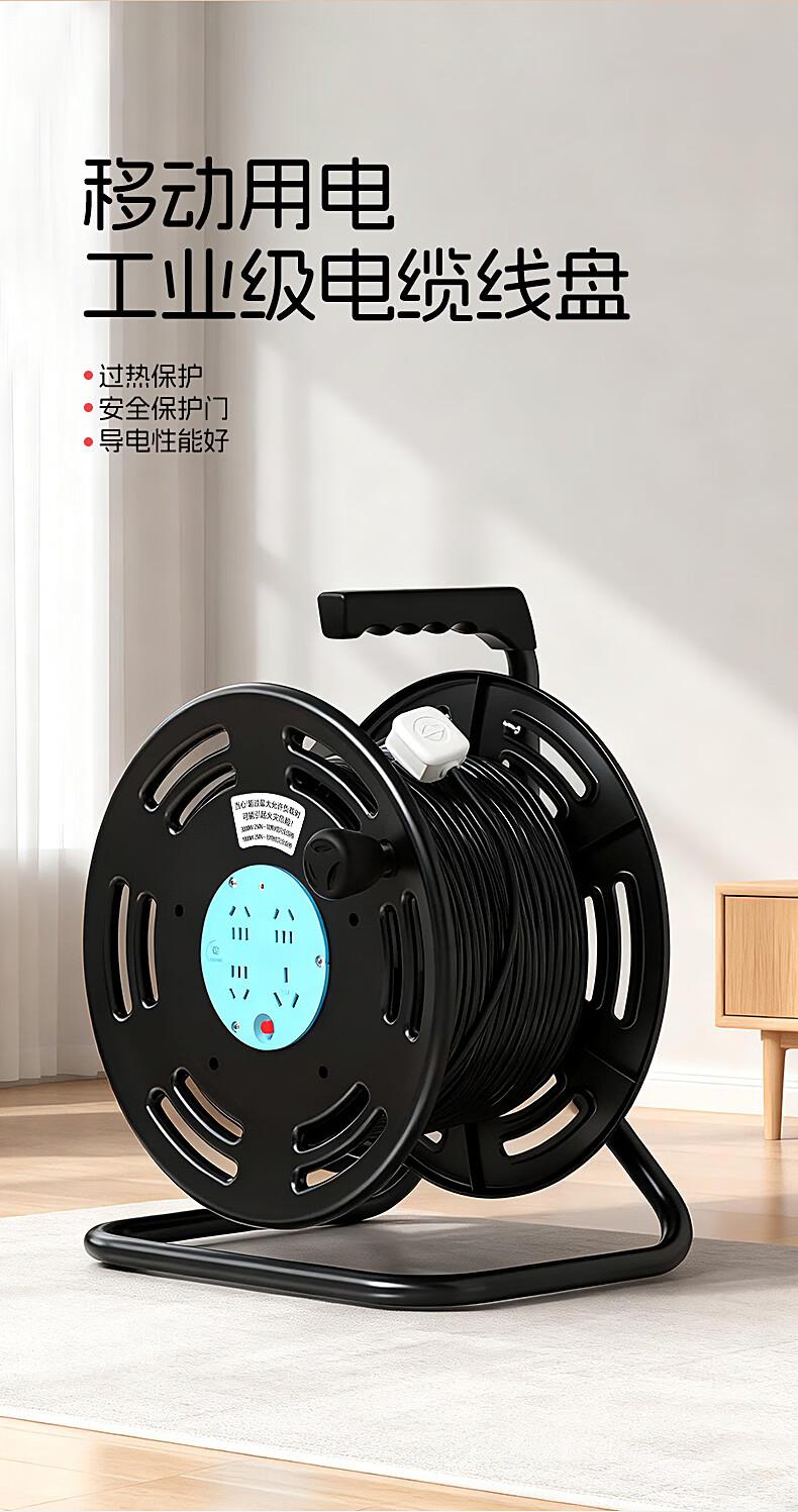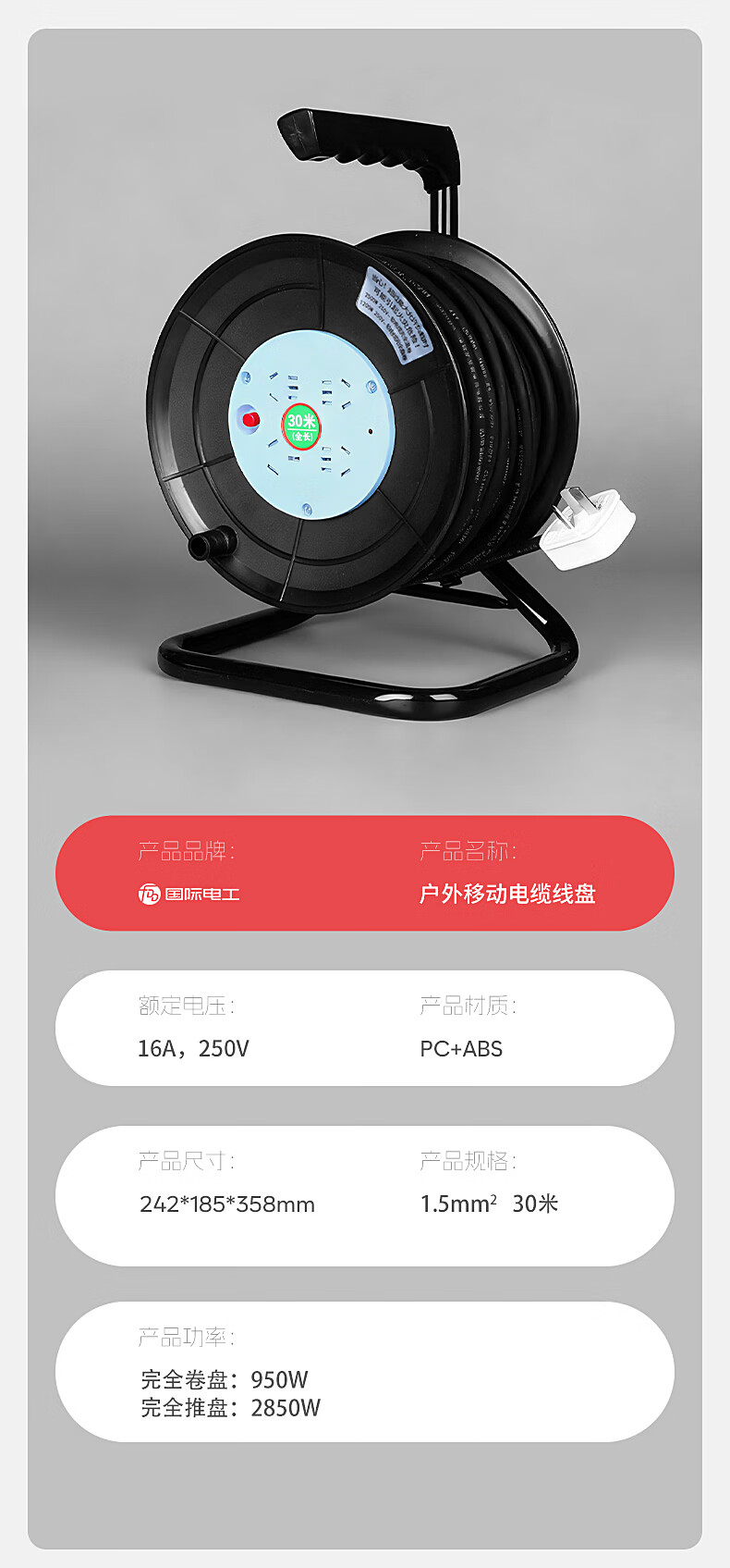 国际电工户外移动电缆卷线盘过热保护工程接线盘漏电过载保护插排卷线器 4位五孔国标插座 线盘带过载16A-3芯1.5平30米电缆线