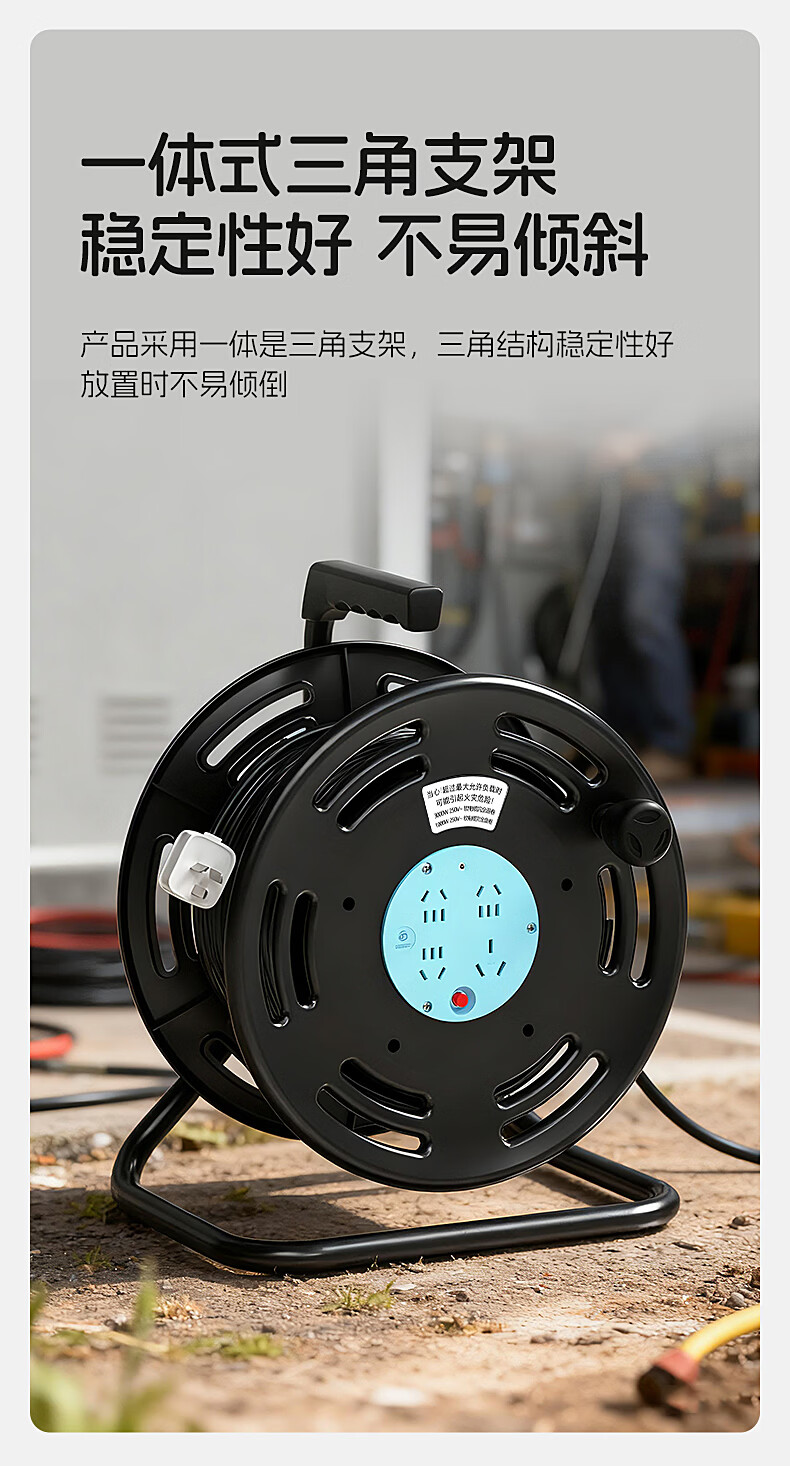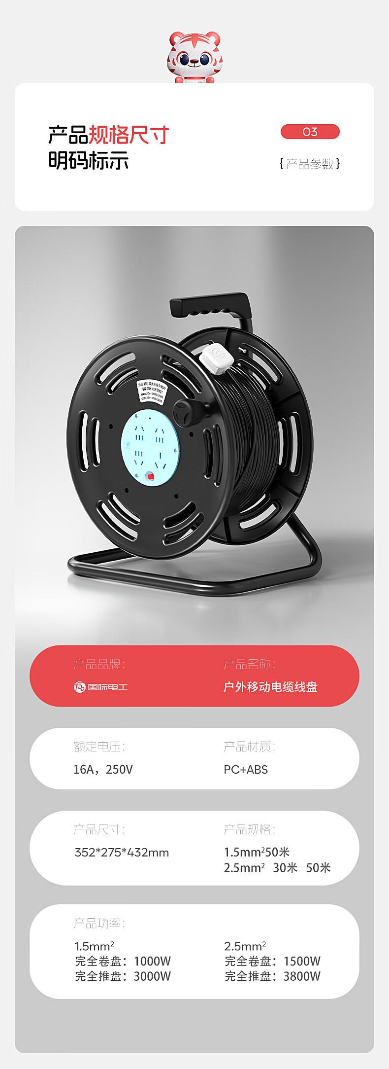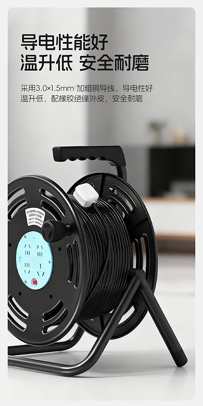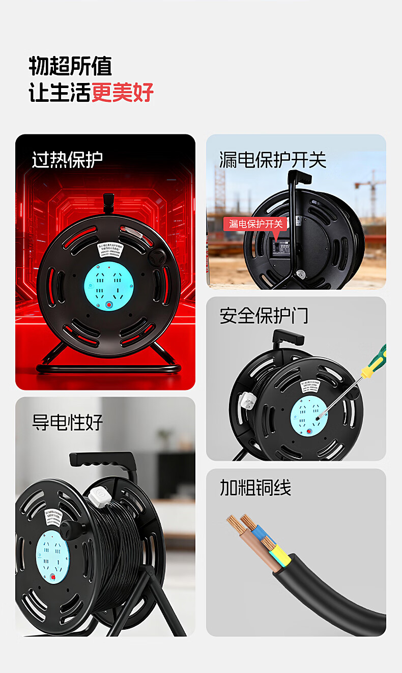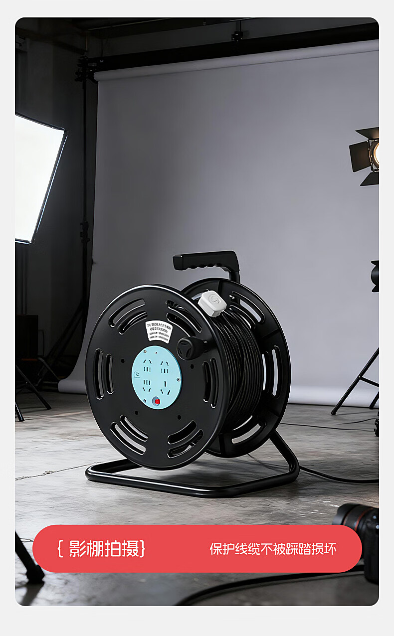 国际电工户外移动电缆卷线盘过热保护工程接线盘漏电过载保护插排卷线器 4位五孔国标插座 线盘带过载16A-3芯1.5平30米电缆线