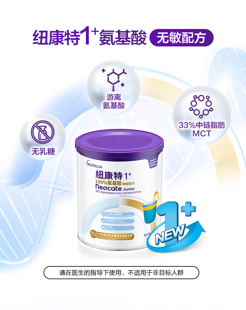 纽康特1+氨基酸配方粉 无乳糖无敏 牛奶蛋白或多种食物过敏儿童适用原味 纽康特1+ 400g*1罐 【100%氨基酸无敏配方】