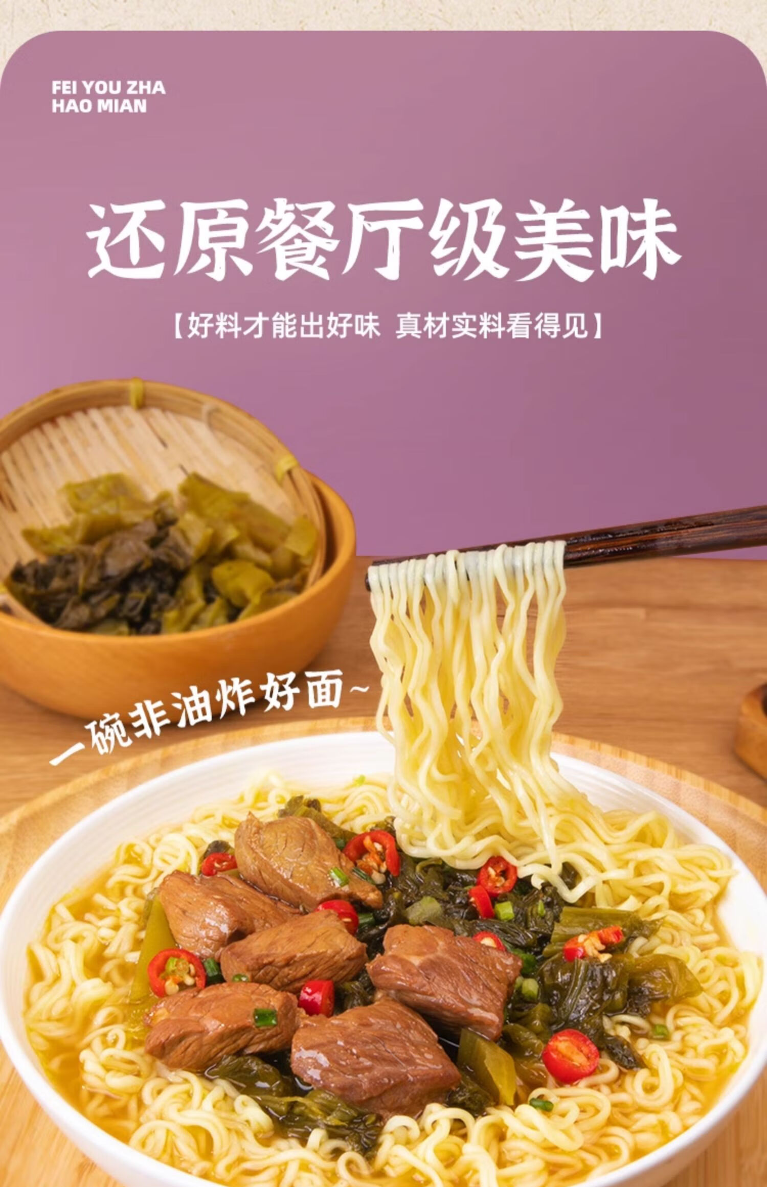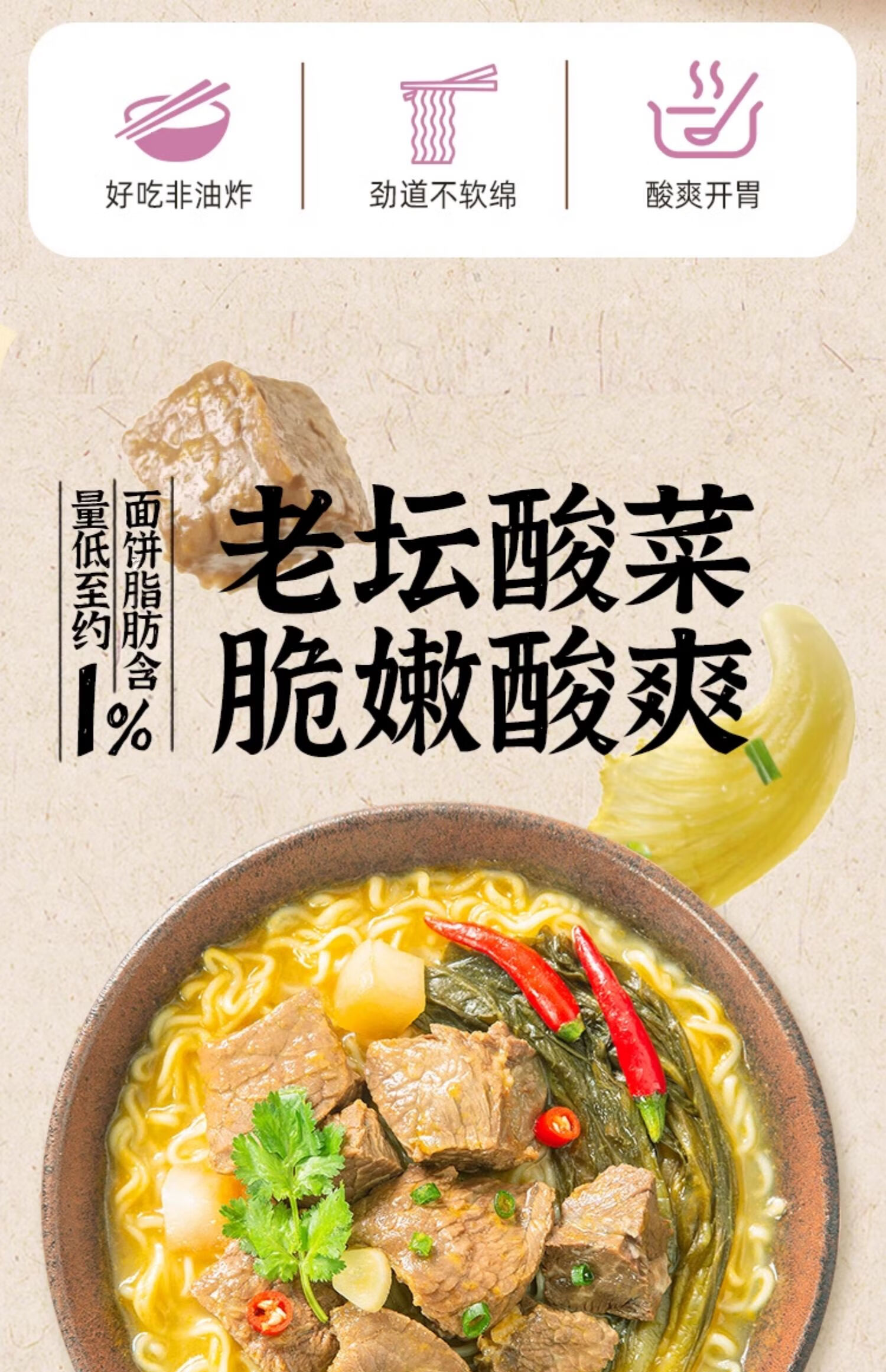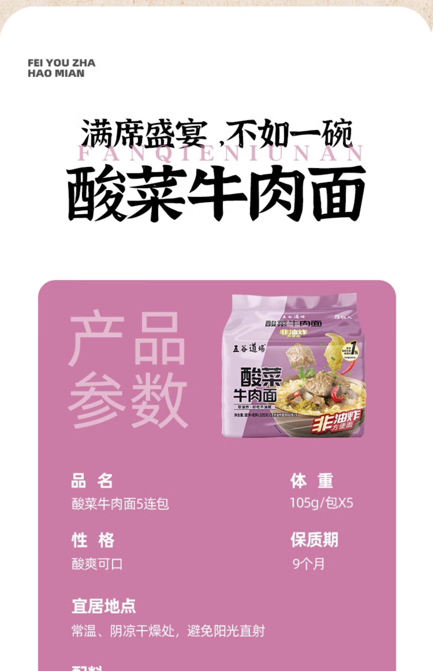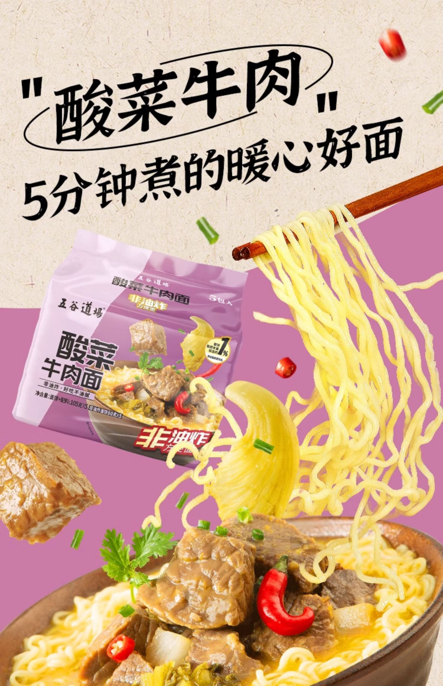五谷道場非油炸方便面 陆虎同款 经典酸菜牛肉面五连包105g*5袋 免煮泡面