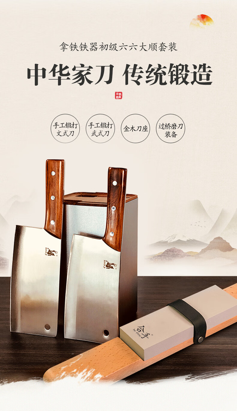 拿铁铁器手工锻打家用菜刀具合手可拍打专业级切菜刀切片刀砍骨刀 文武双刀(H2级)+磨刀装备+底座