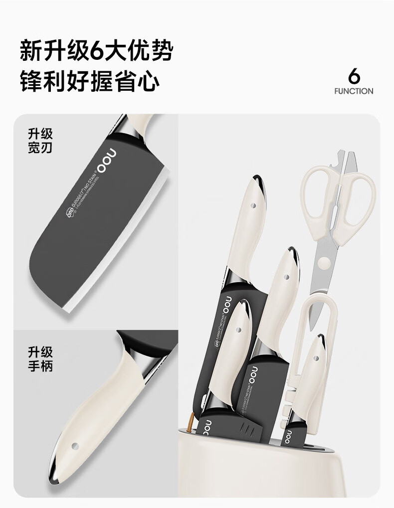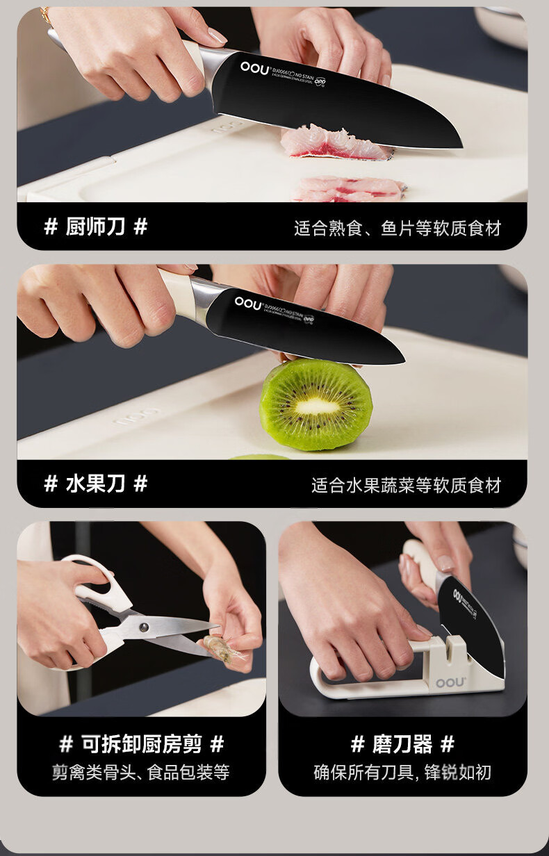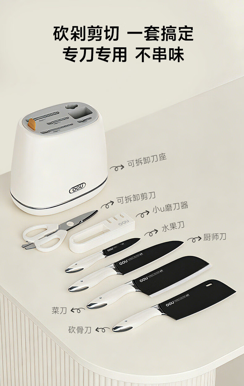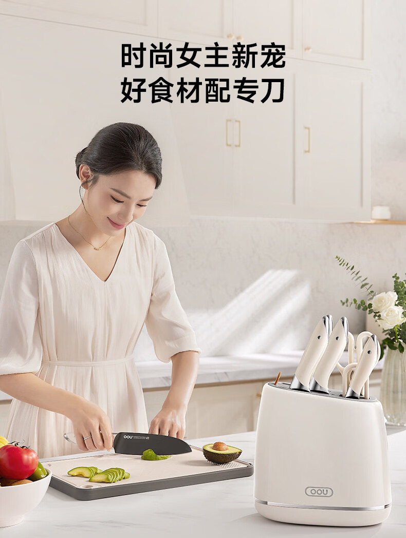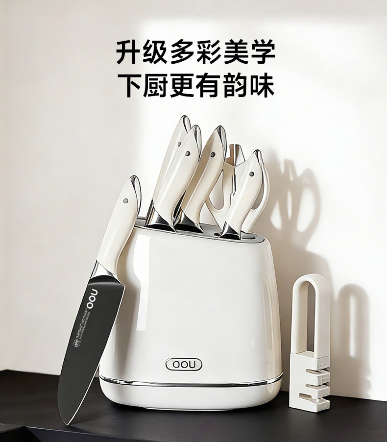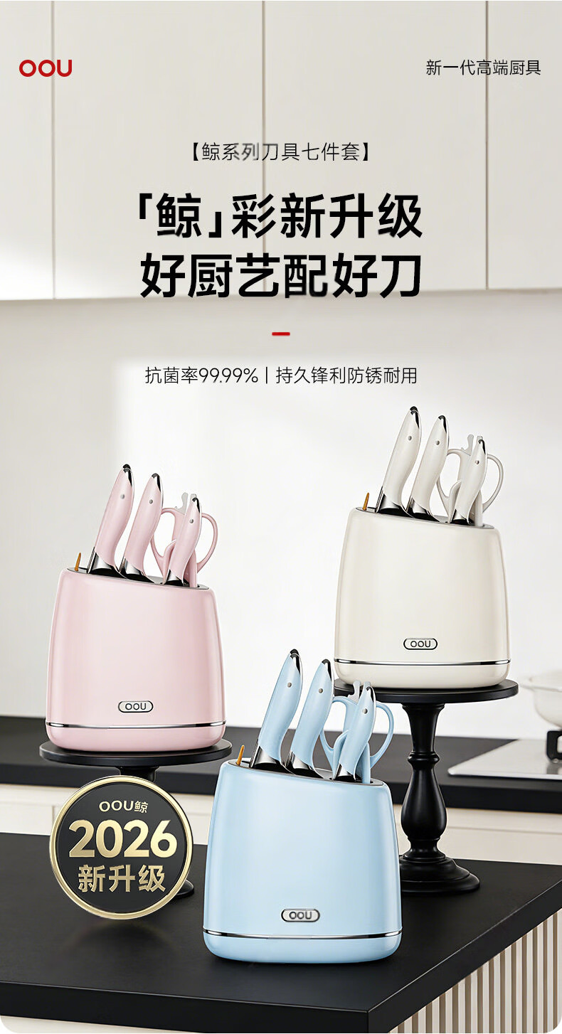 OOU刀具套装全套厨房切菜刀进口钢材专利抗菌技术黑鲸系列抗菌七件套白色