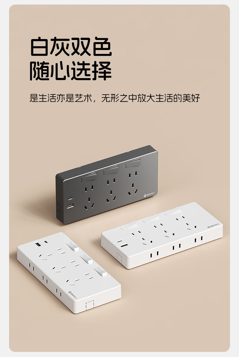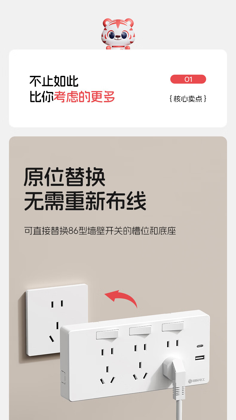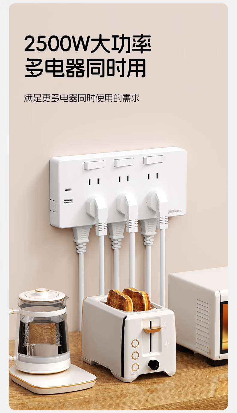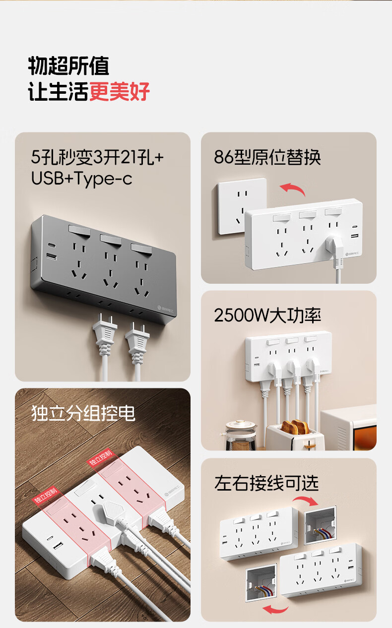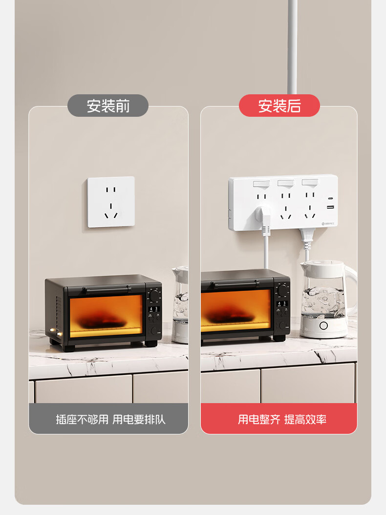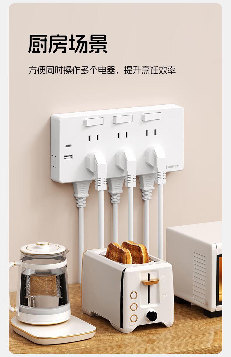 国际电工86型原位扩展插座家用厨房分控带开关排插多功能USB快充拓展插排 白色带USB-三开21孔-向左扩展(2.1A)